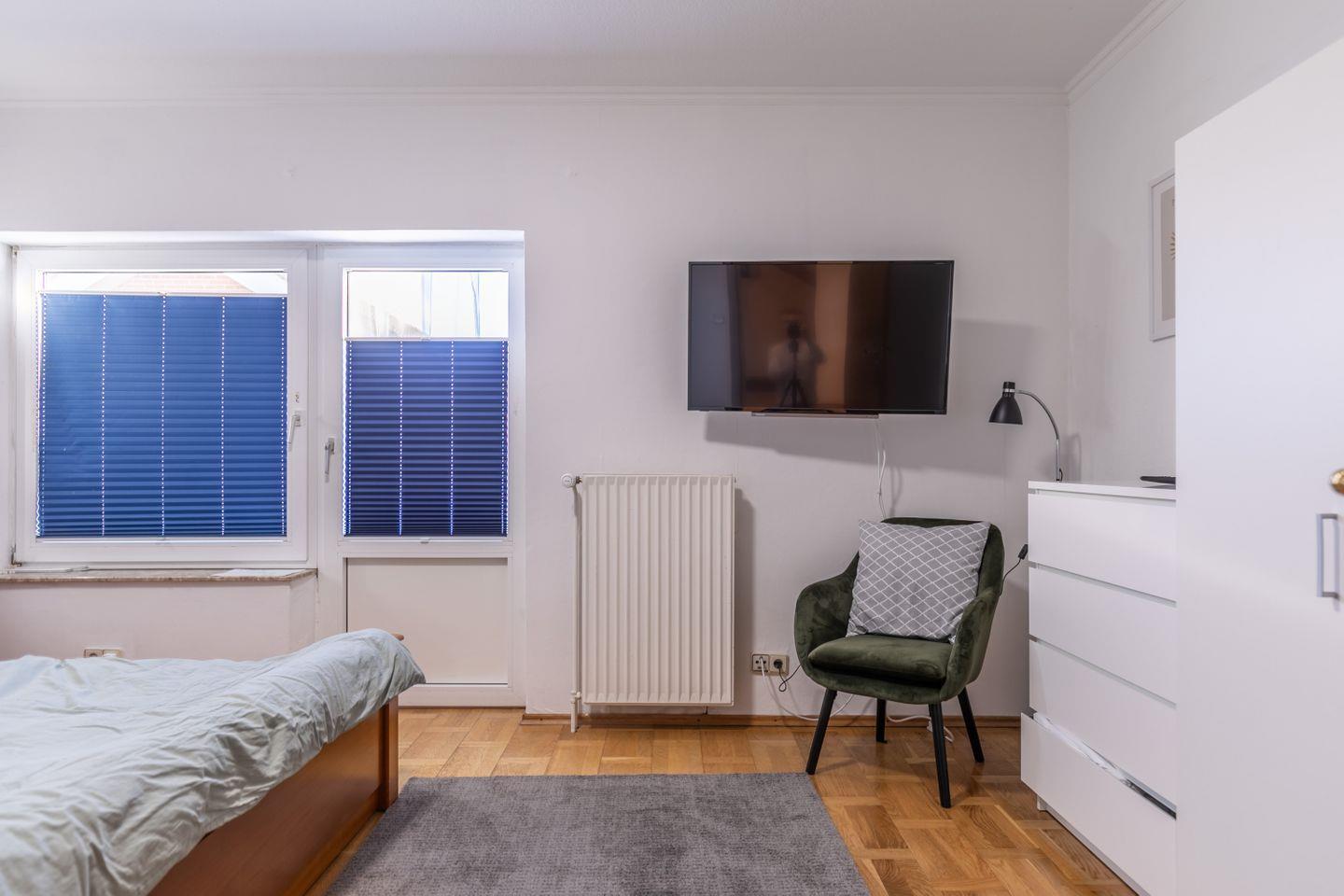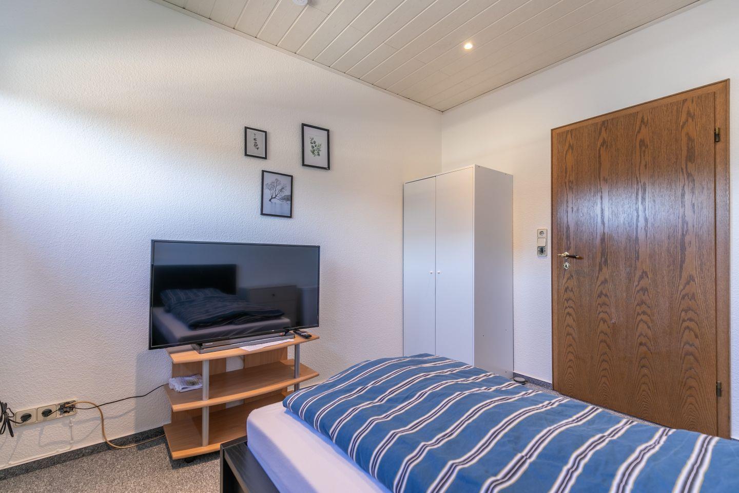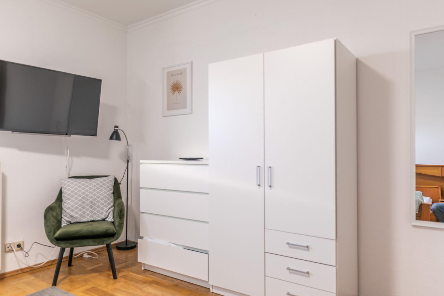 Bett, Flachbild-TV, Kleiderschrank, Kommode, Verdunkelungsmöglichkeit