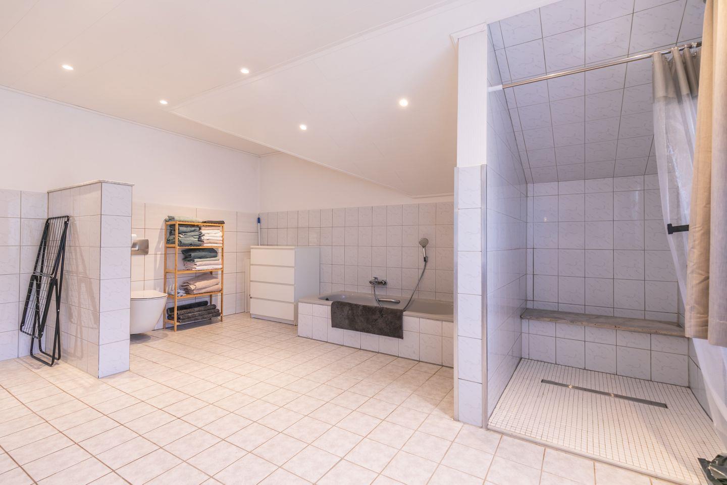 WC, Dusche, Badewanne, 2 Waschbecken, großer Spiegel, Waschmaschine, Fenster