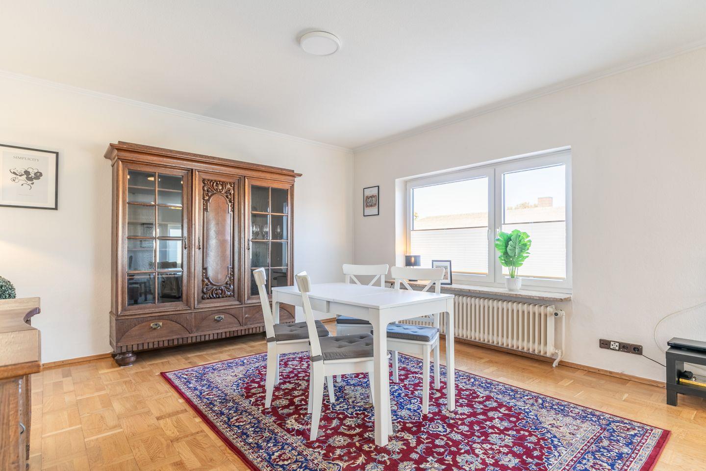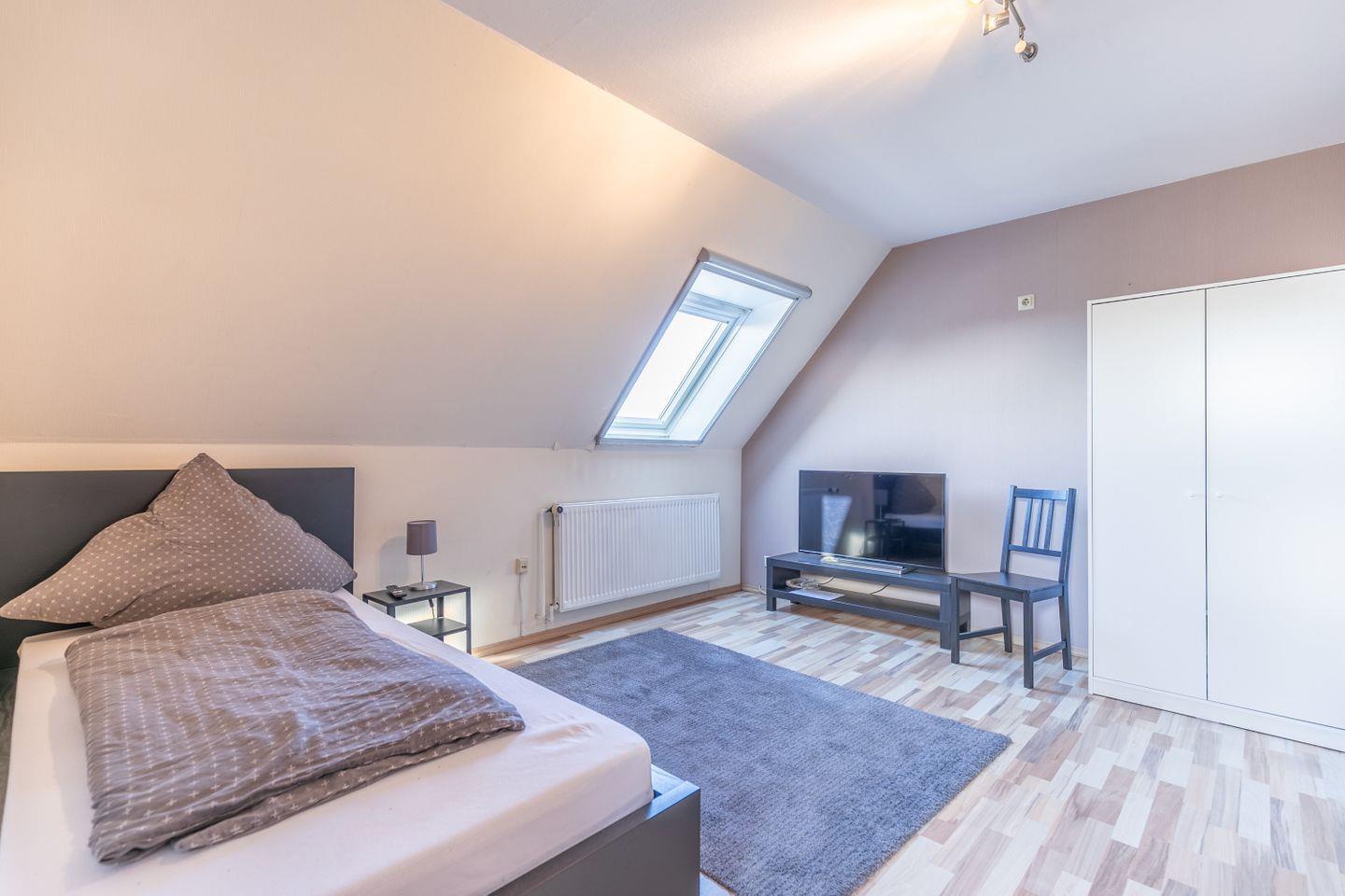 Die Wohnung befindet sich im 1. und 2. Obergeschoss, hat ein Bad, eine abgeschlossene sowie voll ausgtestatte Küche, ein Gäste-WC und 4 Schlafzimmer, jeweils mit Bett, Kleiderschrank, Flachbild-TV, teilweise mit Kommode und Herrendiener.