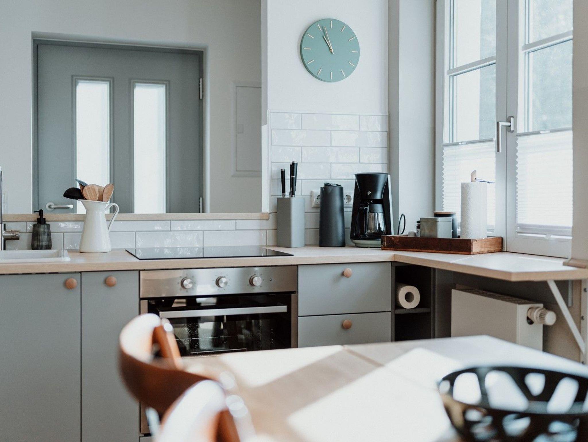 In der offenen Wohn-Küche kann auf einem 4-Feld Indusktionsherd gekocht werden. Spülmaschine, Kühlschrank mit kleinem Gefrierfach sind ebenfalls vorhanden.