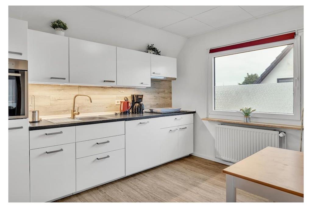 The spacious holiday home "Strandspaziergang" (Beach Walk) offers 145 square meters of living space for the whole family and is located in Maashom Bad in a quiet cul-de-sac. The ground floor features four bedrooms, two living rooms, and two bathrooms. The upper floor also has a bathroom with a shower, as well as two bedrooms and a spacious living/dining area with a balcony. The generous layout also provides a private retreat, as the ground floor includes two lockable apartments with direct access to the garden. The well-maintained garden invites you to relax and, on warm days, to barbecue and unwind. The perfect accommodation between the Baltic Sea and the Schlei fjord, which you can reach in an 8-minute walk. The property is also ideally situated for exploring our beautiful region by bicycle. The house is ideal for holidays with the whole family and friends, as it contains three separate apartments (Sonne, Möwe, and Boje). There is plenty of space for everyone, and your pet is welcome.