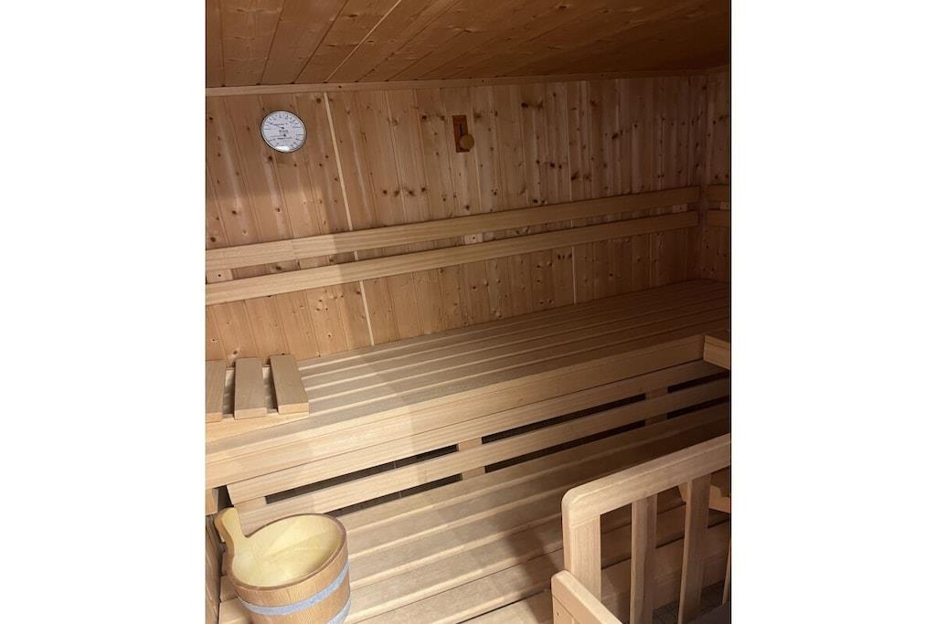 Vacuum Cleaner, Living room(Armchair, Sofa, library, fireplace), Kitchen(Kitchenette, dining table, hob, coffee machine, dishwasher, fridge), bedroom(Wardrobe, single bed, double bed), bedroom(Wardrobe, single bed, double bed), bathroom(Mirror, toilet, bath tub, shower, washbasin), bathroom(Mirror, toilet, bath tub, shower, washbasin), relaxation area(sauna), carport, Internet access, washing machine, heating, garden(Lawn, garden furniture), parking