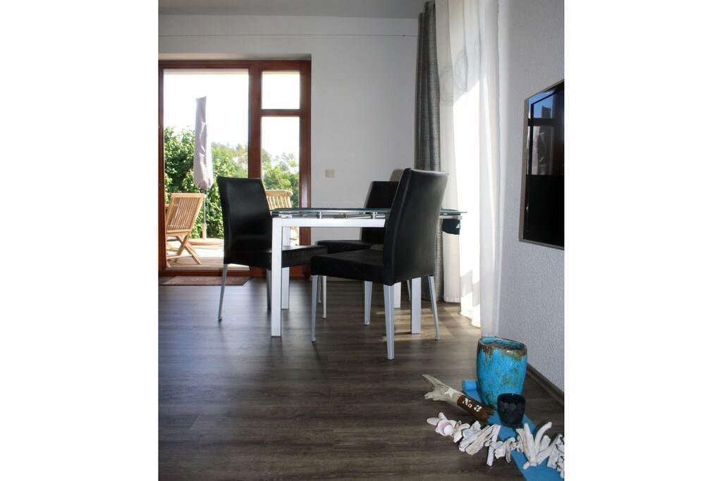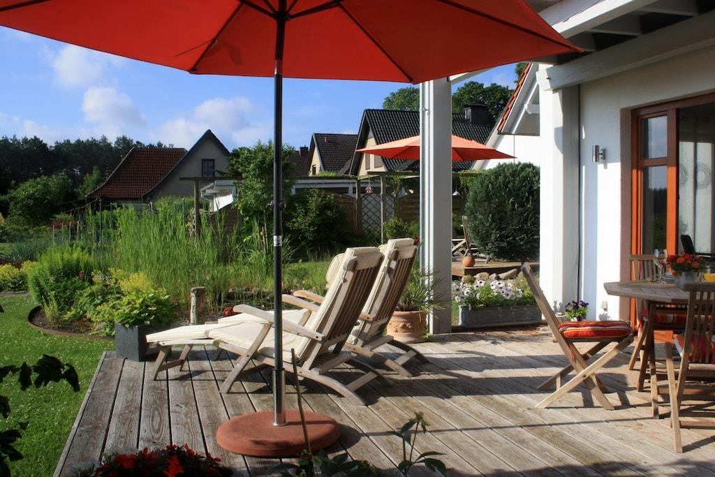 Modern design, soothing color design and specially manufactured pictures create a feel -good climate in which you immediately arrive and feel at home. The apartment in a quiet outskirts of Malchow has its own parking space, terrace and entrance. With the large terrace it is geared towards the garden and the meadows. The high -quality furniture with appealing equipment offers all amenities of modern living for 2 adults. The garden area with loungers and pond facilities invites you to linger. In the back of the garden there is a beach chair, where you can relax and let your gaze wander. A high-quality call bed ensures quiet sleep.