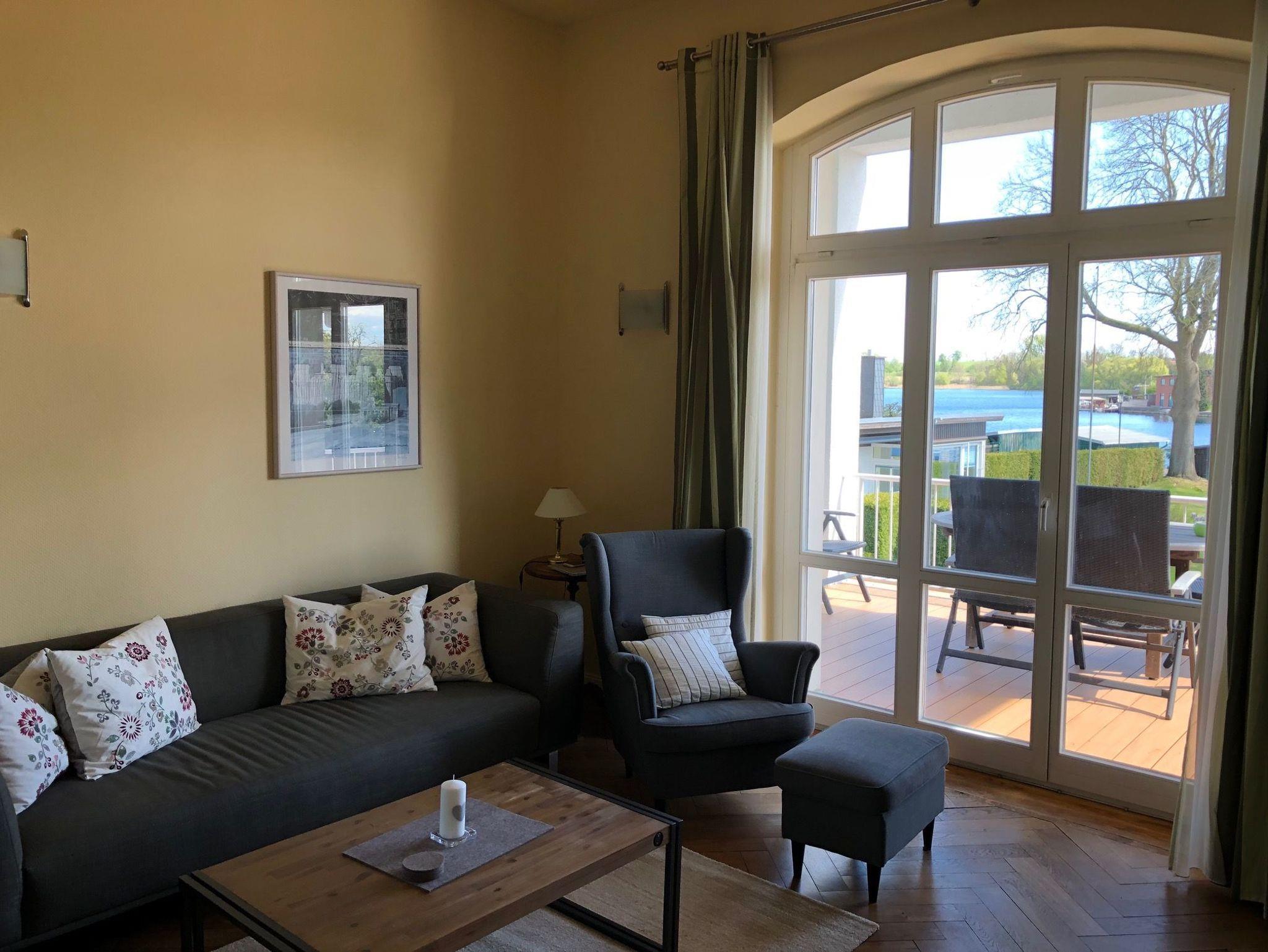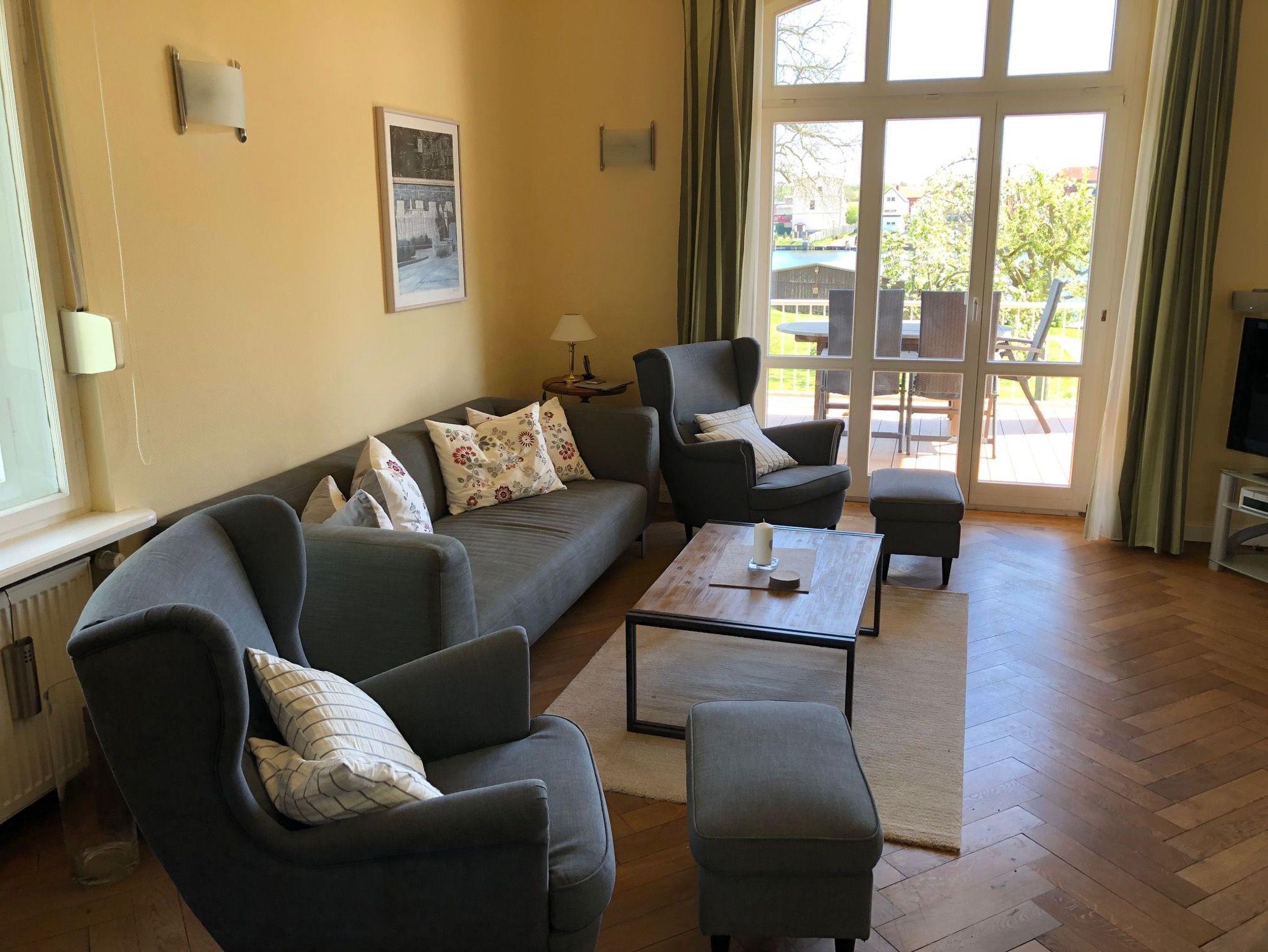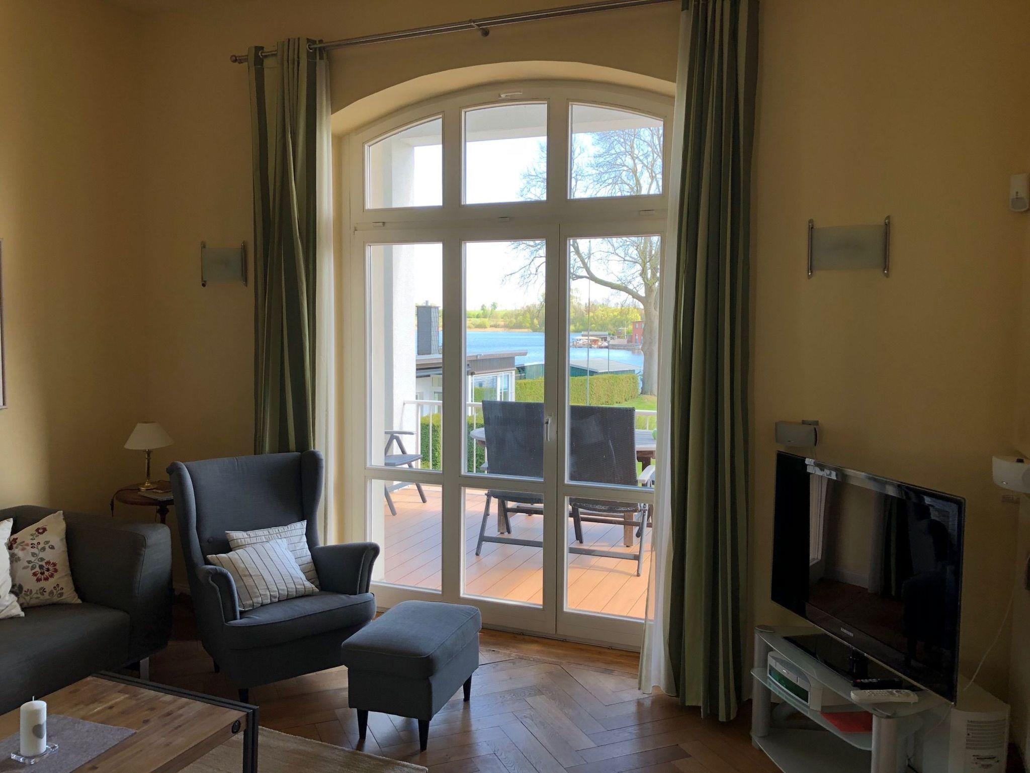 Eine großzügige Wohnküche und zusätzlichem Kachelofen, Diele, separates Gäste-WC, Bad mit Wanne und Dusche, Waschmaschine, Trockner, 2 Schlafzimmer, Lesesalon und Wohnzimmer mit Kamin und Blick auf den Malchower See und das gepflegte Anwesen der Villa Blanck runden das Ambiente angenehm ab.