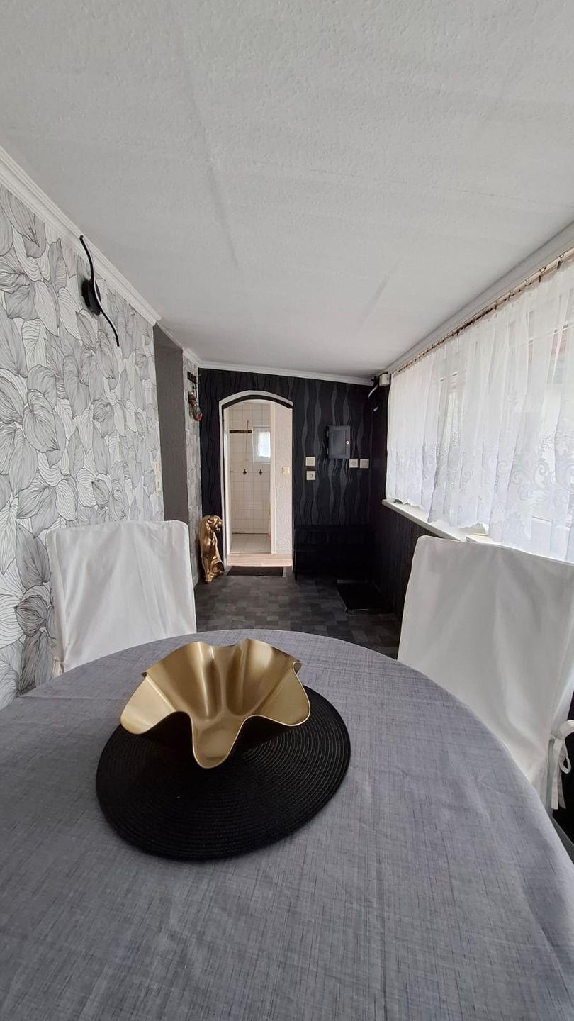 Im Wohnzimmer stehen eine Couch, eine Wohnwand und ein Fernseher. Das Schlafzimmer ist mit einem Doppelbett und einem Kleiderschrank ausgestattet. Eine Aufbettung ist möglich. Das Häuschen hat eine niedrige Deckenhöhe und Stufen im Haus. Alle Fenster sind mit Außenrolläden versehen, Fliegengitter vor den Fenstern sind nicht vorhanden. Am Haus gibt es eine Terrasse mit Gartenmöbeln und einen Grill für Sie. Ihren PKW können Sie auf dem Grundstück parken.