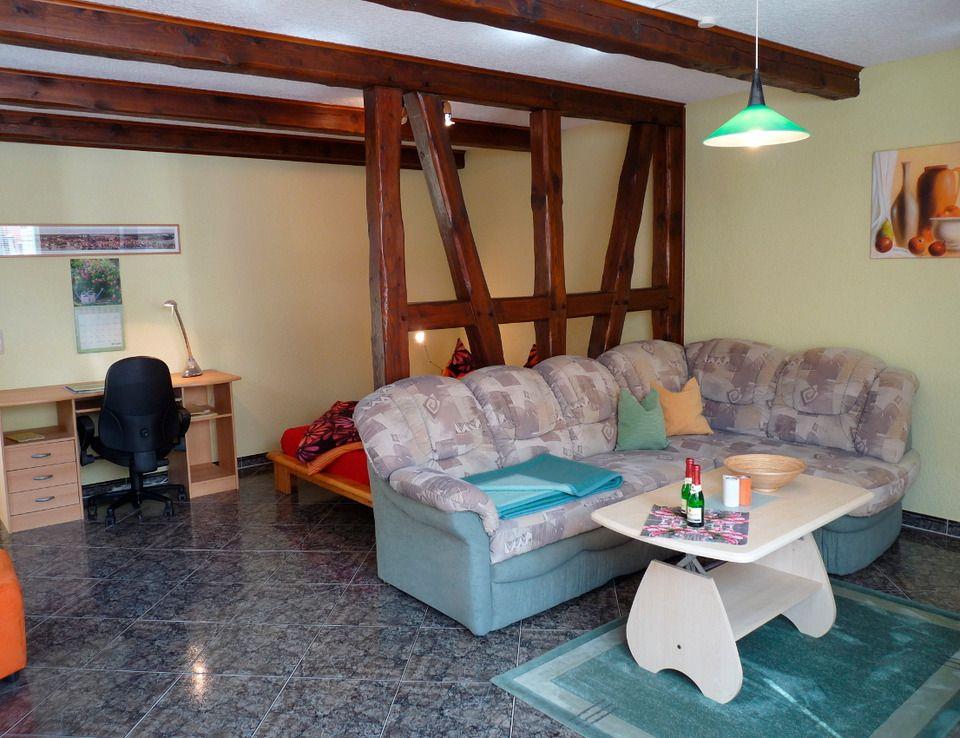 Das Wohnzimmer ist eingerichtet mit einem Doppelbett, einer Eckschlafcouch, zwei Sesseln, einem Schreibtisch, einer Schrankwand, einem Fernseher, einem DVD-Player und einer Stereoanlage.