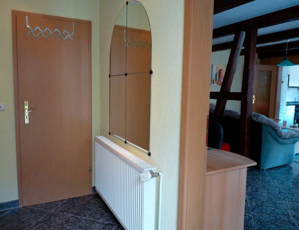 Das Ferienhaus in Malchow ist 48 m² groß. Sie betreten es über den Flur mit Garderobe, Spiegel und Schuhregal.