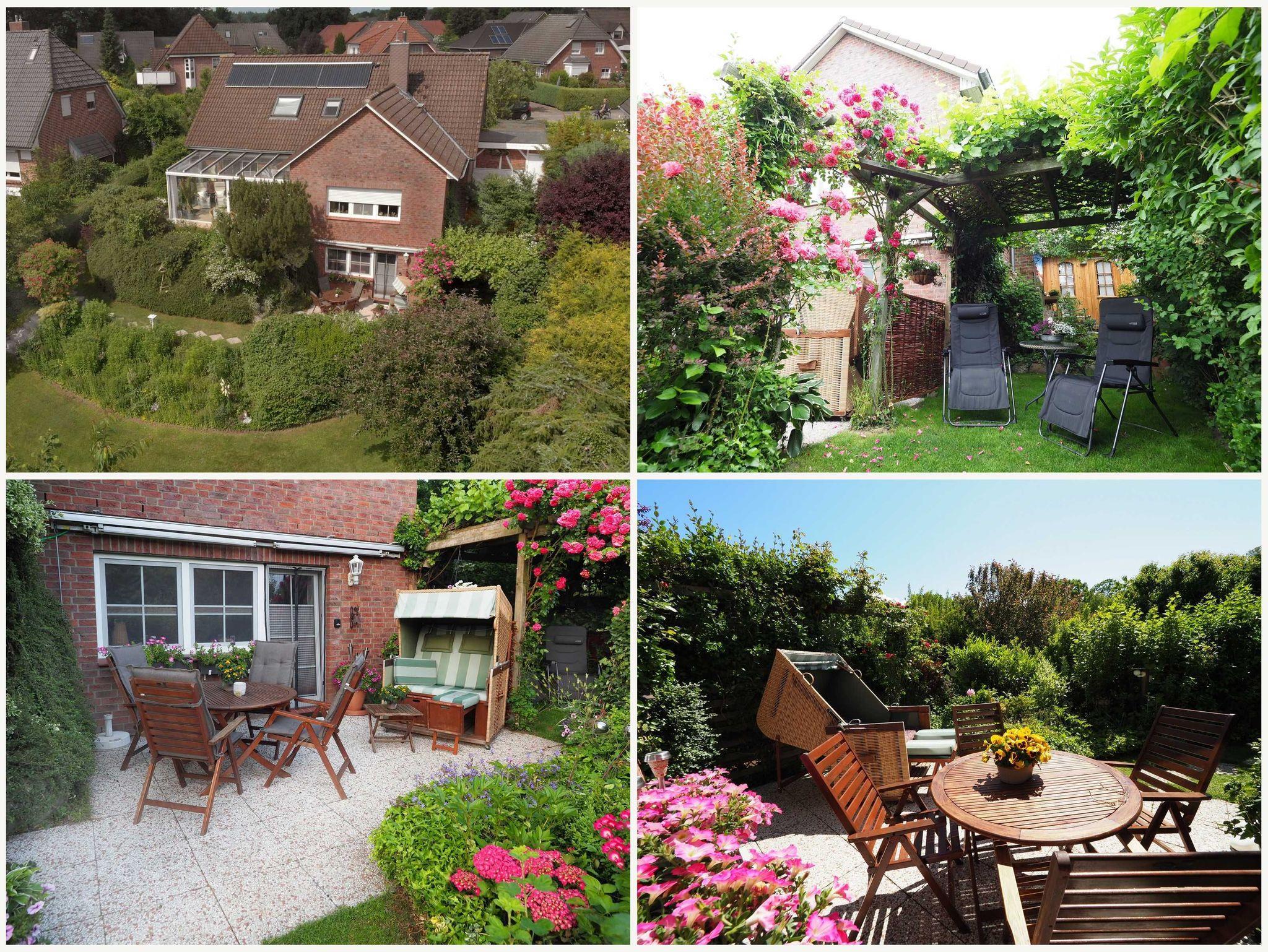 Zur Wohnung gehört ebenso eine große, eigene Südterrasse (Markise, bequeme Gartenmöbel / Liegestühle) und eine schattige Laube sowie eine Liegewiese in gepflegter Gartenanlage (1000 m²), Webergrill und Außenkamin.