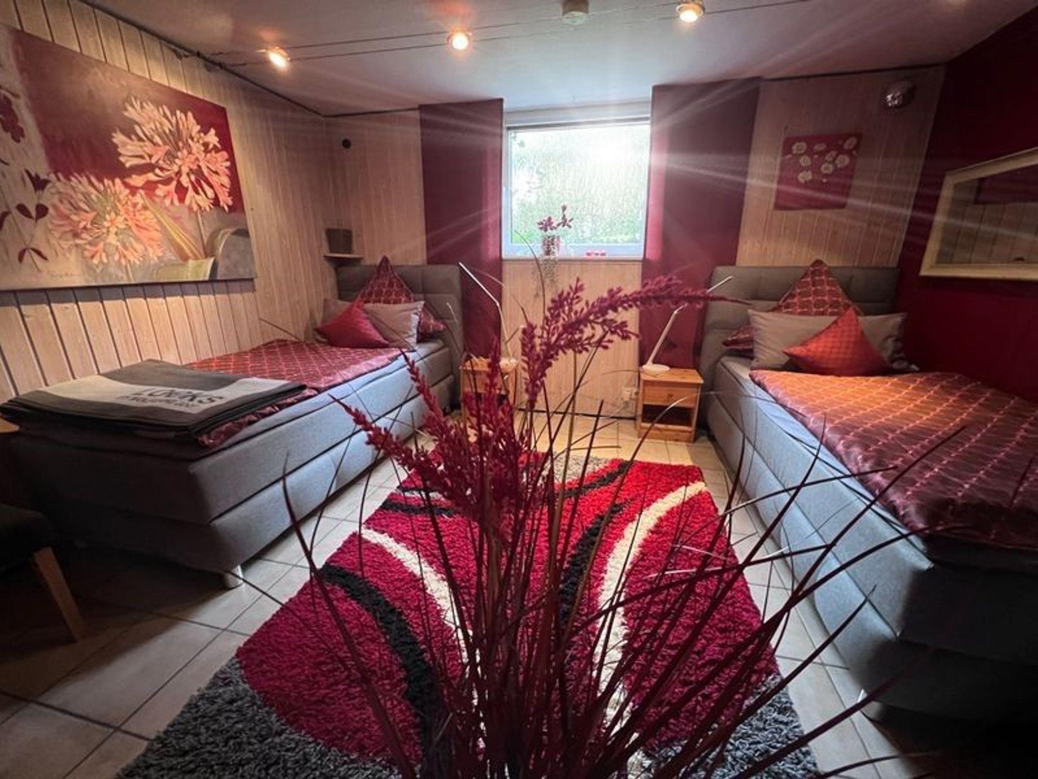 2. Schlafraum mit getrennt stehenden Boxspringbetten (je 1,00x 2,00 m) Kleiderschrank, Tisch mit zwei Stühlen und Regalen. Ebenfalls mit TV.