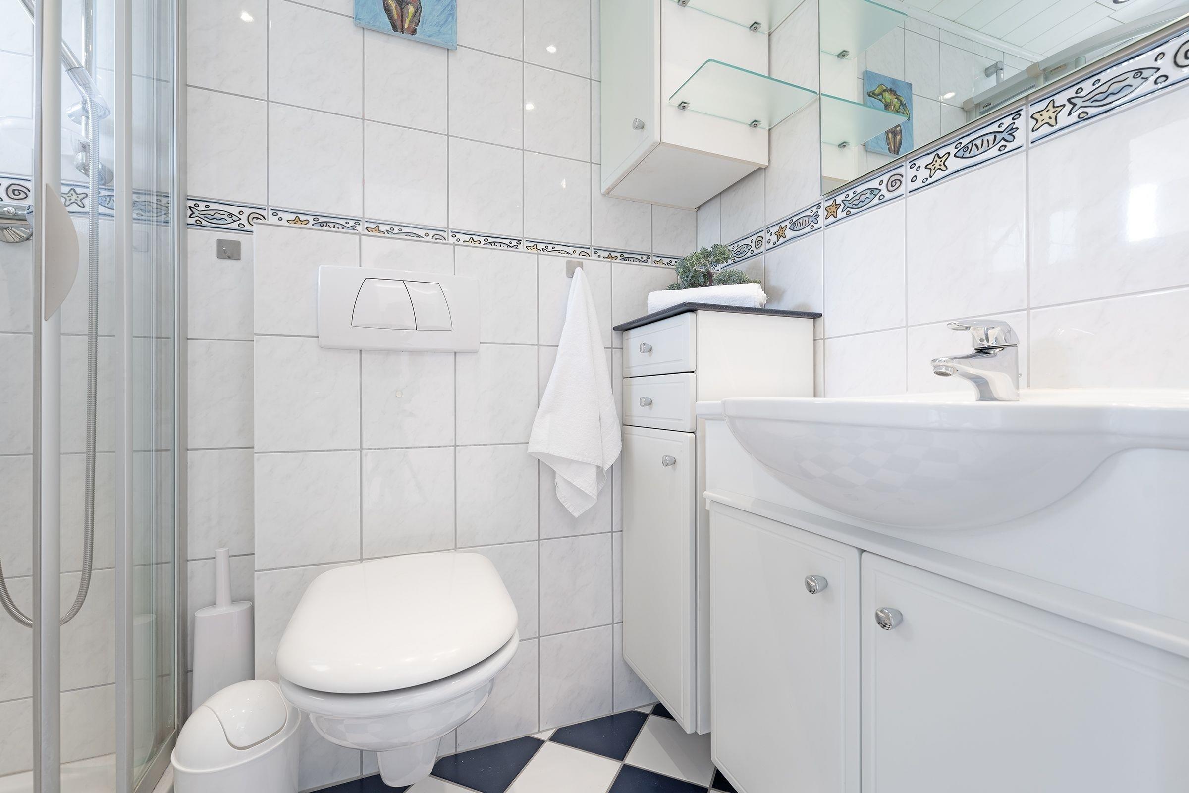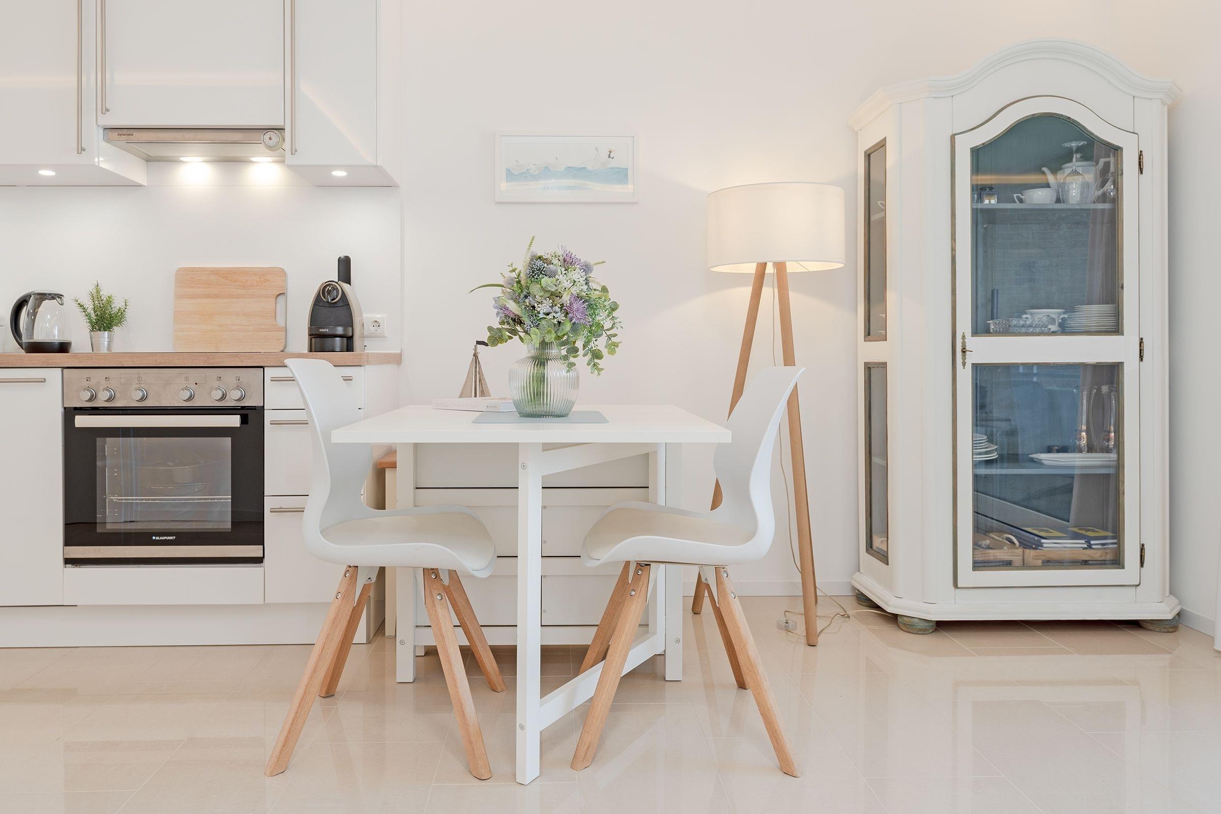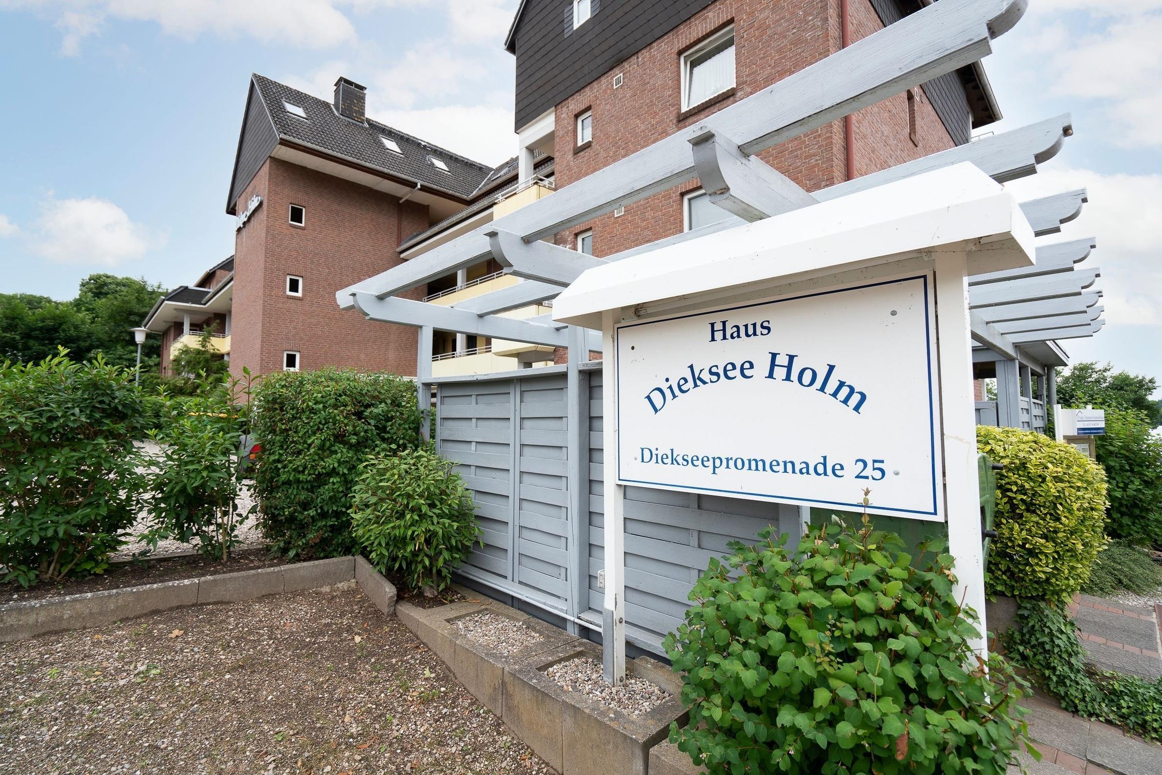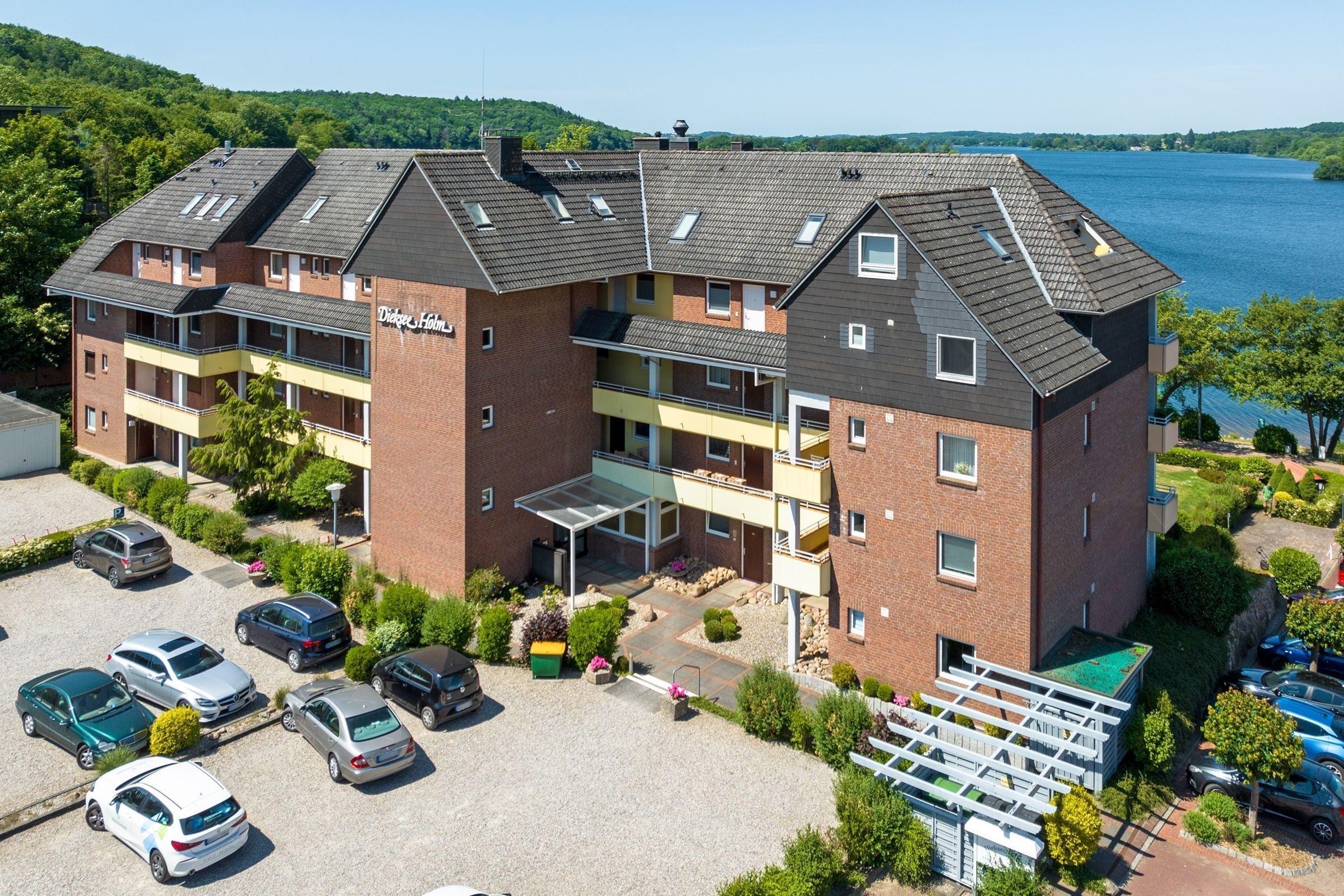 Bequem via Fahrstuhl erreichen Sie Ihr Feriendomizil im 1. OG der Ferienwohnungsanlage Haus Dieksee Holm. Über den Flur gelangen Sie direkt in den modern-maritim eingerichteten Wohn-Essbereich. Ein gemütliches Sofa und ein Stressless-Sessel laden zum Relaxen und zum Seeblick genießen ein. Die sehr gut ausgestattete Hochglanzküche ist in den Wohnbereich integriert und lässt mit Ceran-Kochfeld, Spülmaschine, Backofen und Mikrowelle keine Wünsche offen. Weiter geht es in das Schlafzimmer, welches mit einem bequemen Doppelbett (2x 80x200cm) für einen erholten Schlaf im Urlaub sorgt. Angrenzend an die Küche befindet sich das hell geflieste, kleine Tageslicht-Duschbad. Beide Räumlichkeiten lassen sich zur Nacht angenehm abdunkeln. Überzeugen wird Sie der traumhafte Ausblick auf den Dieksee, den Sie direkt vom Wohnzimmer oder vom überdachten Balkon aus genießen können. Machen Sie es sich an der frischen Luft auf den Balkonmöbeln oder der bequemen Rattancouch gemütlich.