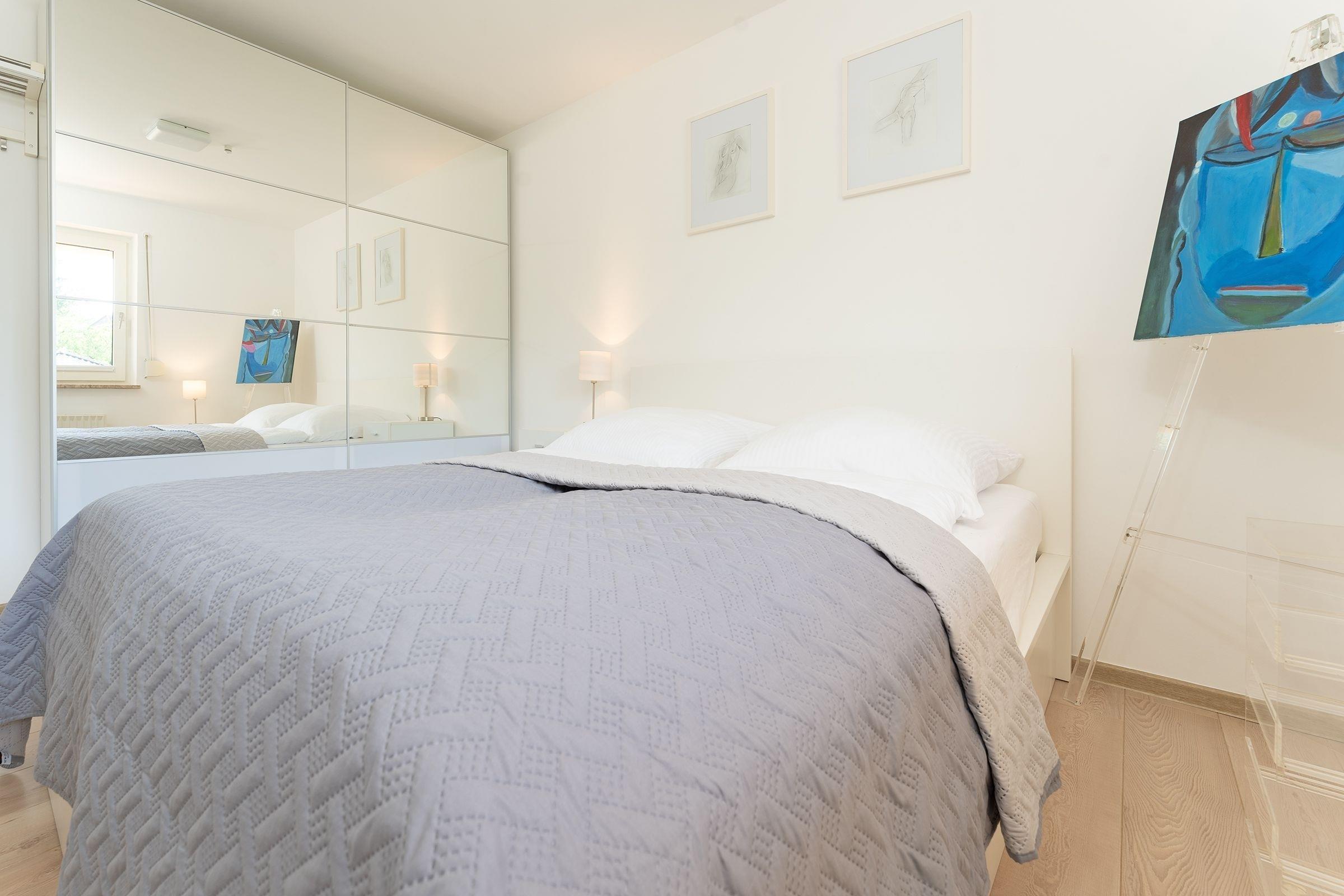 Schlafzimmer: 1 Doppelbett (2x 80x200 cm), Kleiderschrank, Verdunkelung: Rollläden, Platz für Babybett vorhanden