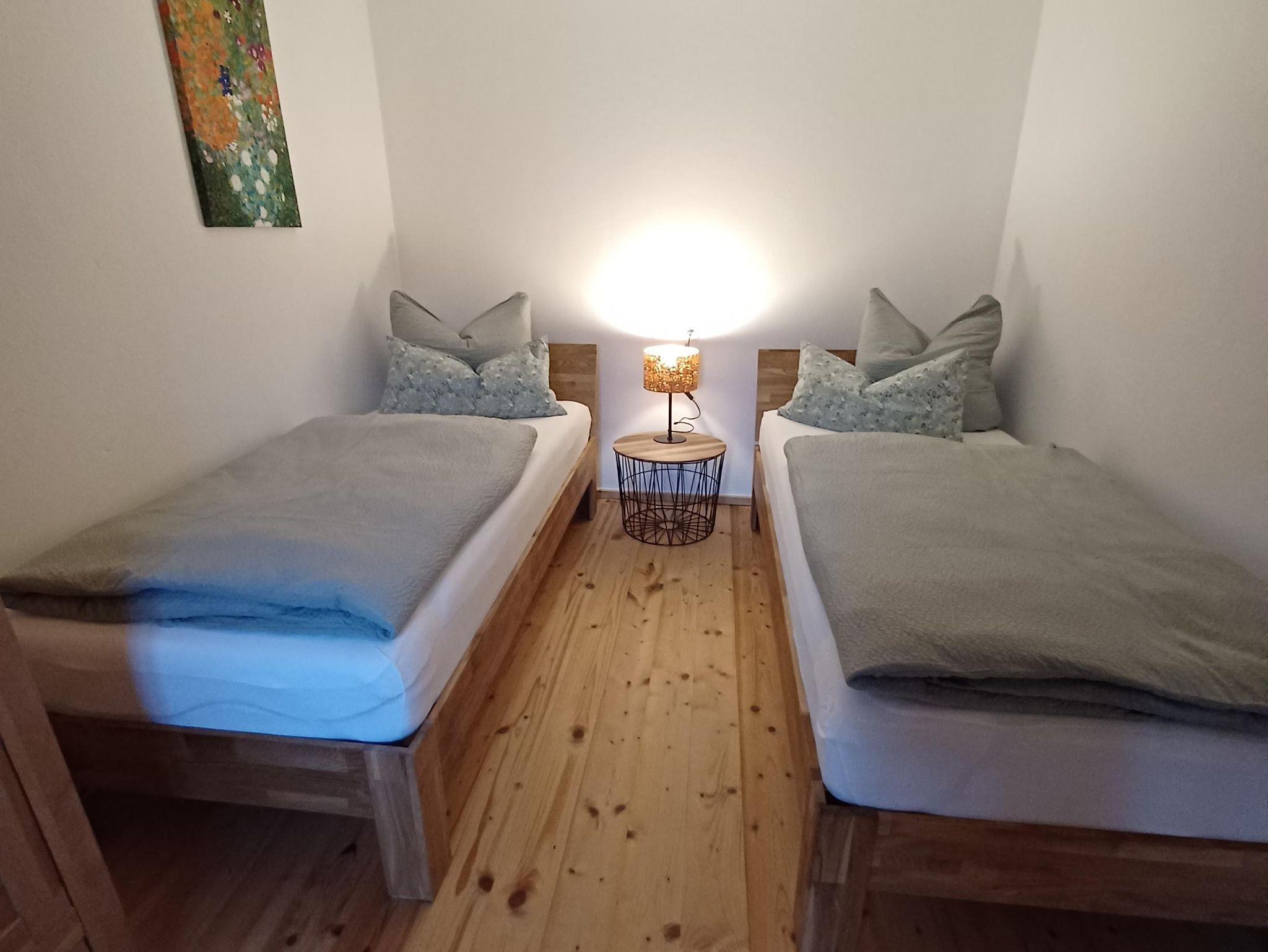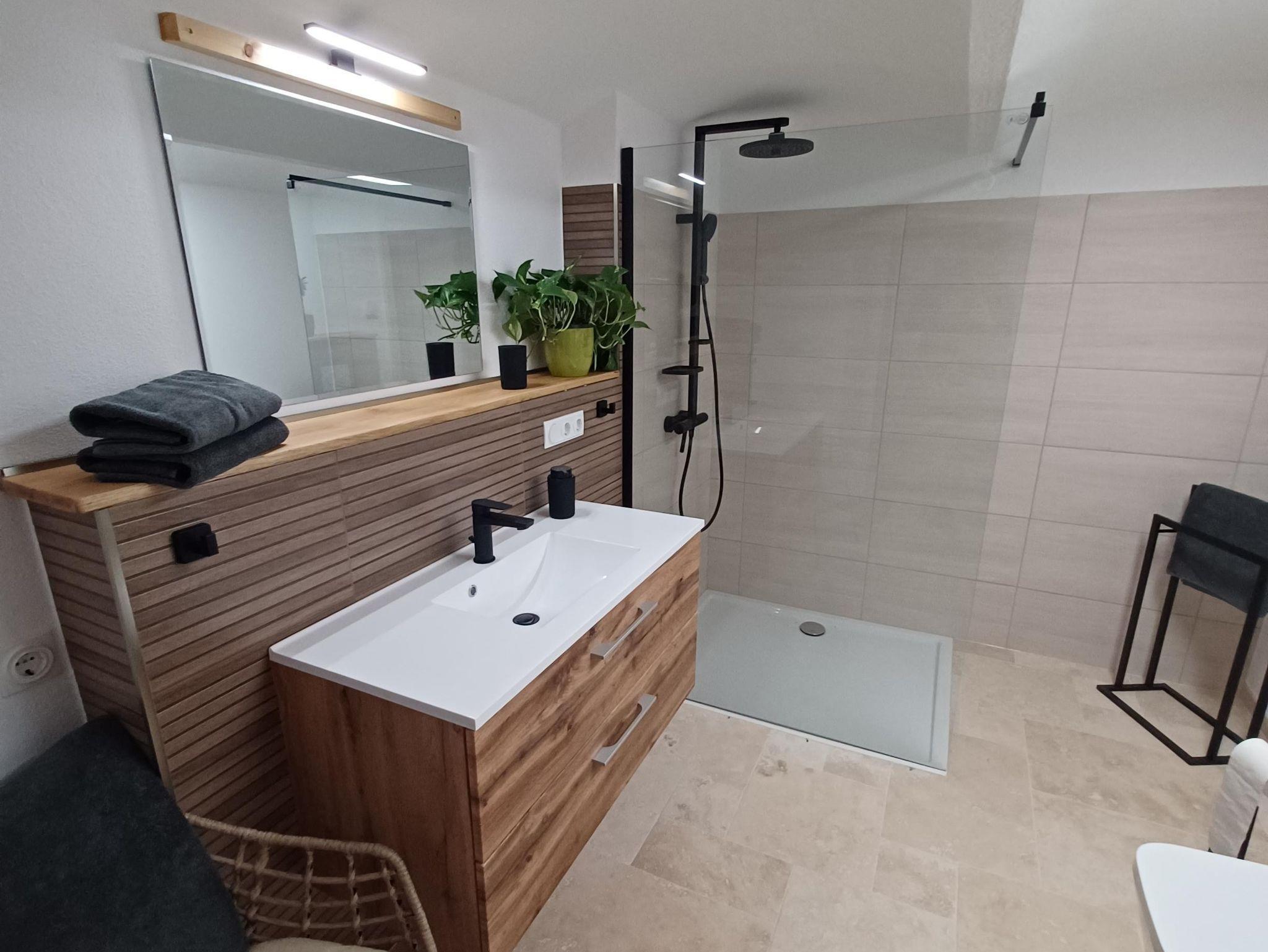 Das Haus verfügt über drei Schlafzimmer, die sich im Obergeschoss befinden: ein Zimmer mit Doppelbett sowie zwei Zimmer mit jeweils zwei Einzelbetten – ideal für Familien oder Gruppen. Zwei moderne Badezimmer mit ebenerdiger Dusche sorgen für Komfort und Bequemlichkeit.