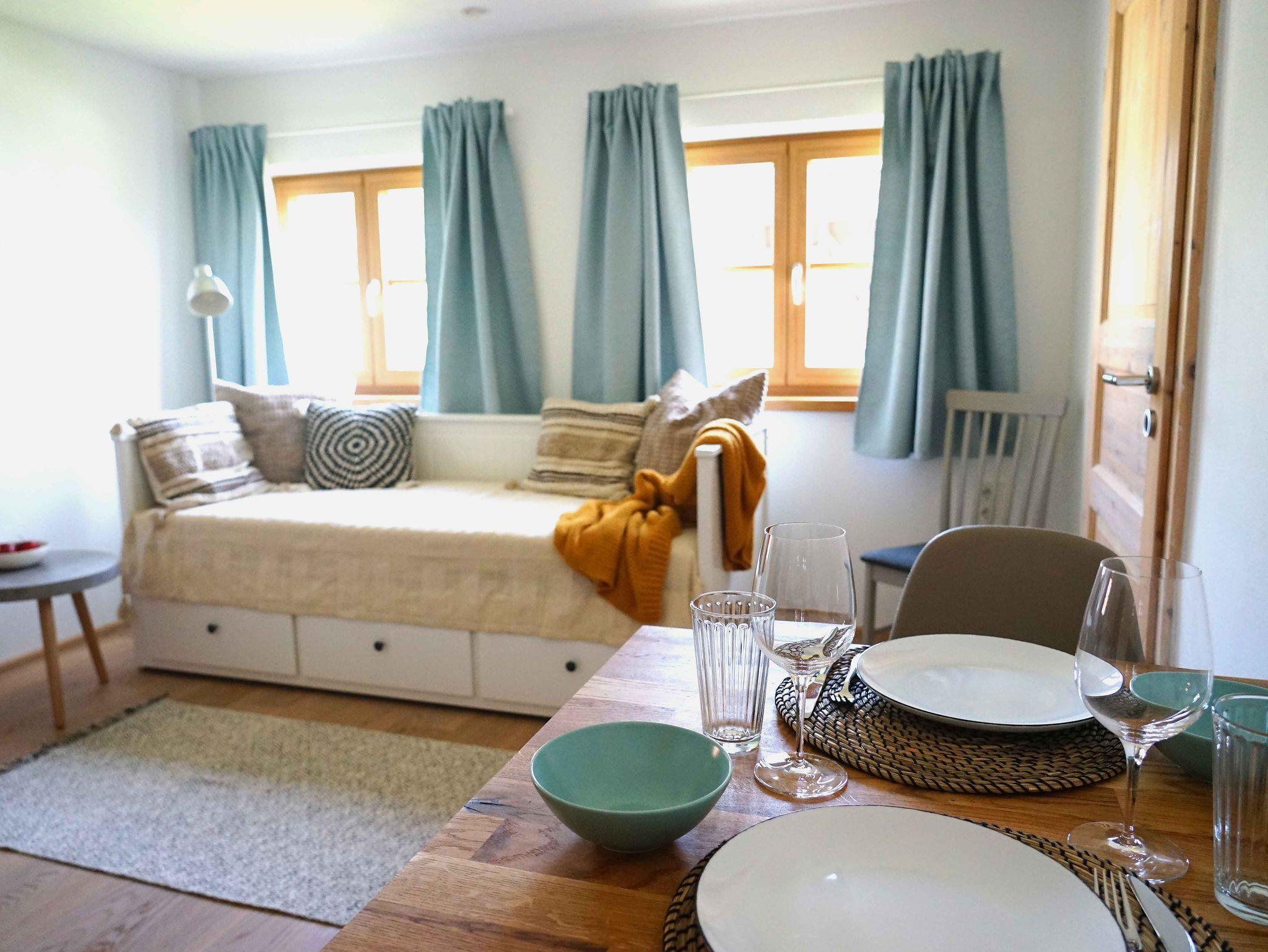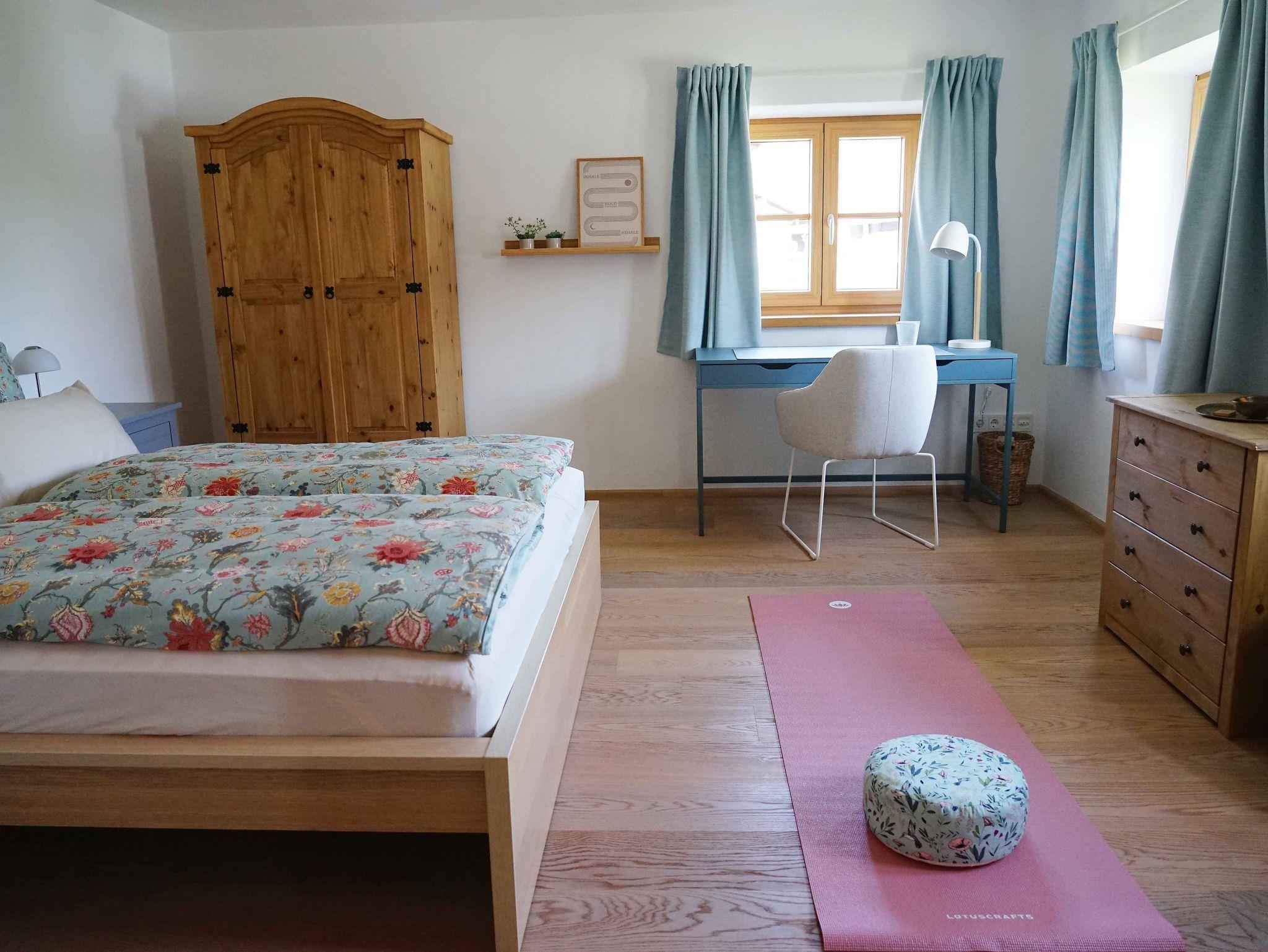 Die ca. 50 m² große, ruhig gelegene und sonnige 2-Zimmer-Wohnung mit Schlafzimmer (Doppelbett 160x200), Wohn-/Esszimmer (mit Esstisch, ausziehbarem Tagesbett und TV), Küche, Bad mit Fenster und Dusche + Flur mit Garderobe befindet sich im ersten Stock. Alle Zimmer sind mit Fenstern und moderner Fußbodenheizung, Parkett und Fliesen ausgestattet. Auf dem Stockwerk befindet sich außerdem ein kleiner Westbalkon mit Sitzgarnitur. Die Küche ist mit Geschirrspüler, Kaffeemaschine, Bio-Gewürzen, Bio-Tee und -Kaffee sowie Essig/Öl voll ausgestattet. WLAN, Netflix und ein Parkplatz im Hof sind kostenlos. Direkt im Hof befindet sich (gegen Aufpreis) eine Lademöglichkeit für Elektrofahrzeuge. Im Zimmer liegen Yogamatten für dich bereit.
