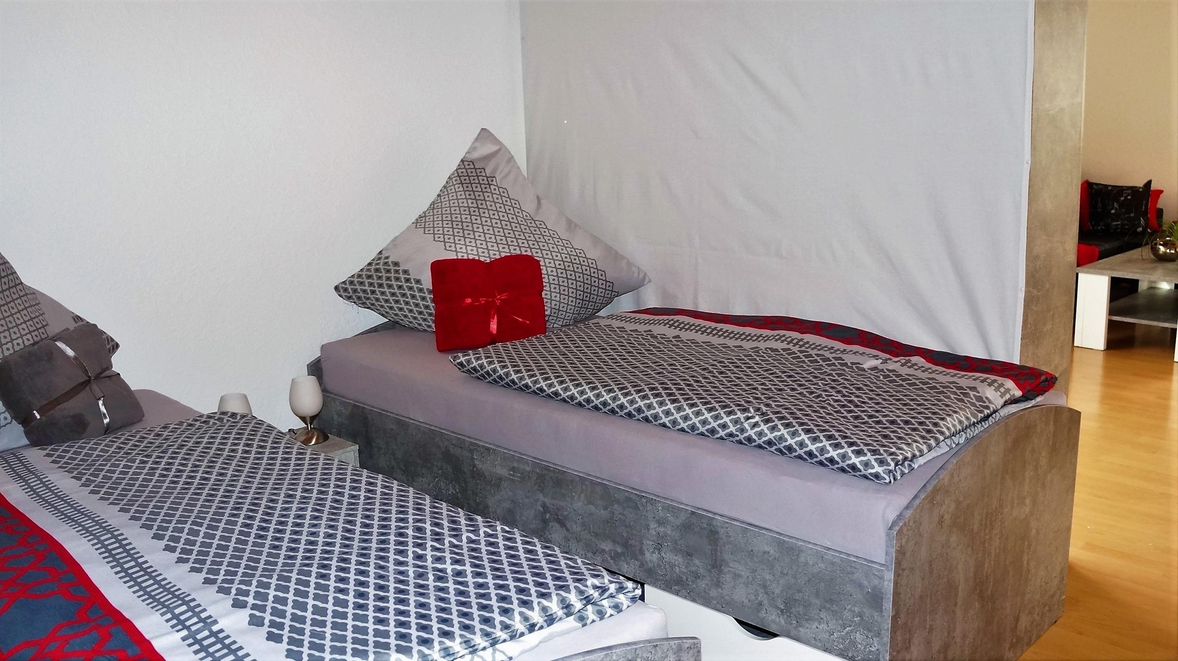 Die Ferienwohnung "La Musica" liegt im Souterrain als Einliegerwohnung des Hauses der Gastgeber Familie Mirl. Sie verfügt über ein separates Schlafzimmer sowie eine weitere Schlafmöglichkeit für 2 Personen im Wohnbereich durch einen Raumteiler abgetrennt. Alle Betten sind sowohl als Doppelbett als auch als Einzelbetten nutzbar.