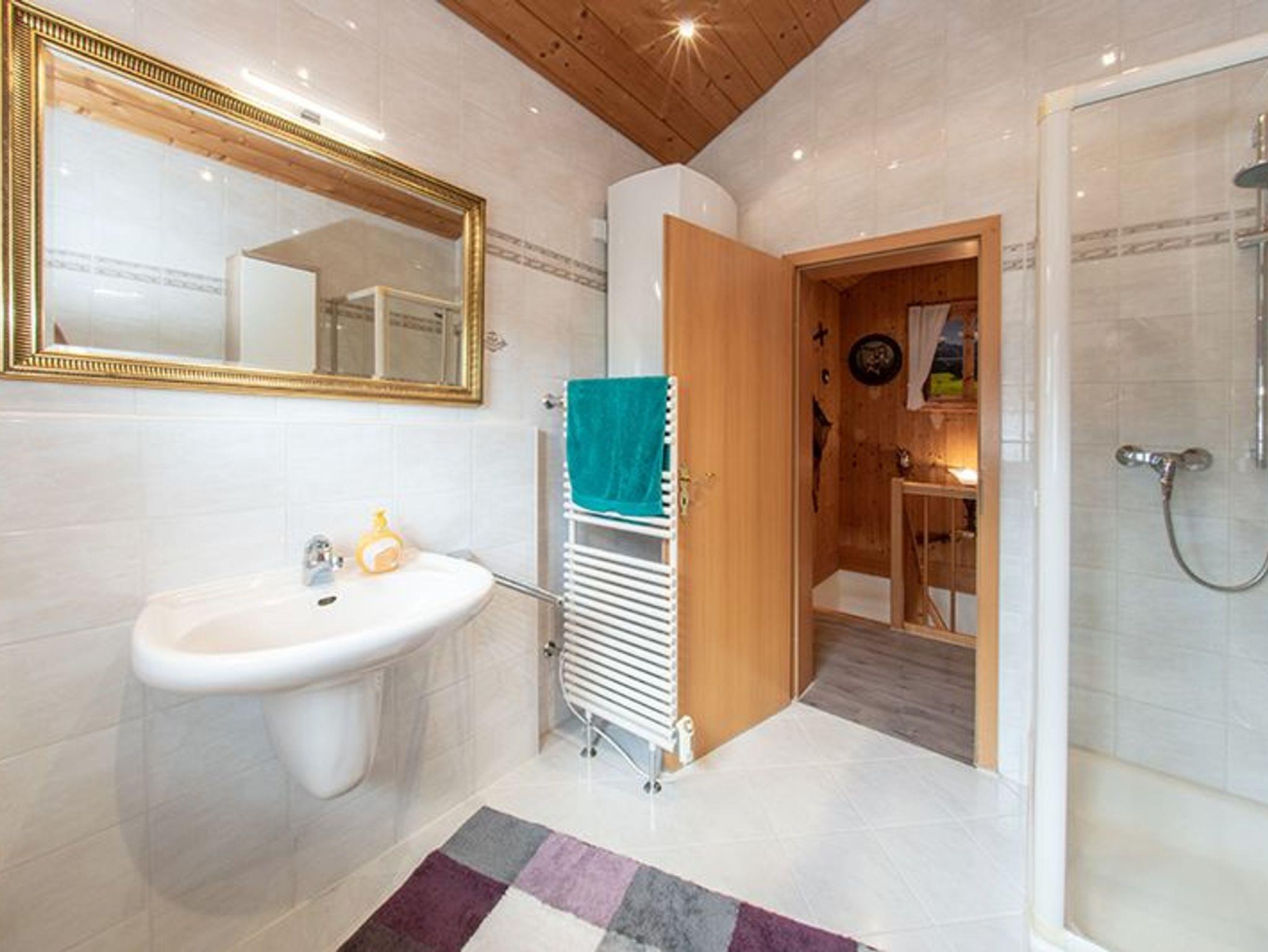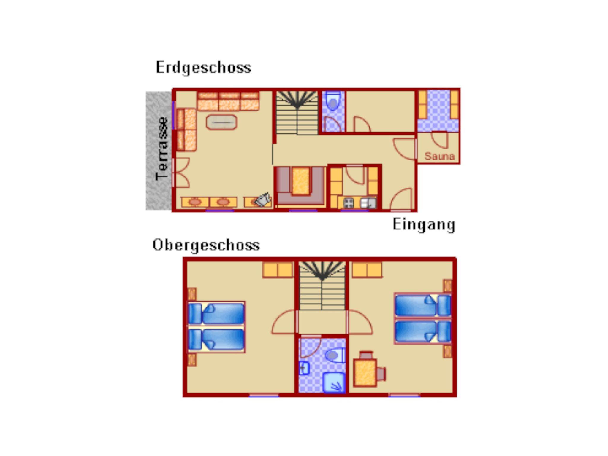 Dieses Ferienhaus in Holzbauweise bietet eine besonders behagliche Atmosphäre. Die integrierte Sauna mit Panoramafenster (gegen Aufpreis) macht auch wetterunabhängige Urlaubstage zum Erlebnis. Im Obergeschoss befinden sich zwei Schlafzimmer mit Doppelbetten sowie ein Badezimmer mit Duschkabine. Das Erdgeschoss umfasst ein Gäste-WC, eine gut ausgestattete Küche sowie einen offenen Wohnbereich mit großer Sitzecke, Sofa, Fernseher und Internetzugang. Von hier führt der Zugang zur möblierten Terrasse, die durch den überdachten Glasfreisitz bei jedem Wetter nutzbar ist. Eine zusätzliche neu gestaltete Terrasse mit Blick auf die umliegenden Wiesen lädt zum Frühstück oder Nachmittagskaffee im Freien ein.