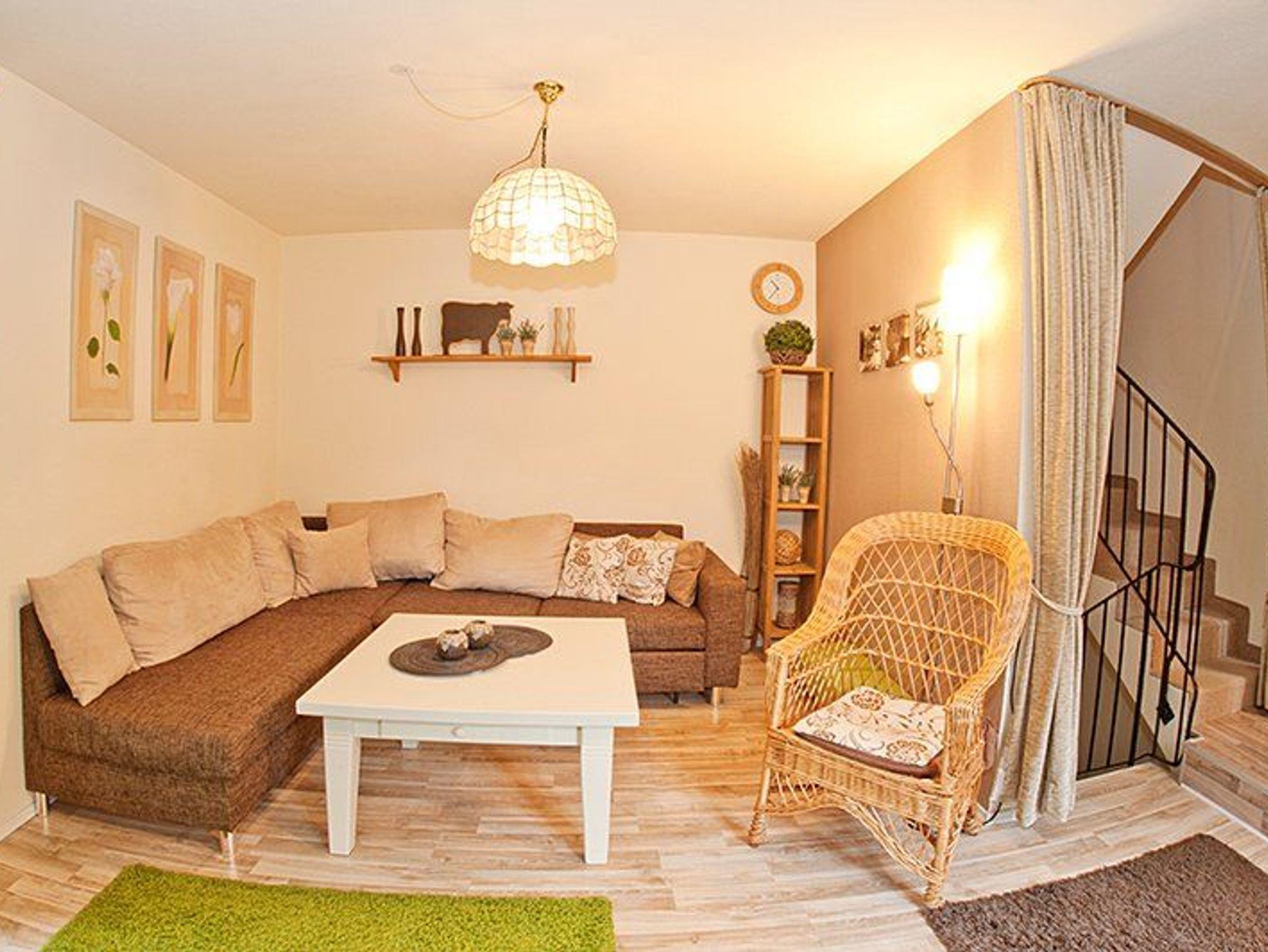 Der Wohnbereich ist modern eingerichtet und verfügt über Fernseher, Kabel- und Internetanschluss sowie eine Stereoanlage. Eine Eckcouch und vorhandene Bücher und Spiele bieten zusätzliche Unterhaltung.