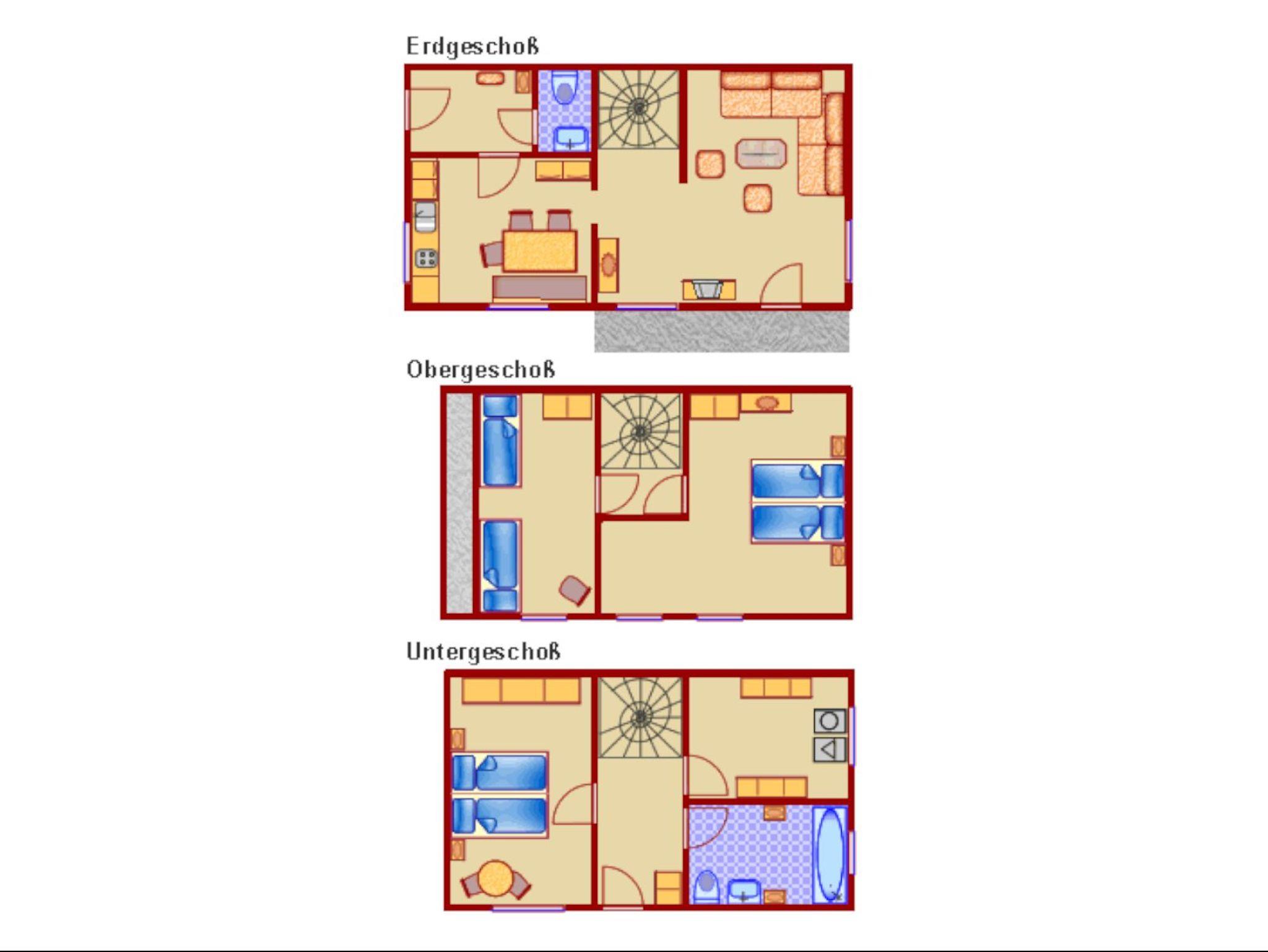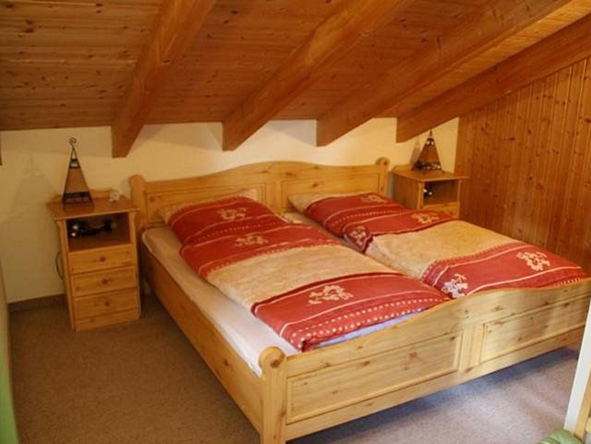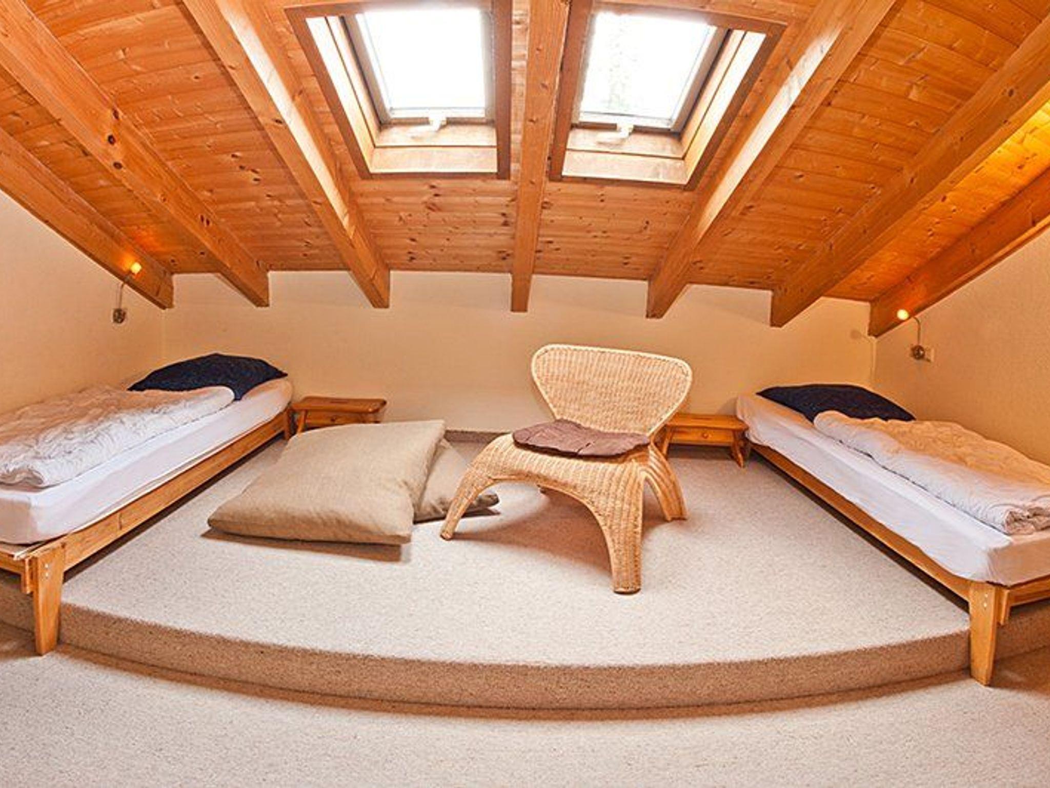 Im Obergeschoss befinden sich zwei Schlafzimmer, ein weiteres liegt im Untergeschoss. Dort befinden sich auch das Badezimmer mit Dusche, Badewanne, Föhn, Waschmaschine und Trockner.