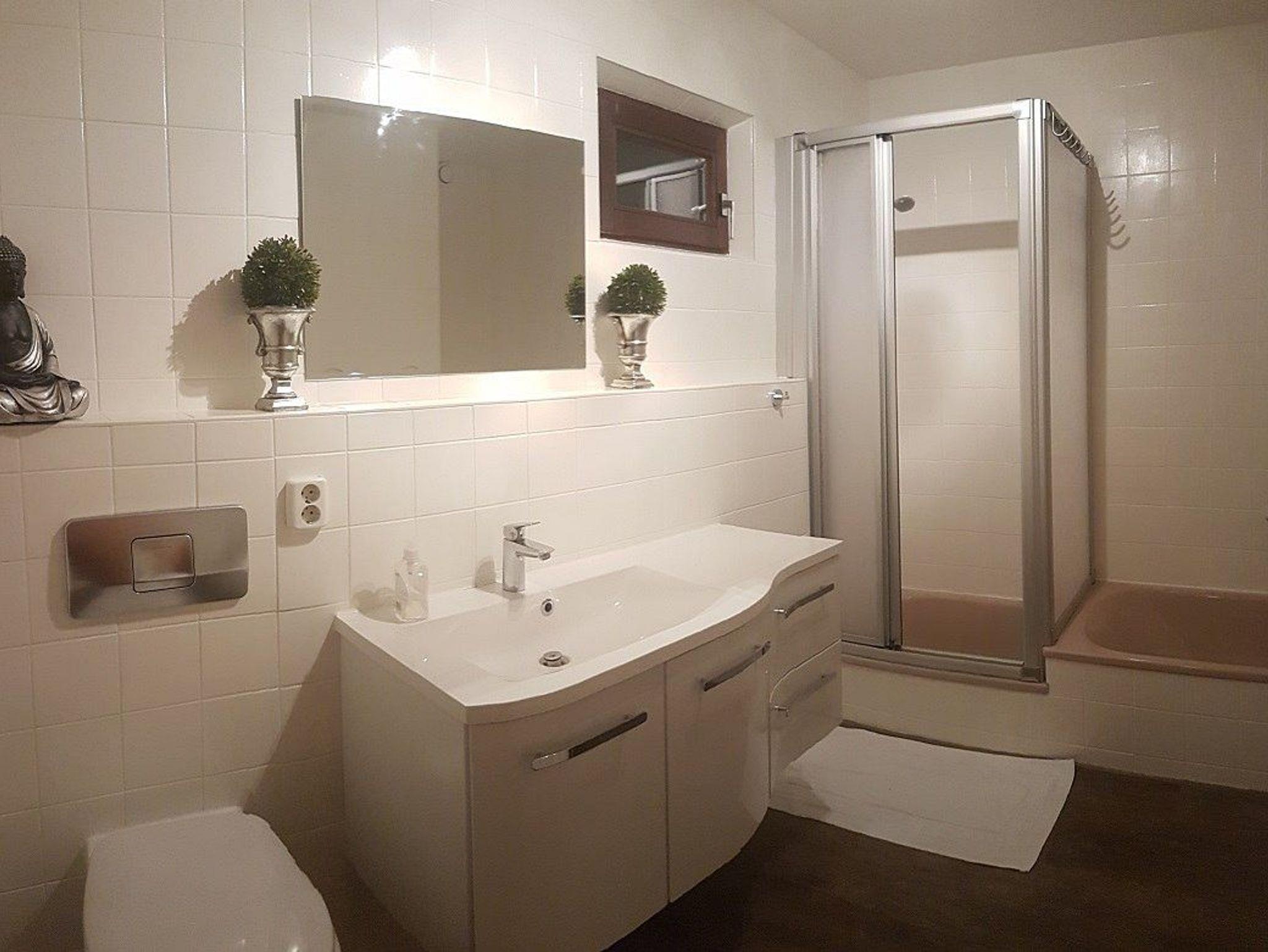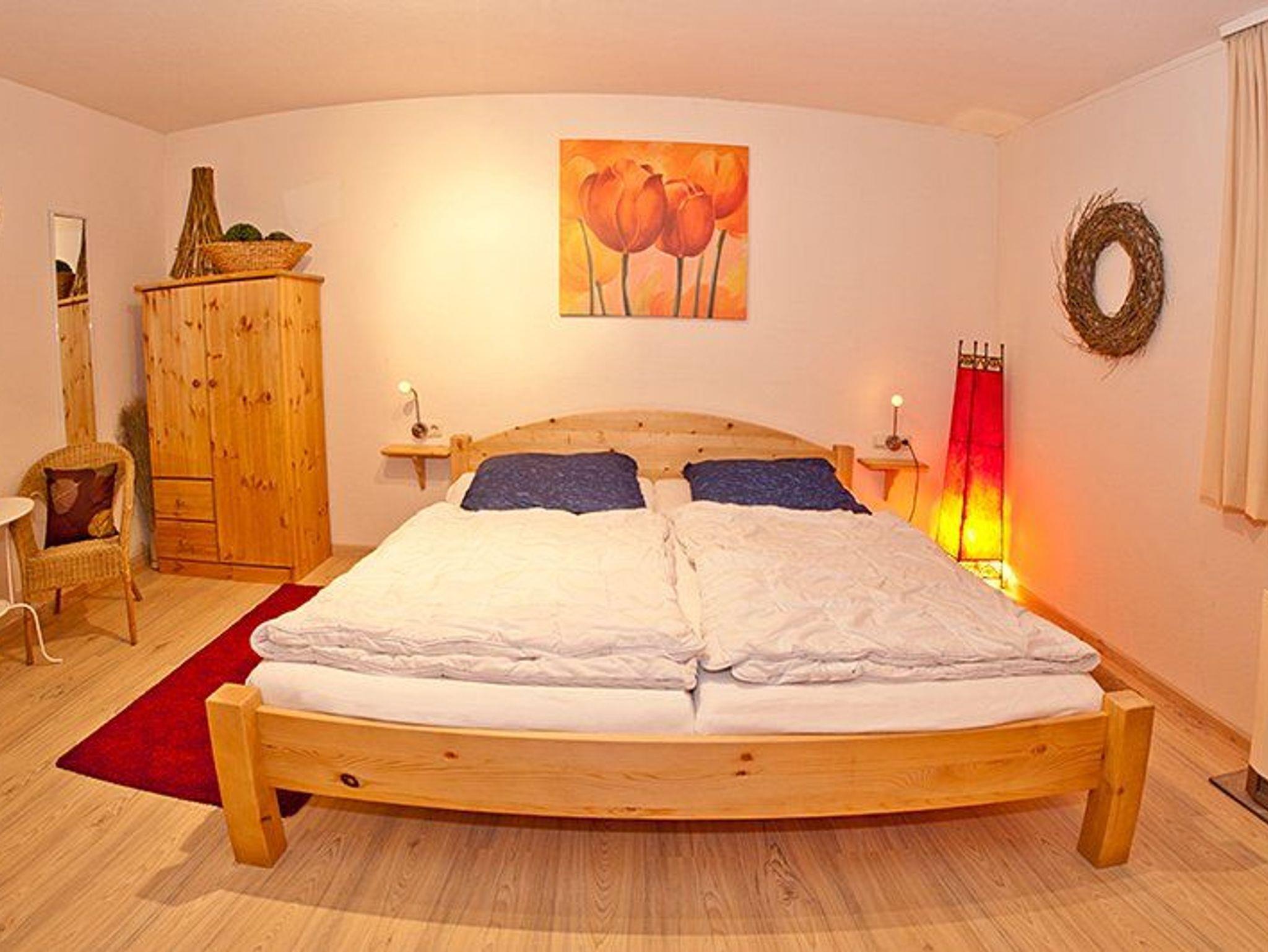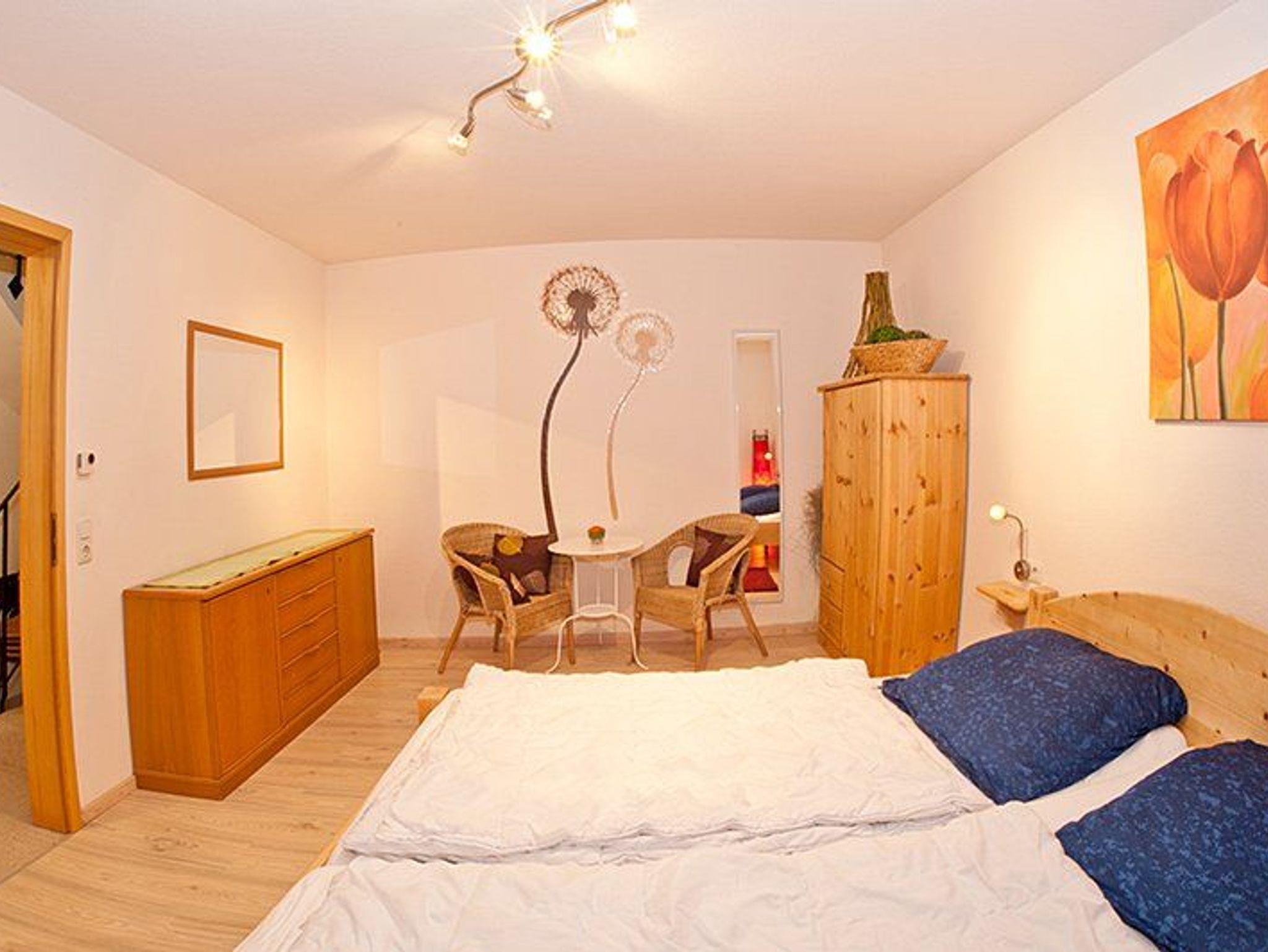 Im Obergeschoss befinden sich zwei Schlafzimmer, ein weiteres liegt im Untergeschoss. Dort befinden sich auch das Badezimmer mit Dusche, Badewanne, Föhn, Waschmaschine und Trockner.