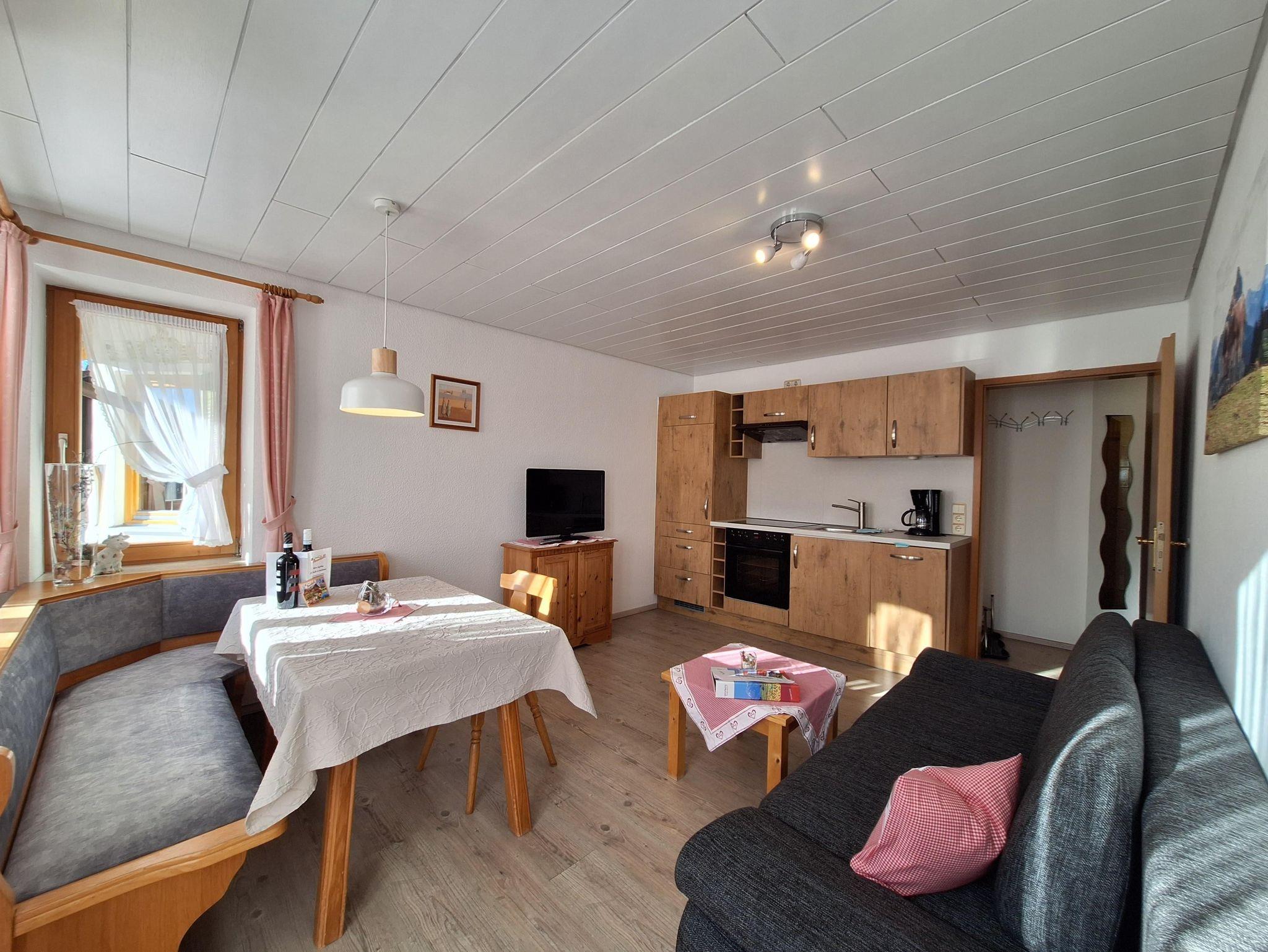 Gemütliche 2-Zimmerferienwohnung Attlesee (30 qm) im 2. Stock mit Westbalkon (Blick zur Alpspitze und zum Grünten), 1 Doppelschlafzimmer, schöner Wohnküche (Backofen, Ceranfeld, Kaffeemaschine, Mikrowelle, Spülmaschine, Toaster, Wasserkocher), Sat-TV, Stereoanlage und Radiowecker sowie Badezimmer mit Dusche/WC und Haarfön.