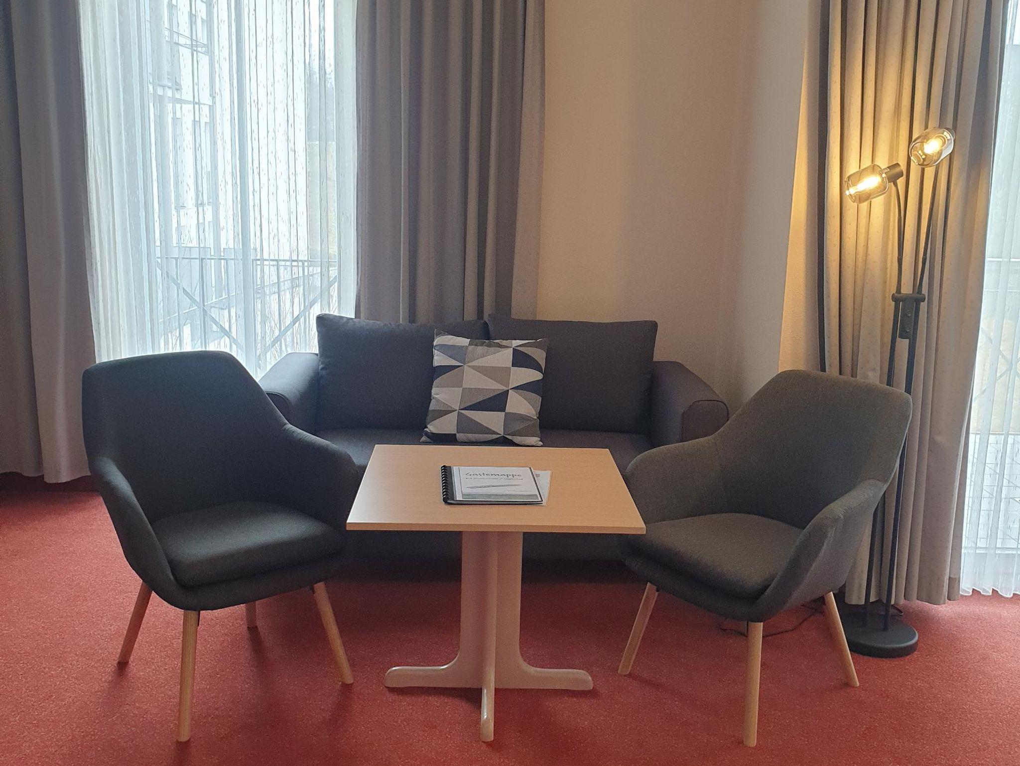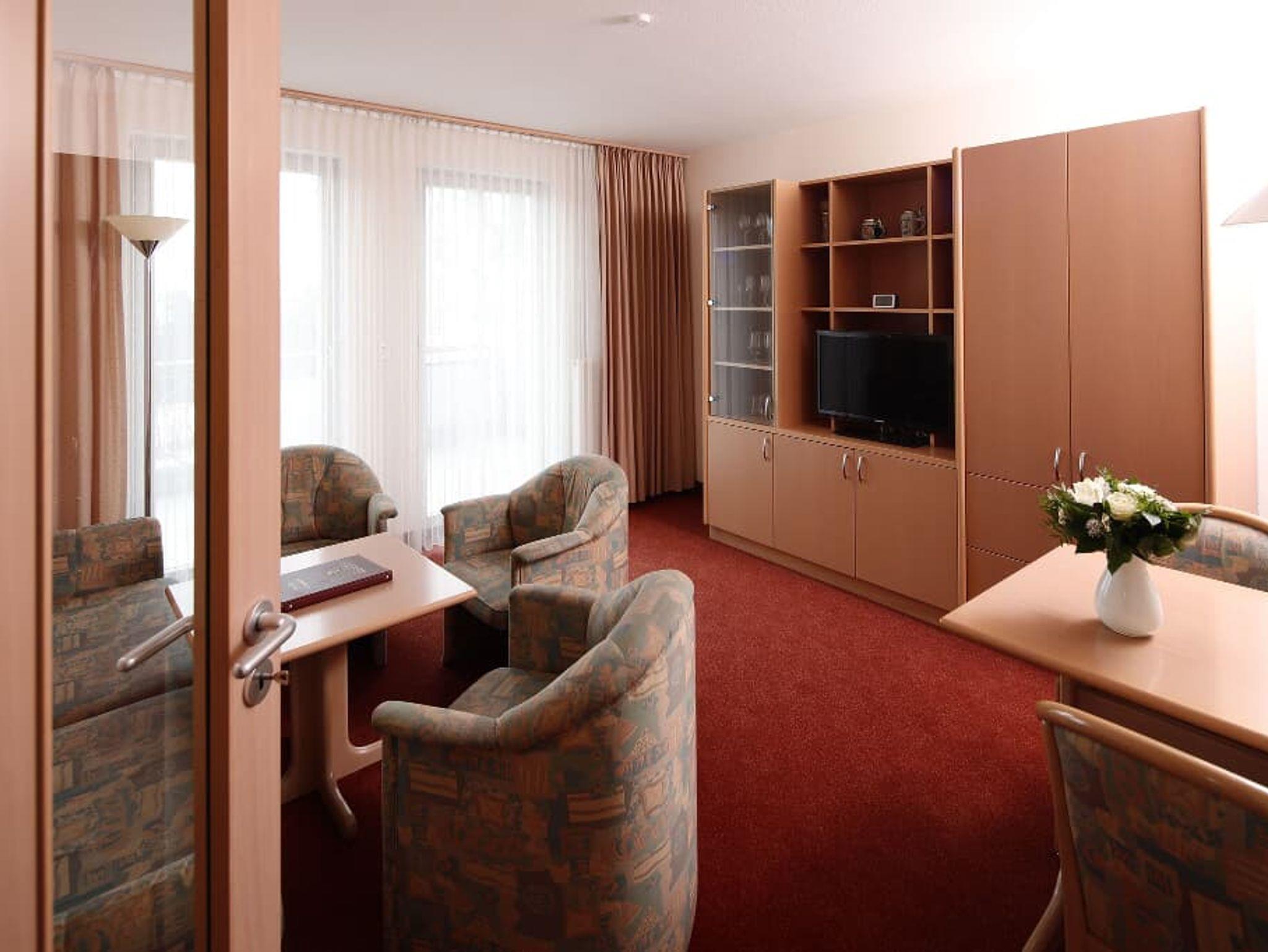 Separater Wohnraum mit gemütlicher Sitzgelegenheit, SAT-TV, Radio, Telefon, sowie freies W-Lan. Schlafraum mit zwei getrennten Betten. Die Suite verfügt über eine komplett ausgestattete Küche und Bad mit Dusche, WC und Föhn. Überwiegend Balkon verfügbar.