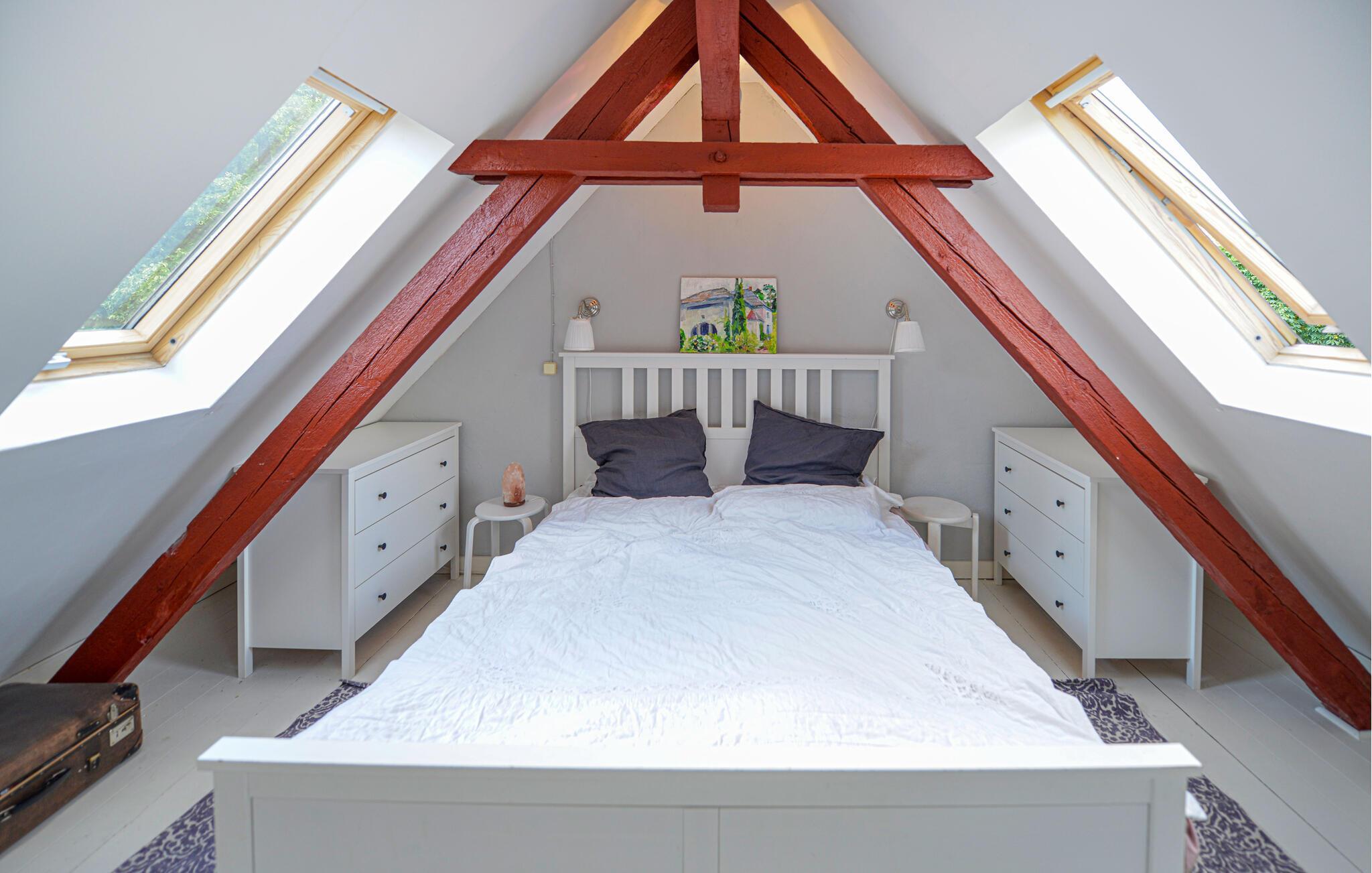 Verbringen Sie erholsame Tage in diesem besonderen Ferienhaus, das Sie mit seiner historischen Ausstrahlung und einer liebevollen Einrichtung empfängt. Die ruhige Lage im Grünen macht dieses Haus zu einem idealen Ort für eine Auszeit vom Alltag. Lassen Sie sich von den hohen Decken, dem Holzfußboden und den kunstvollen Details im Interieur begeistern. Der Wohnbereich mit großer Sitzgruppe, Bücherregalen und Kachelofen lädt zu ausgedehnten Lese- oder Spieleabenden ein. Kochen Sie gemeinsam in der großzügigen Landhausküche und genießen Sie Ihre Mahlzeiten am urigen Esstisch. Auch ein Arbeitszimmer mit Bibliothek steht Ihnen zur Verfügung.