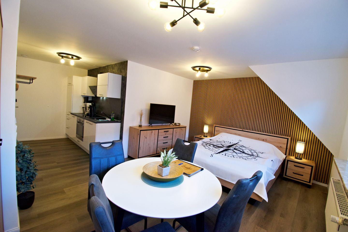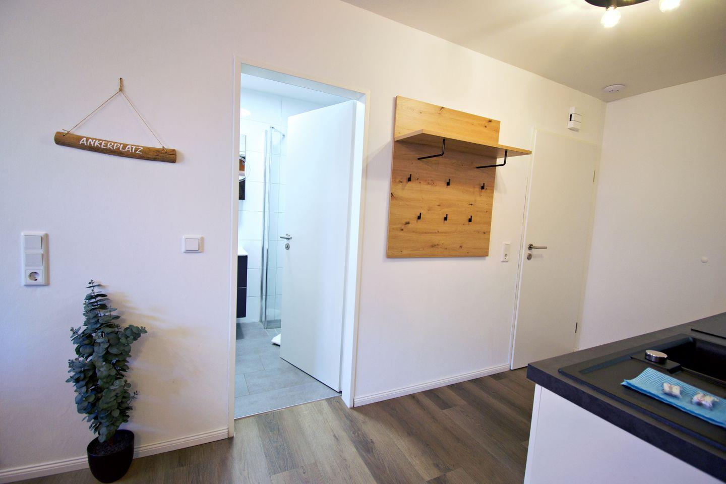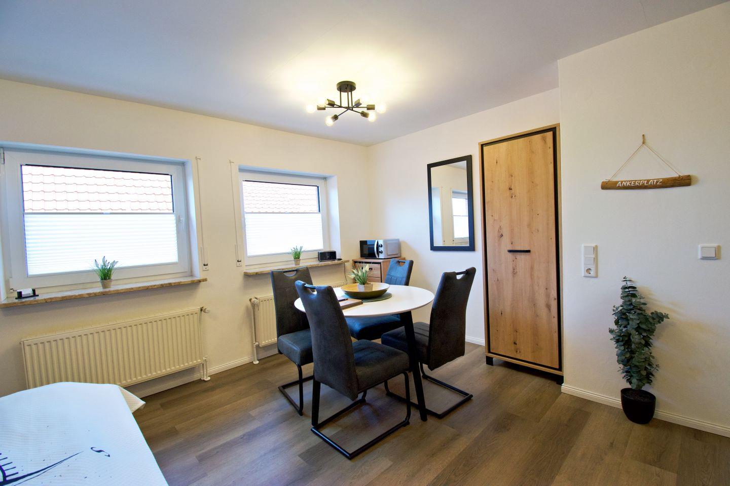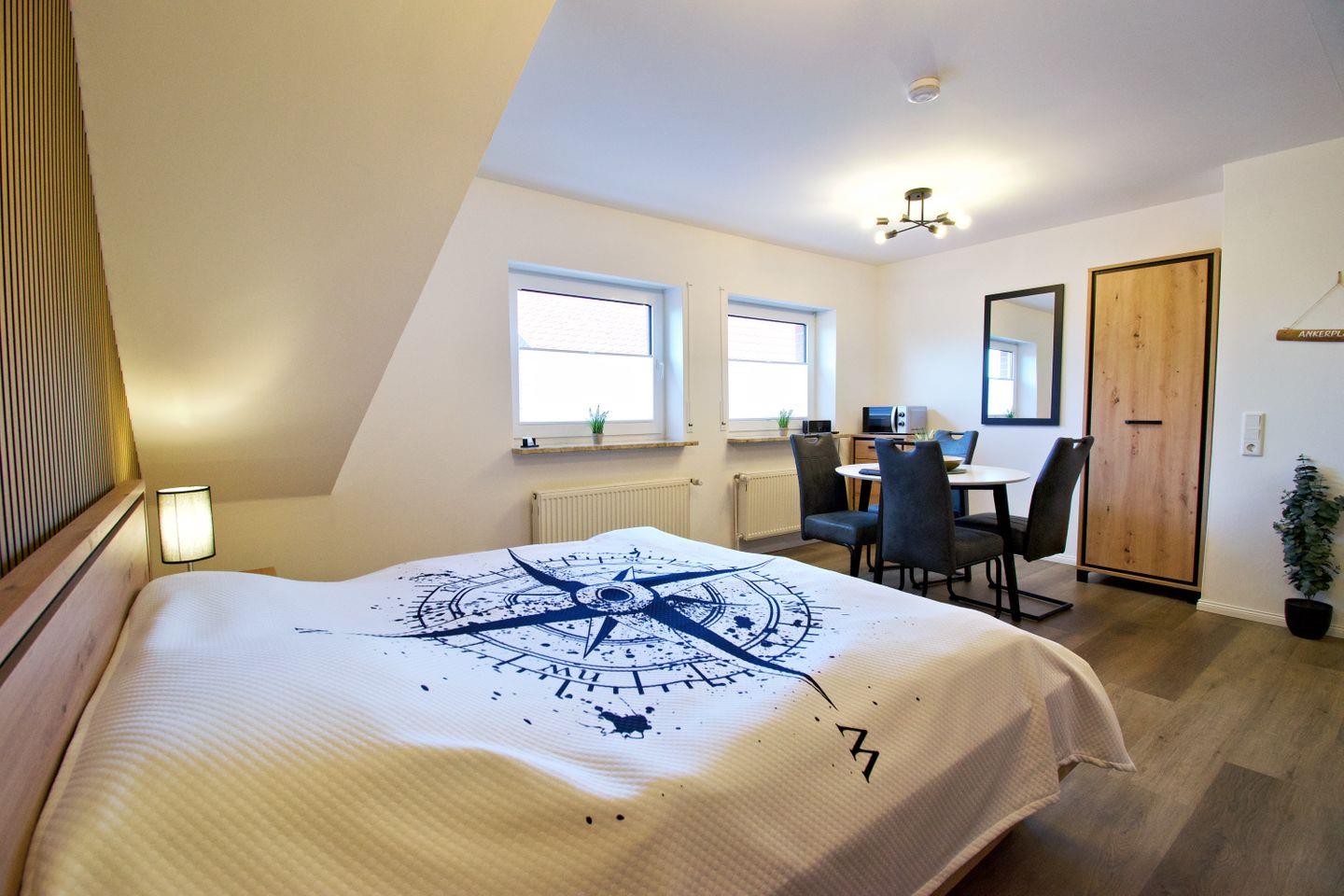 Die stilvolle Ferienwohnung „Ankerplatz“ ist die perfekte Wahl für Paare, die eine kompakte, aber hochwertig ausgestattete Unterkunft in Norddeich suchen. Die Ein-Raum-Wohnung mit separatem Badezimmer bietet Platz für 2 Personen und verbindet modernes Wohnen mit nordischem Küstenflair. Der offene Wohn- und Schlafbereich mit Doppelbett, Sitzecke, Smart-TV und kostenfreiem WLAN sorgt für Komfort auf kleinem Raum. Eine voll ausgestattete Küchenzeile ermöglicht flexible Selbstverpflegung, während das moderne Badezimmer mit Dusche den Wohnkomfort abrundet.