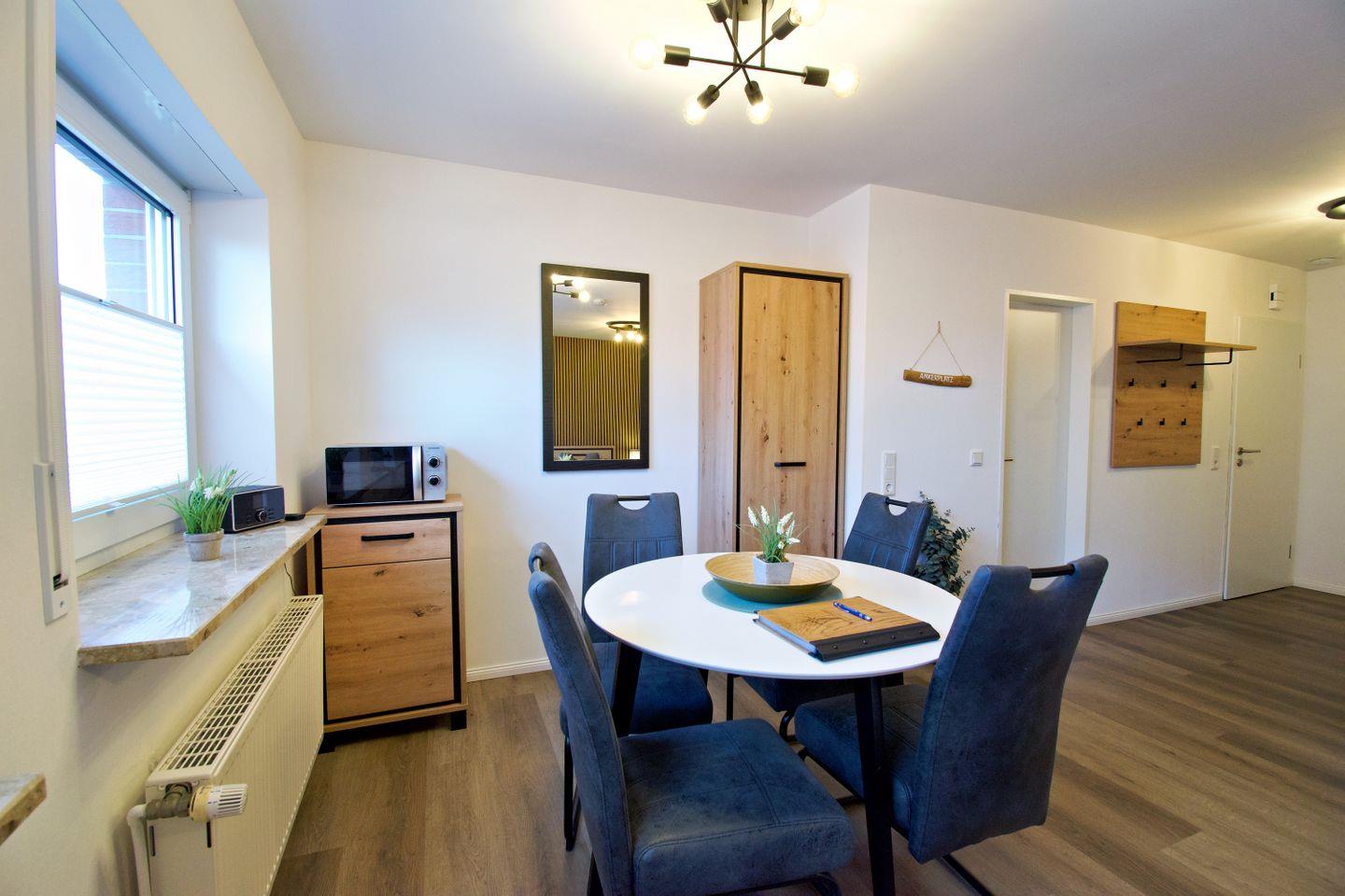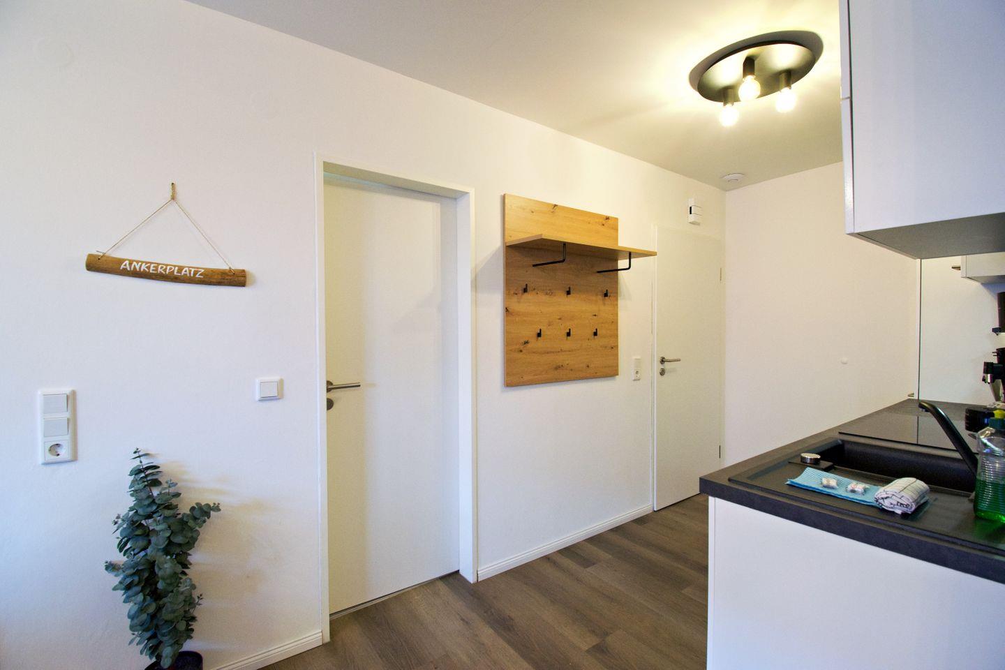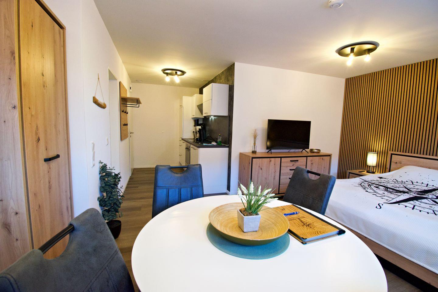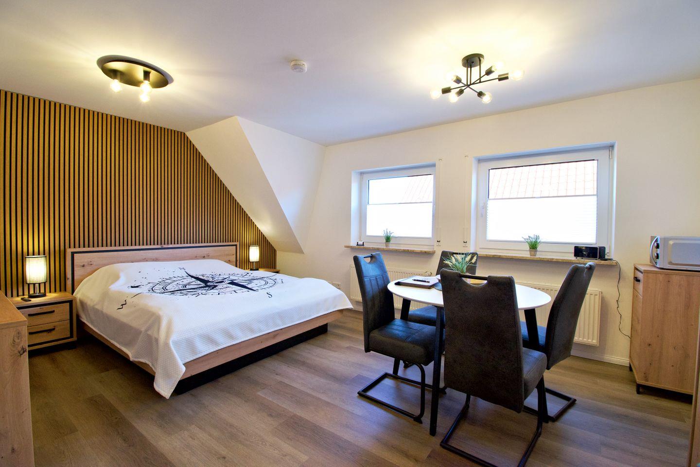 Die stilvolle Ferienwohnung „Ankerplatz“ ist die perfekte Wahl für Paare, die eine kompakte, aber hochwertig ausgestattete Unterkunft in Norddeich suchen. Die Ein-Raum-Wohnung mit separatem Badezimmer bietet Platz für 2 Personen und verbindet modernes Wohnen mit nordischem Küstenflair. Der offene Wohn- und Schlafbereich mit Doppelbett, Sitzecke, Smart-TV und kostenfreiem WLAN sorgt für Komfort auf kleinem Raum. Eine voll ausgestattete Küchenzeile ermöglicht flexible Selbstverpflegung, während das moderne Badezimmer mit Dusche den Wohnkomfort abrundet.