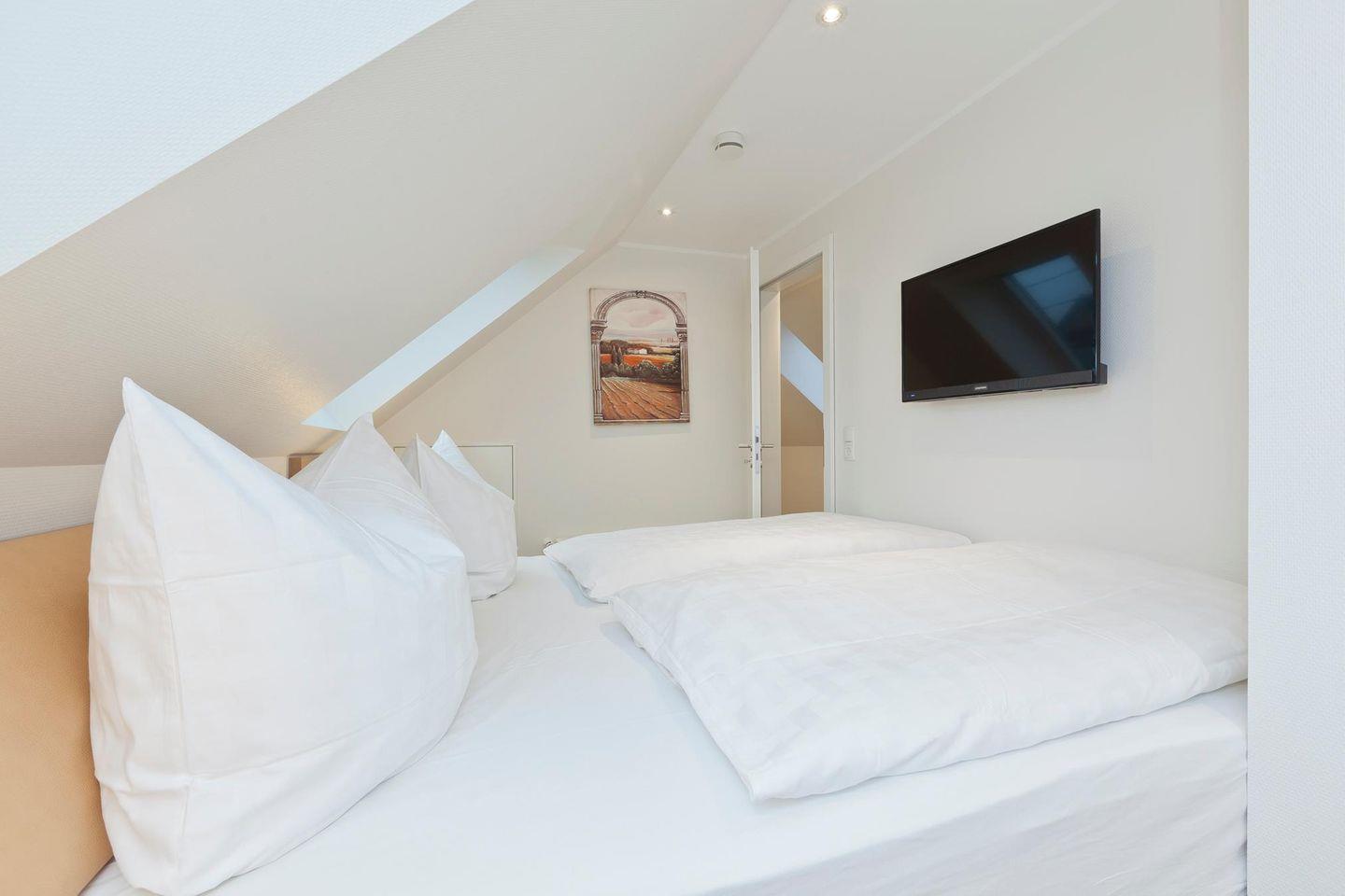 Die Wohnung Nr. 6 erstreckt sich über zwei Etagen und bietet mit drei Schlafzimmern und zwei Badezimmern ausreichend Platz und Privatsphäre für bis zu sechs Personen. Jedes Schlafzimmer ist mit einem Doppelbett ausgestattet. Das Wohnzimmer liegt in der zweiten Etage. Die angrenzende Küchenecke ist voll ausgestattet und bietet auch einen Essbereich. Die beiden modernen Badezimmer befinden sich jeweils auf der zweiten und dritten Etage und sind mit einer Dusche und einem WC ausgestattet. Darüber hinaus bietet die Wohnung einen Loungebereich in der dritten Etage. Die Wohnung verfügt über einen Balkon. Waschmaschine und Wäschetrockner befinden sich im Haus und stehen (für die gemeinschaftliche Nutzung gegen Münzeinwurf) zur Verfügung, was besonders für längere Aufenthalte von Vorteil ist. Hunde sind in dieser Ferienwohnung nicht erlaubt.