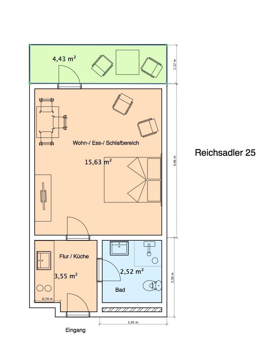 Das 1-Raum-Apartment ist mit einem Doppelbett (160 cm breit) ausgestattet und bietet Platz für bis zu 2 Personen. Weiter verfügt die Wohnung über ein modernes Bad mit Dusche und WC sowie eine gut ausgestattete Küchenzeile. Der Balkon der Wohnung liegt zur Südseite. Im Haus stehen eine Waschmaschine und ein Wäschetrockner zur gemeinsamen Nutzung (ggfs. gegen Gebühr) zur Verfügung. Die Wohnung hat kein WLAN. Hunde sind in dieser Ferienwohnung nicht erlaubt.