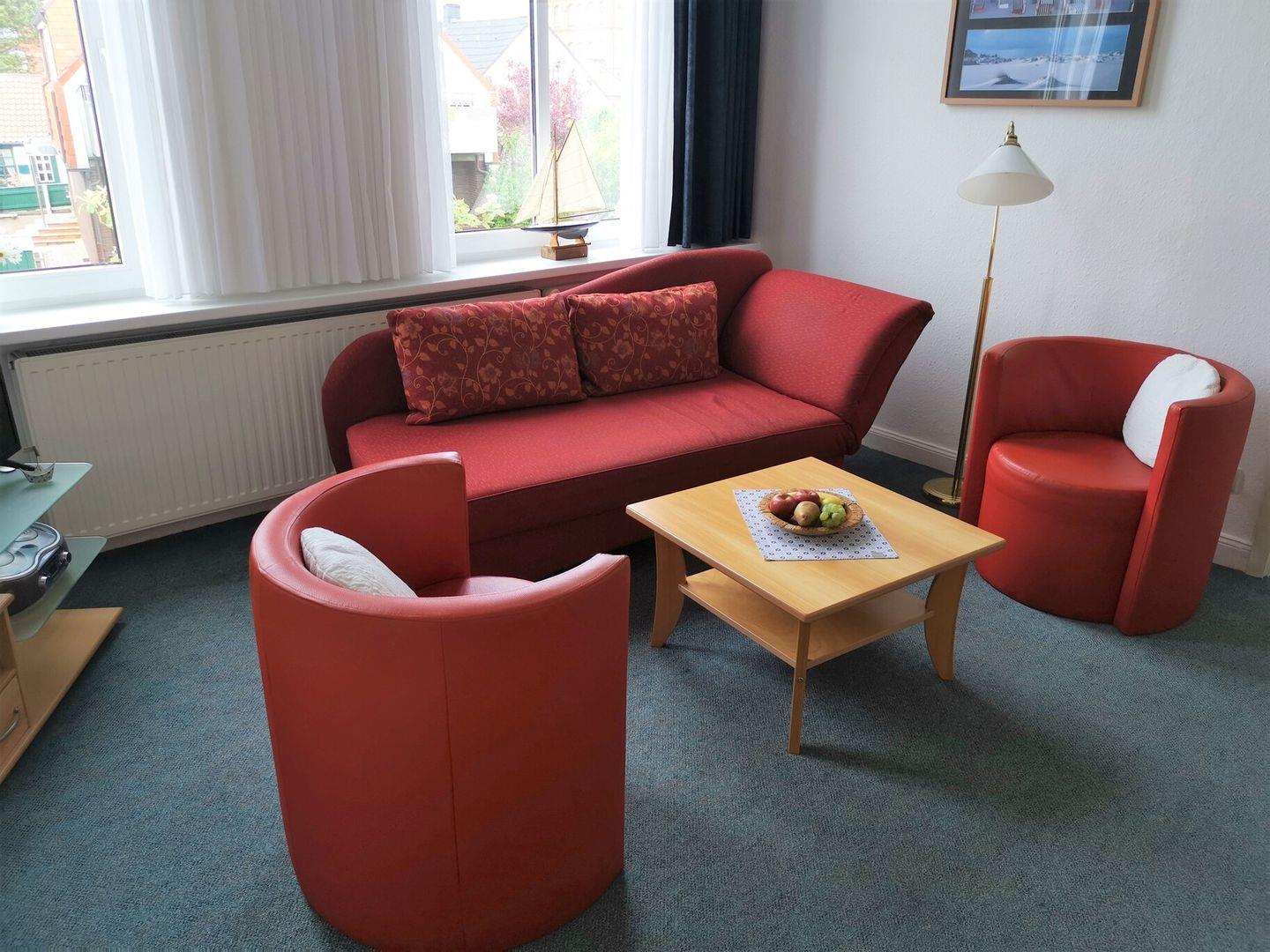 Die gemütliche Wohnung im 1. OG verfügt über ein separates Schlafzimmer mit Doppelbett, separate Küchenzeile (4-Platten-Herd), Dusche/WC und Wohn-/ Schlafraum mit Schlafsofa (90x200cm), Kabel-TV und Essecke. WLAN im Haus!