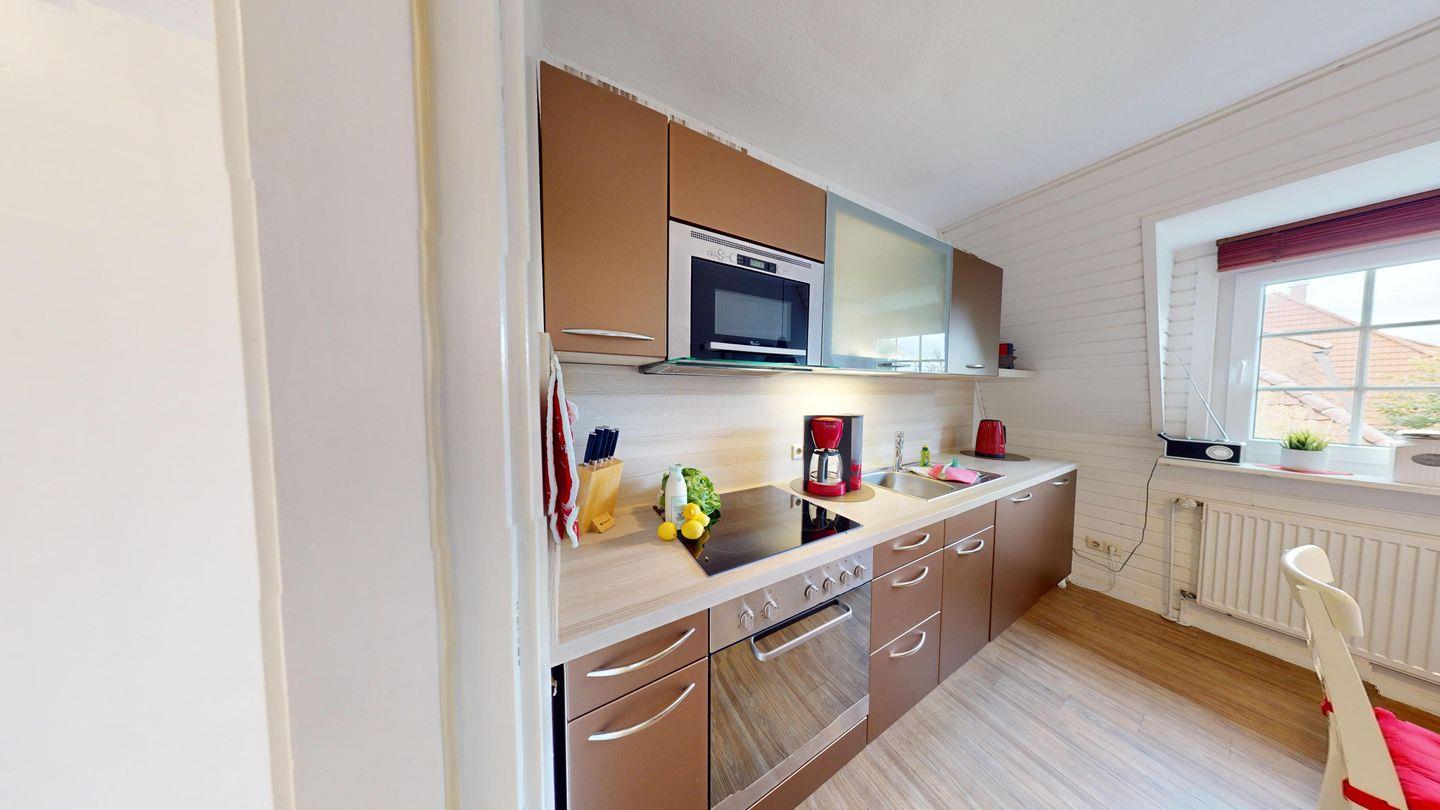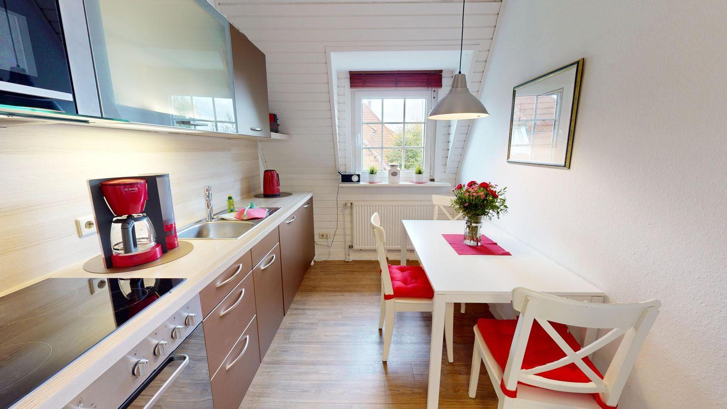 Die Wohnung bietet ein Schlafzimmer mit Doppelbett und ein Wohnzimmer mit einer Sitzecke. Für zusätzliche Gäste steht die Schlafcouch im Wohnbereich bereit, die Platz für bis zu 2 Personen bietet. Zudem ist eine separate Küche (voll ausgestattet) mit einem Essbereich vorhanden. Das Badezimmer ist mit einer Dusche und einer Badewanne eingerichtet. Hier darf auch der vierbeinige Freund mitkommen, denn die Ferienwohnung heißt auch Hunde herzlich willkommen. Erlaubt ist maximal 1 Hund (Höhe maximal kniehoch). Die Hundewiese befindet sich in der Nähe des Fährhafens (kein Leinenzwang).