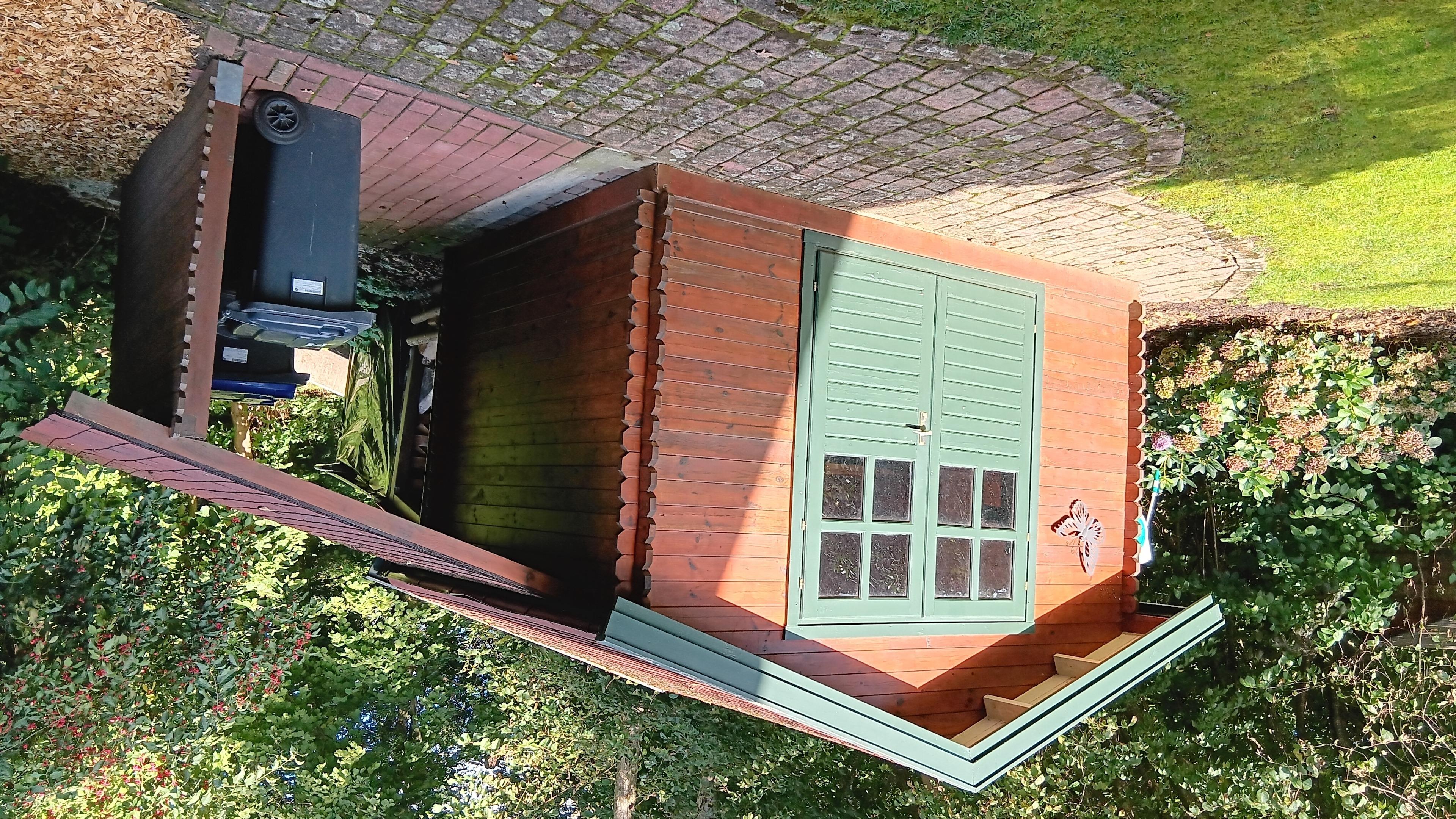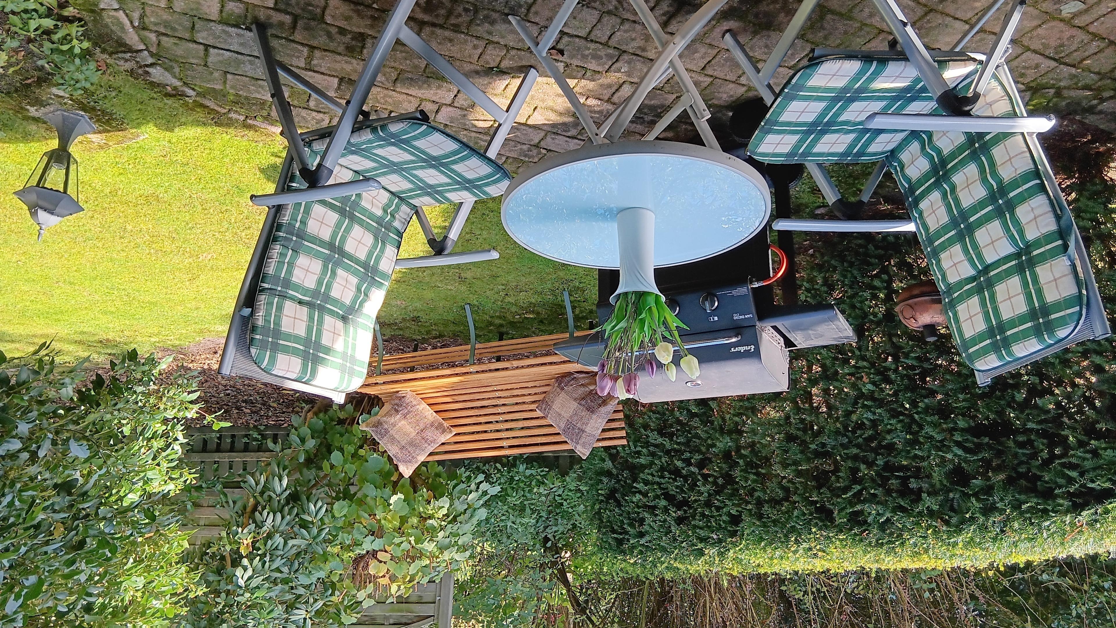 Eine mit Gartenmöbeln ausgestatte Terrasse ist vom Wohnzimmer aus zu erreichen. Hier können Sie vor neugierigen Blicken geschützt bei gutem Wetter die Seele baumeln lassen oder grillen.