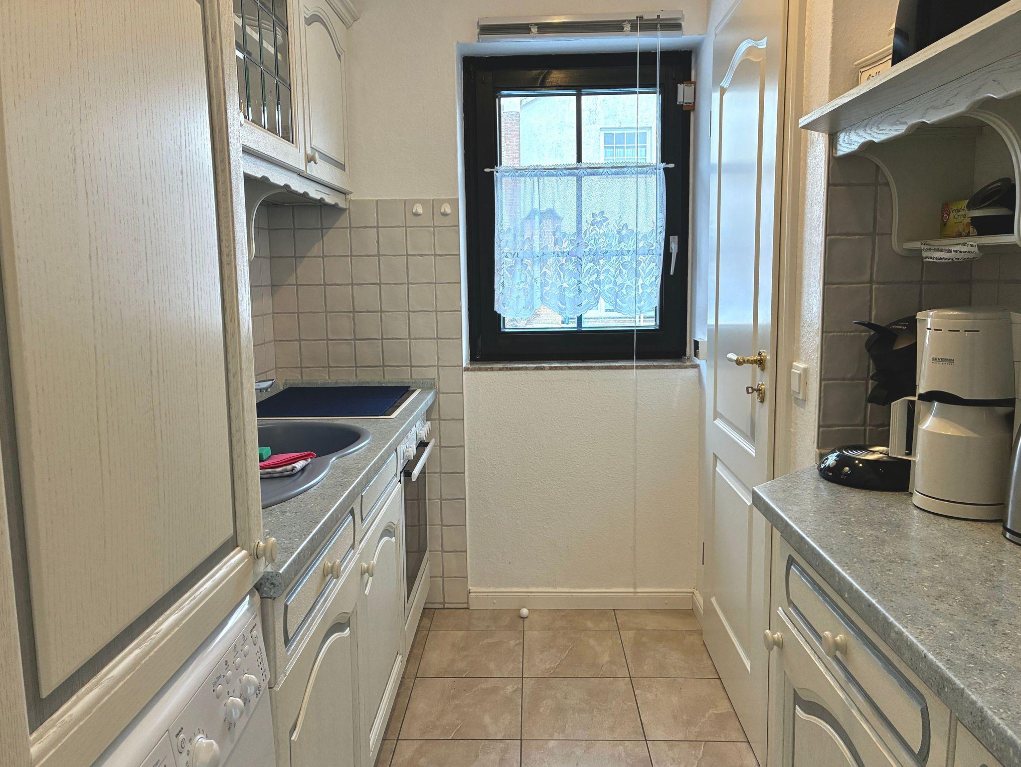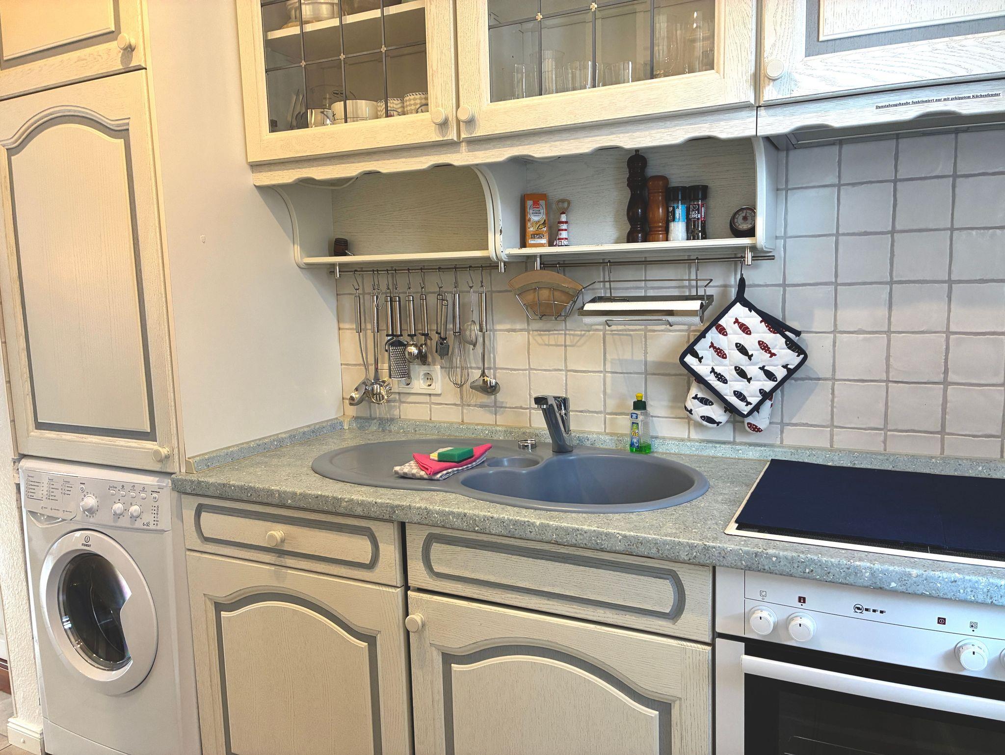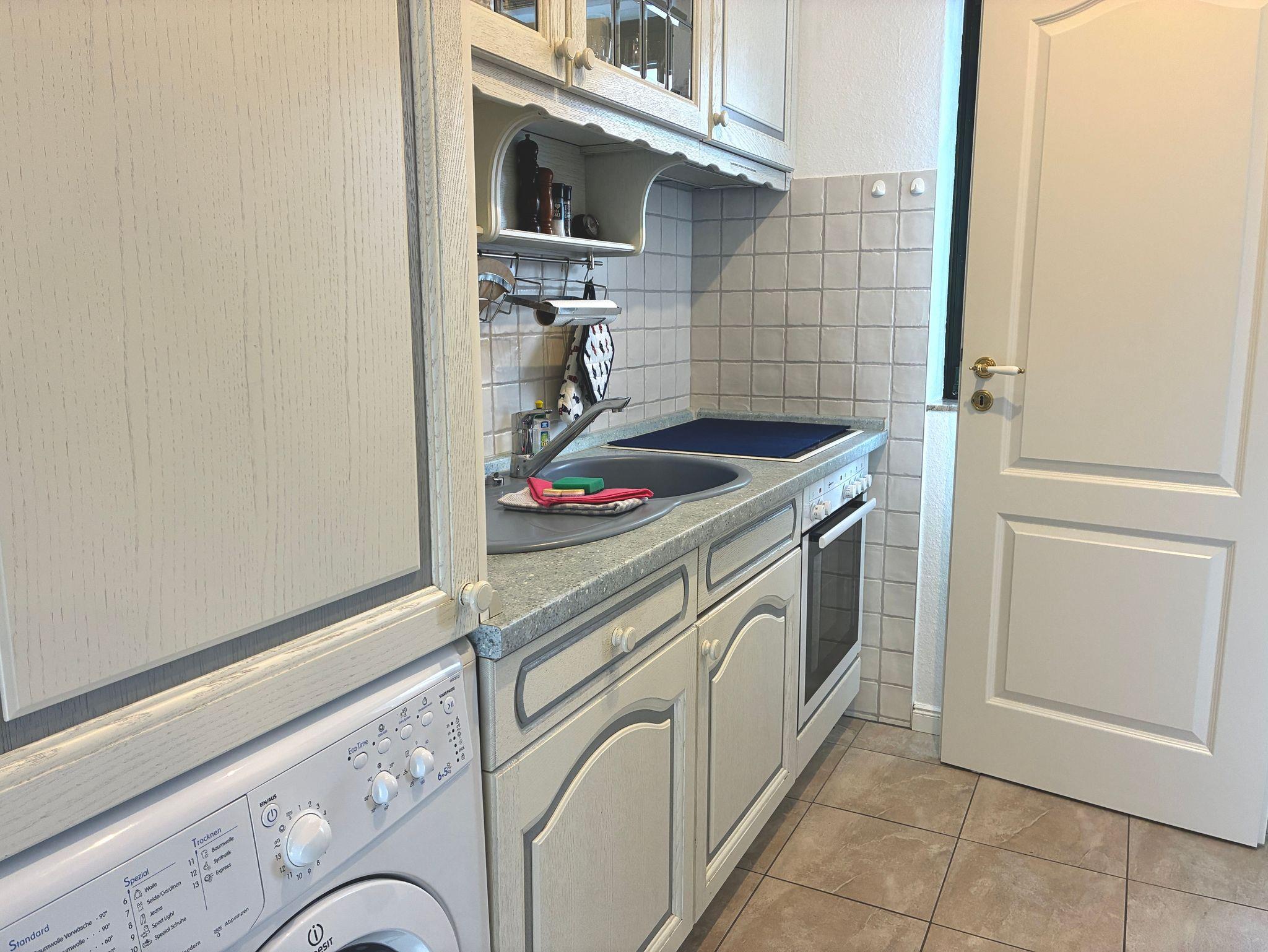 Die Küche ist über einen offenen Bogen mit dem Wohnbereich verbunden und fügt sich harmonisch in das Raumkonzept ein. Ein Fenster sorgt für zusätzliches Tageslicht und unterstreicht den freundlichen Charakter des Raumes. Die Ausstattung ist funktional und bietet alles für den täglichen Komfort, darunter eine Spülmaschine, eine Gefriermöglichkeit sowie eine Kaffeemaschine. Auch eine Waschmaschine und ein Trockner stehen zur Verfügung. Ein separates Gäste-WC ergänzt das Erdgeschoss.