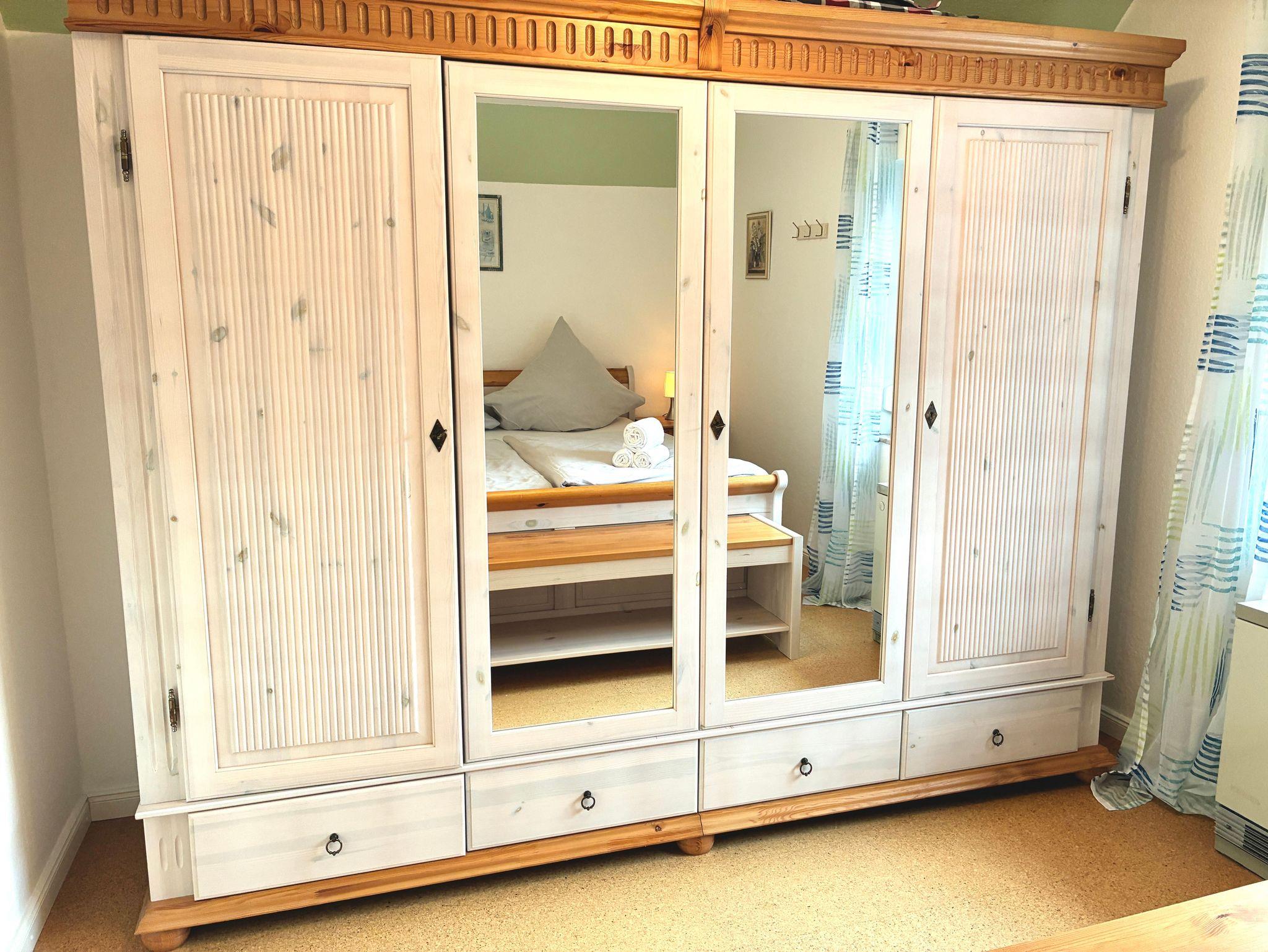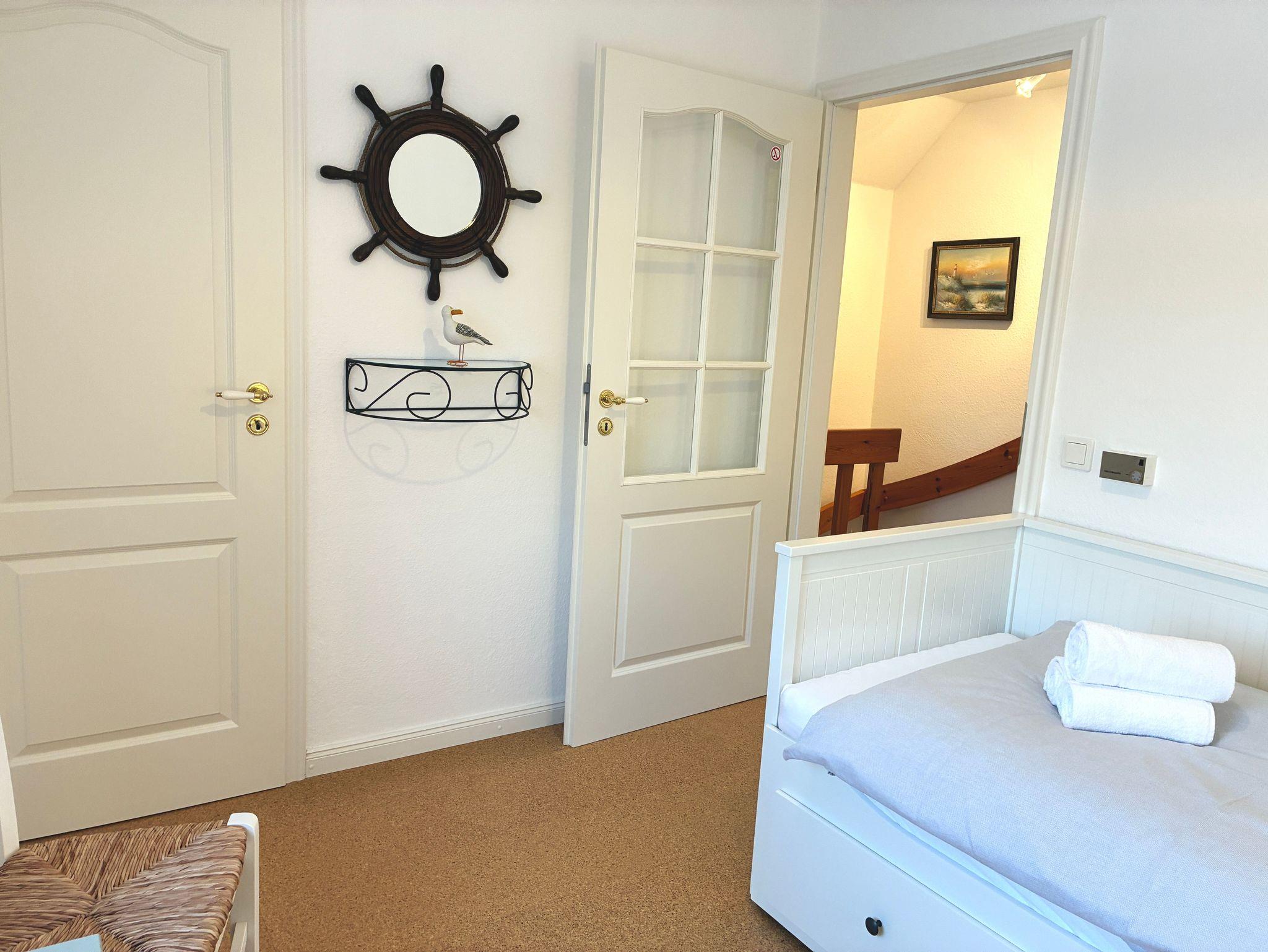 Über eine Holztreppe gelangen Sie in das Obergeschoss. Hier befinden sich die beiden Schlafzimmer sowie das moderne Duschbad. Ein Schlafzimmer ist mit einem Doppelbett und Kleiderschrank ausgestattet, das zweite mit einem Einzelbett. Beide Räume sind ruhig und klar gestaltet und lassen sich dank elektrischer Außenjalousien vollständig abdunkeln, ideal für erholsame Nächte. Auch das Duschbad liegt auf dieser Etage und fügt sich modern in das Gesamtbild ein.
