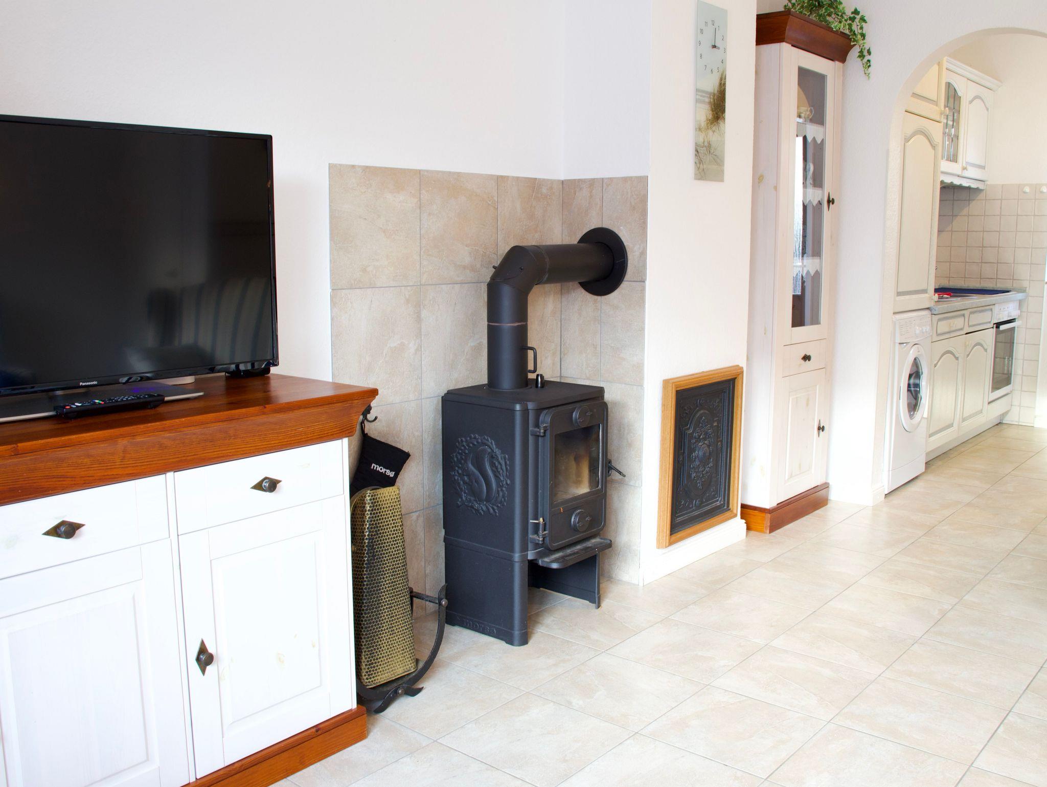 Im Erdgeschoss öffnet sich der Wohnbereich mit Essecke, gemütlichem Sofa und Sesseln. Große Fenster lassen viel Tageslicht in den Raum und sorgen für eine ruhige, einladende Stimmung. Der Kaminofen bildet dabei einen behaglichen Mittelpunkt, besonders an kühleren Tagen. Ein Smart-TV ergänzt den Komfort an ruhigeren Abenden. Vom Wohnbereich aus gelangen Sie direkt auf die möblierte Sonnenterrasse mit kleinem Garten, ein geschützter Ort, um den Tag draußen zu beginnen oder ausklingen zu lassen.