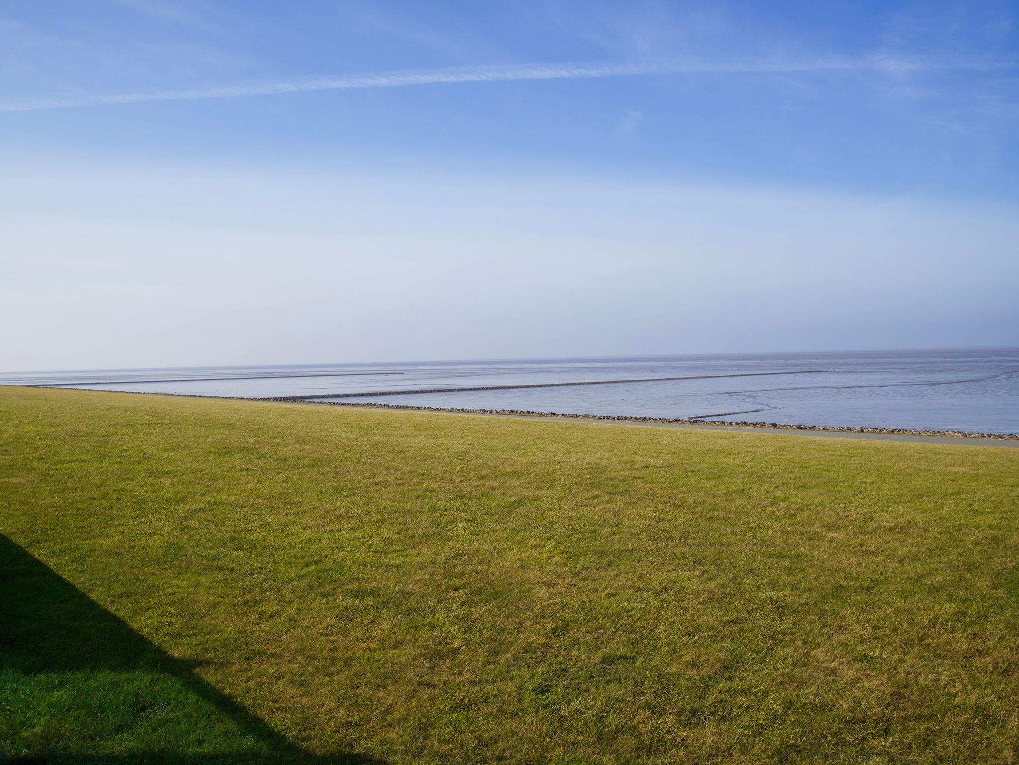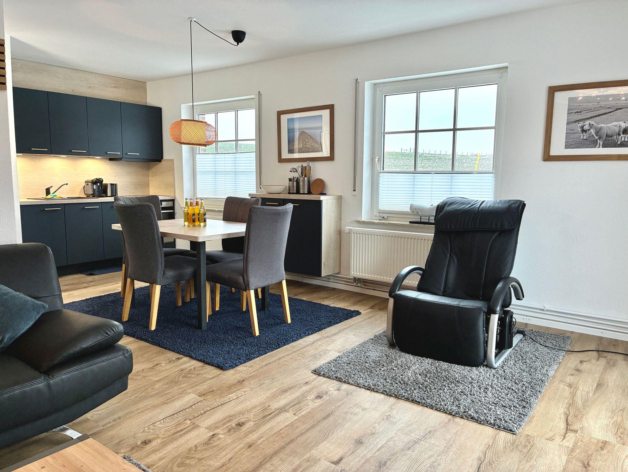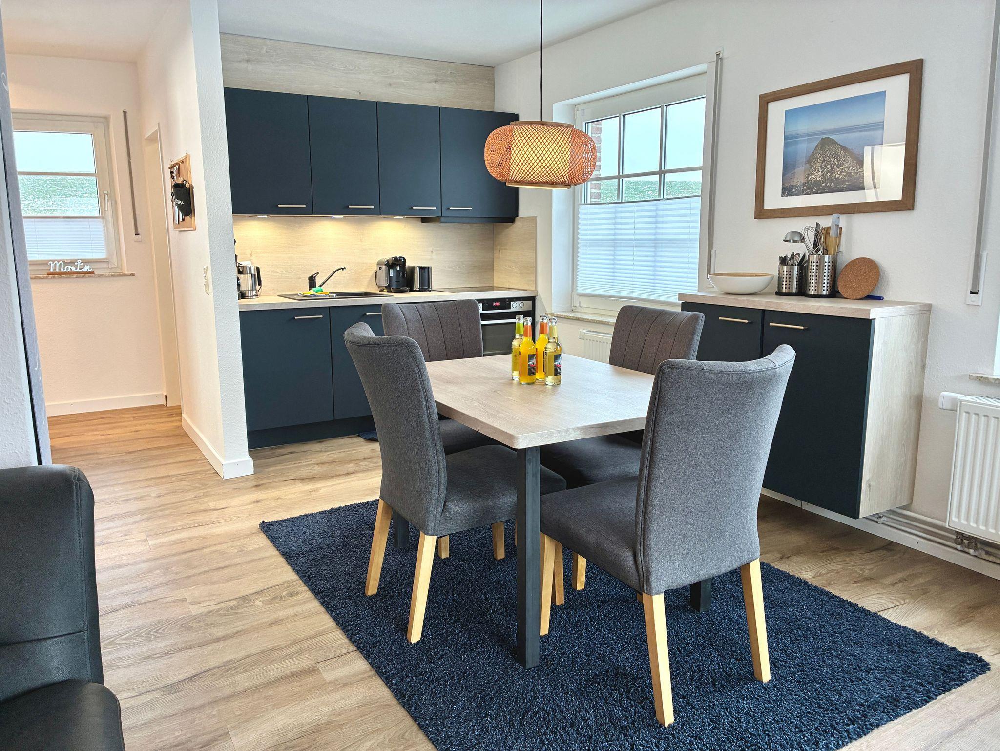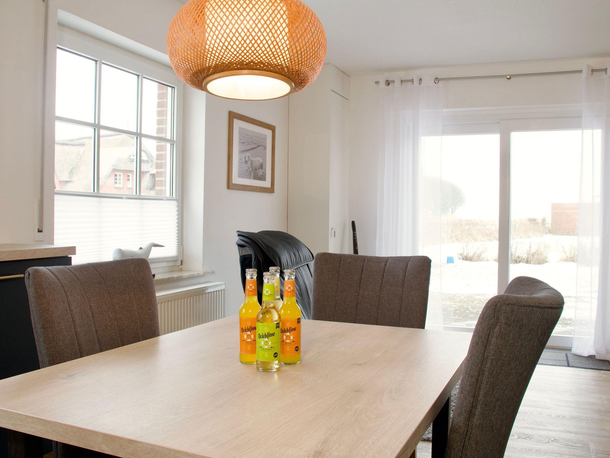 Die Küche ist modern und funktional ausgestattet und bietet alles, was für die Selbstversorgung benötigt wird. Eine Spülmaschine, eine Gefriermöglichkeit sowie eine Kaffeemaschine stehen zur Verfügung. Ein großes Fenster mit Blick auf den Deich unterstreicht den offenen, hellen Charakter des Raumes. Zusätzlich befindet sich im Erdgeschoss ein Gäste-WC.
