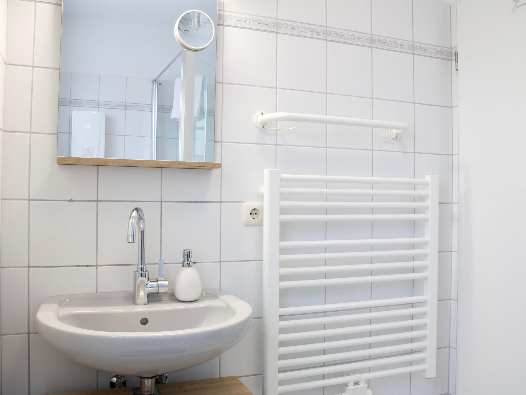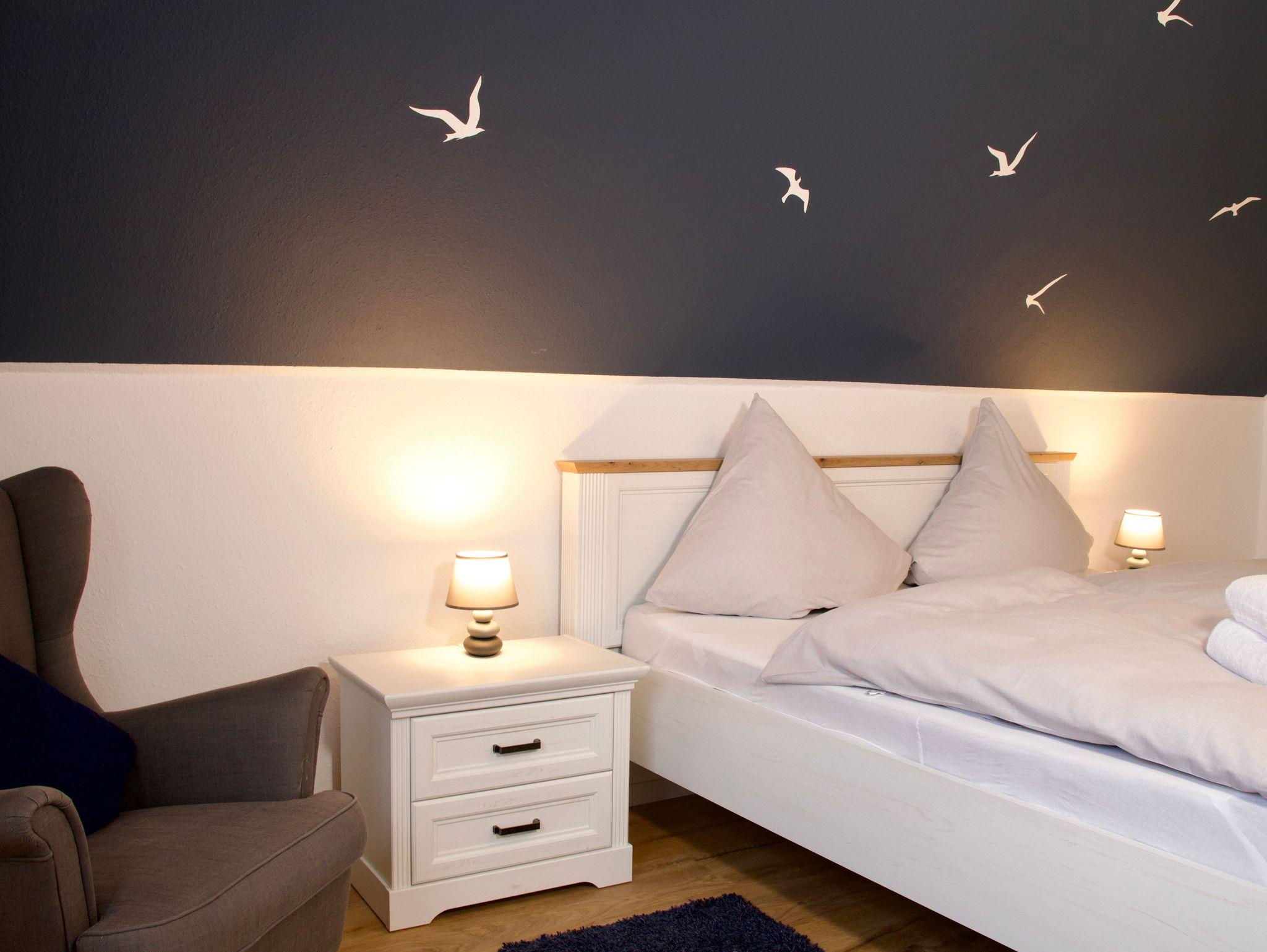 Im Obergeschoss befinden sich zwei Schlafzimmer sowie das Badezimmer. Ein Schlafzimmer ist mit einem Doppelbett in der Größe 180 x 200 Zentimeter ausgestattet, das zweite verfügt über zwei Einzelbetten mit den Maßen 90 x 200 Zentimeter. Das moderne Badezimmer bietet eine Walk-In-Dusche und ergänzt das Raumangebot zeitgemäß und funktional.