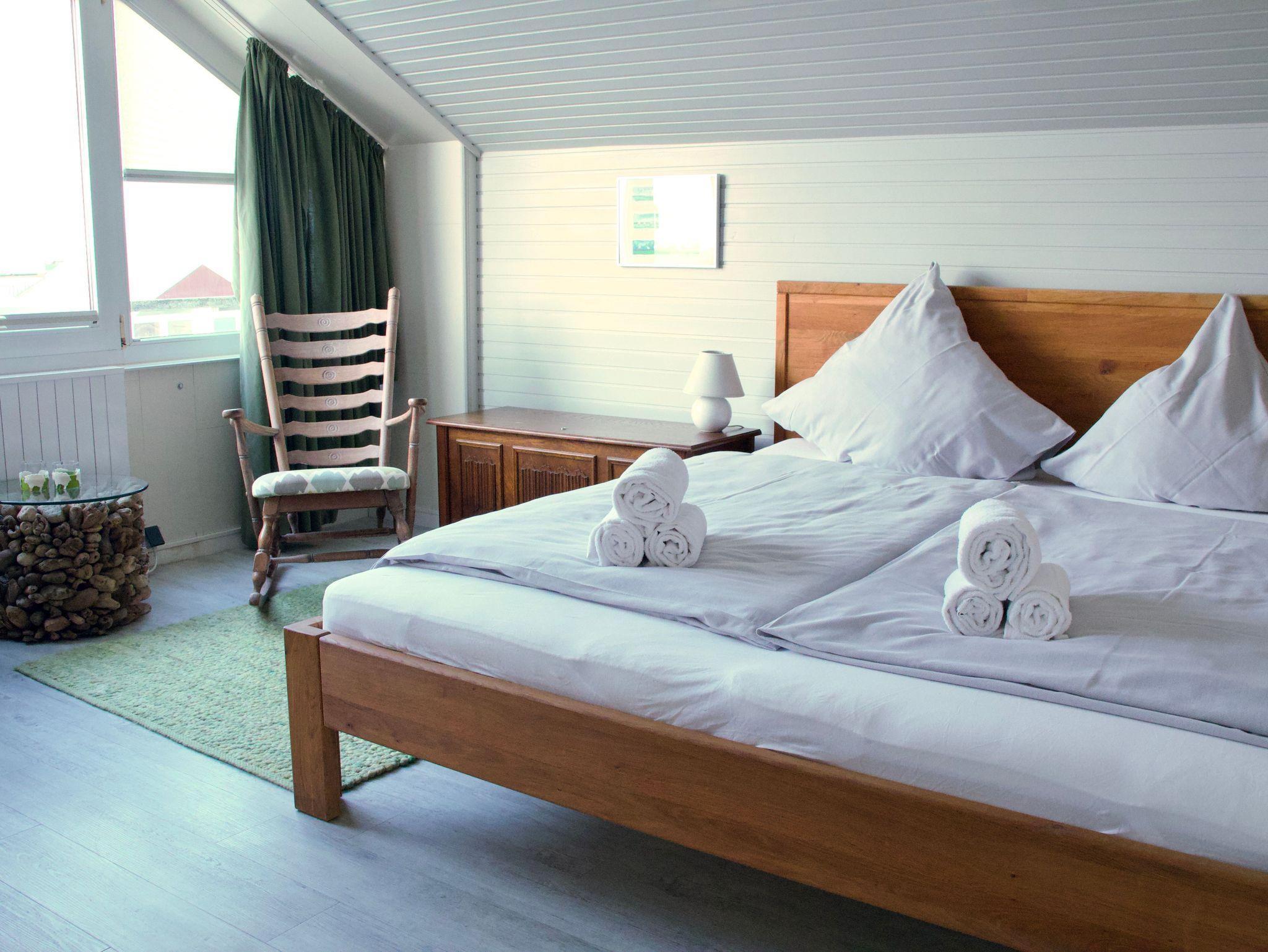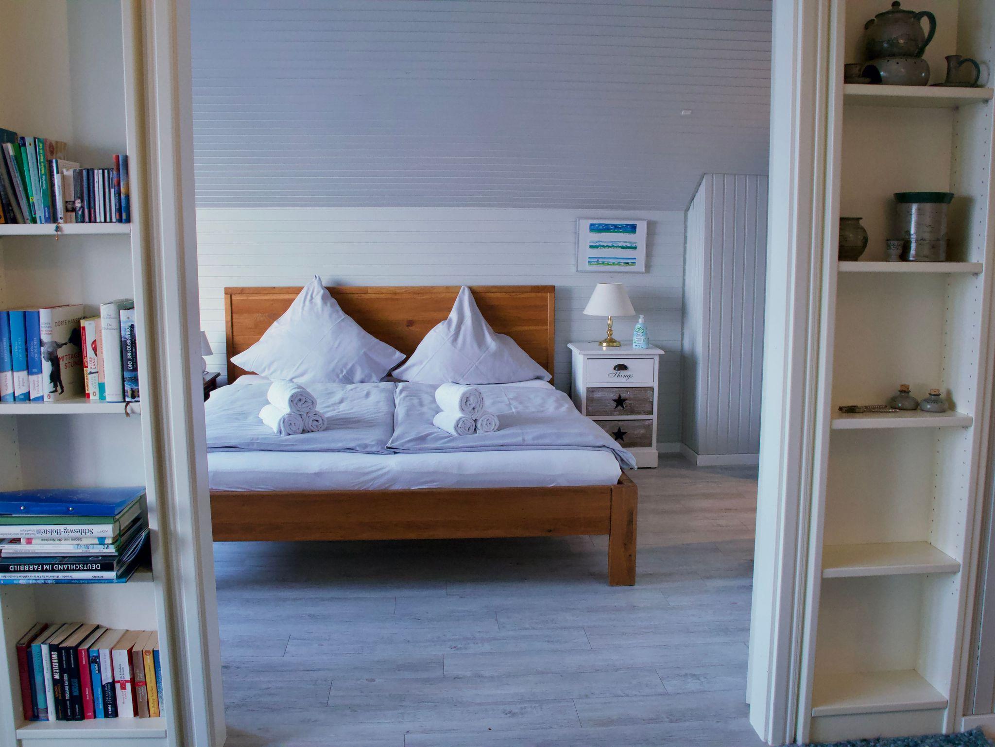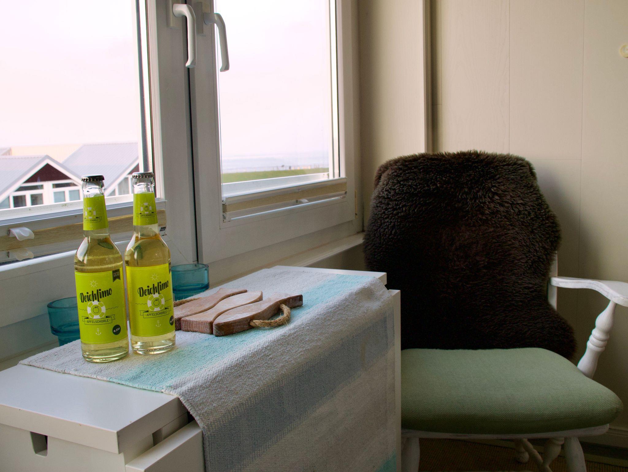 Die helle und liebevoll eingerichtete Wohnung greift den Charakter der nordfriesischen Küstenlandschaft auf und wirkt ruhig und einladend. Viele Fenster sorgen für eine freundliche Atmosphäre und lassen viel Tageslicht in die Räume. Eine ruhige Essecke an der Fensterfront bietet einen angenehmen Platz, um den Blick nach draußen schweifen zu lassen.