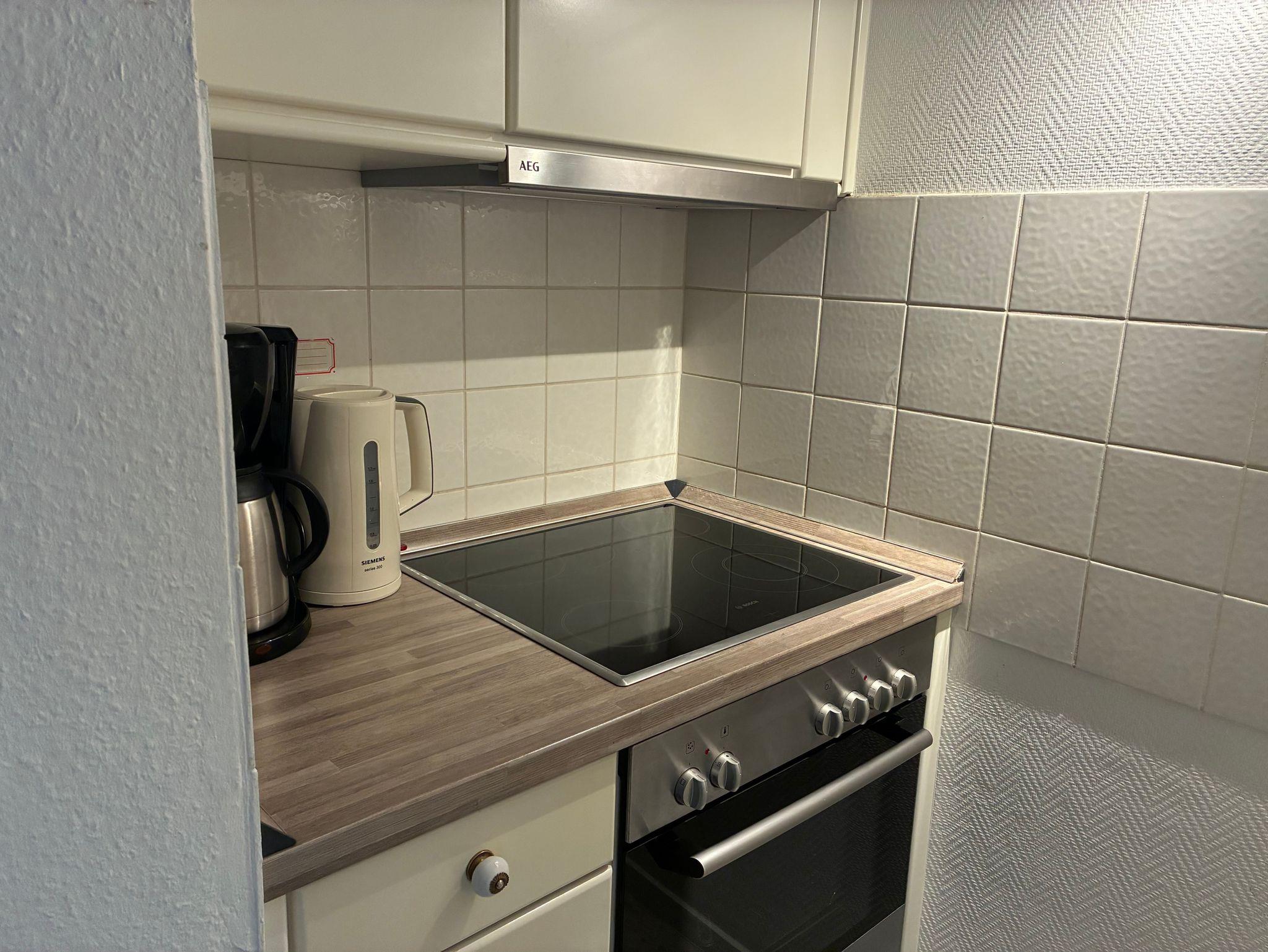 Wohn- und Schlafzimmer können durch eine verglaste Flügeltür miteinander verbunden werden und ermöglichen eine flexible Nutzung der Räume. Das Ecksofa im Wohnbereich kann bei Bedarf als zusätzliche Schlafgelegenheit genutzt werden und verfügt über eine Liegefläche von etwa 180 × 200 Zentimetern. Die Küchennische ist funktional gestaltet und vollständig eingerichtet. Eine Kaffeemaschine sowie eine Gefriermöglichkeit stehen zur Verfügung und unterstützen die Selbstversorgung im Urlaub.