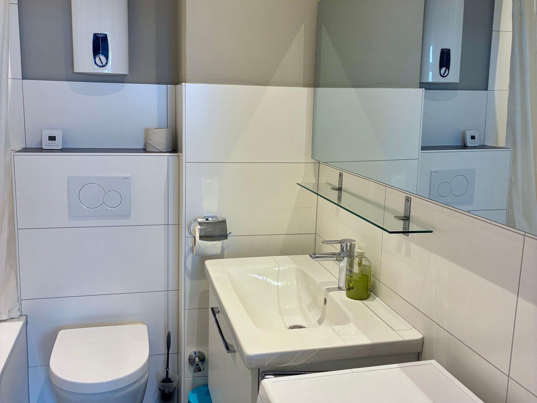 Das Badezimmer ist mit einer Badewanne mit Duschmöglichkeit sowie einer Waschmaschine ausgestattet und bietet auch bei längeren Aufenthalten zusätzlichen Komfort. WLAN steht kostenfrei zur Verfügung, ebenso ein Smart-TV und eine Stereoanlage. Haustiere sind in dieser Wohnung herzlich willkommen.