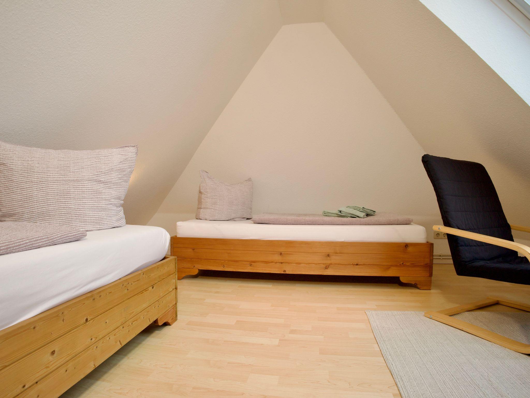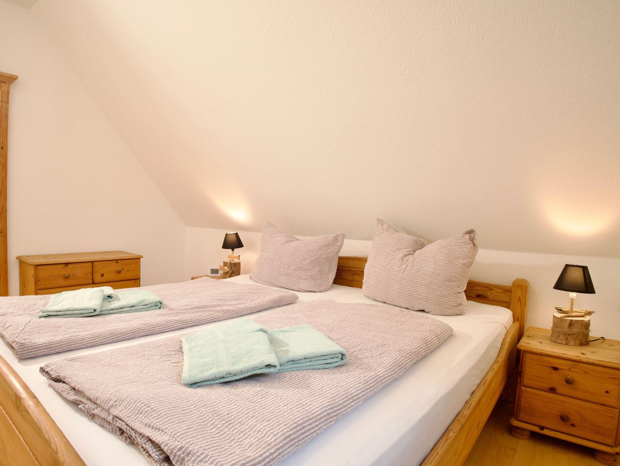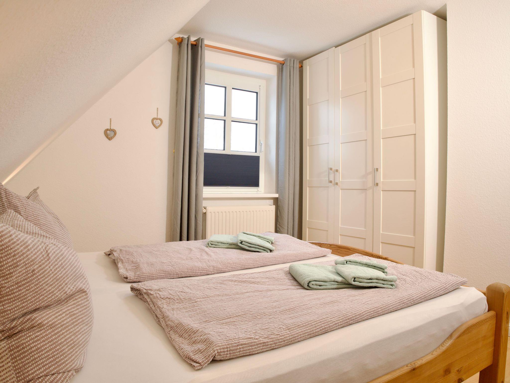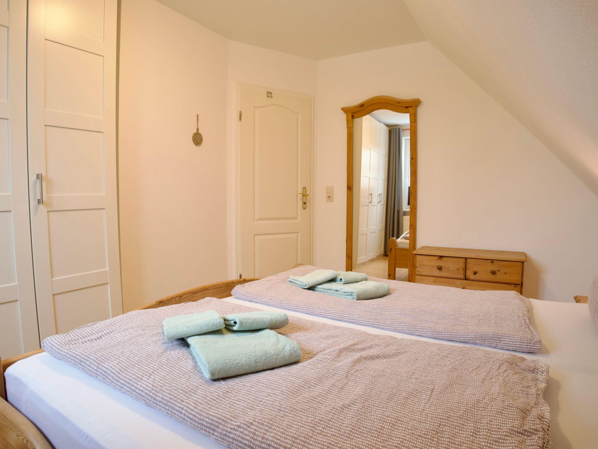 Die Wohnung verfügt über zwei Schlafzimmer. Eines ist mit einem Doppelbett in der Größe 180 × 200 Zentimeter ausgestattet, das zweite mit zwei Einzelbetten à 90 × 200 Zentimeter. Besonders hervorzuheben ist das obere Schlafzimmer, von dem aus sich ein weiter Blick über den Deich bis hin zum Meer eröffnet.