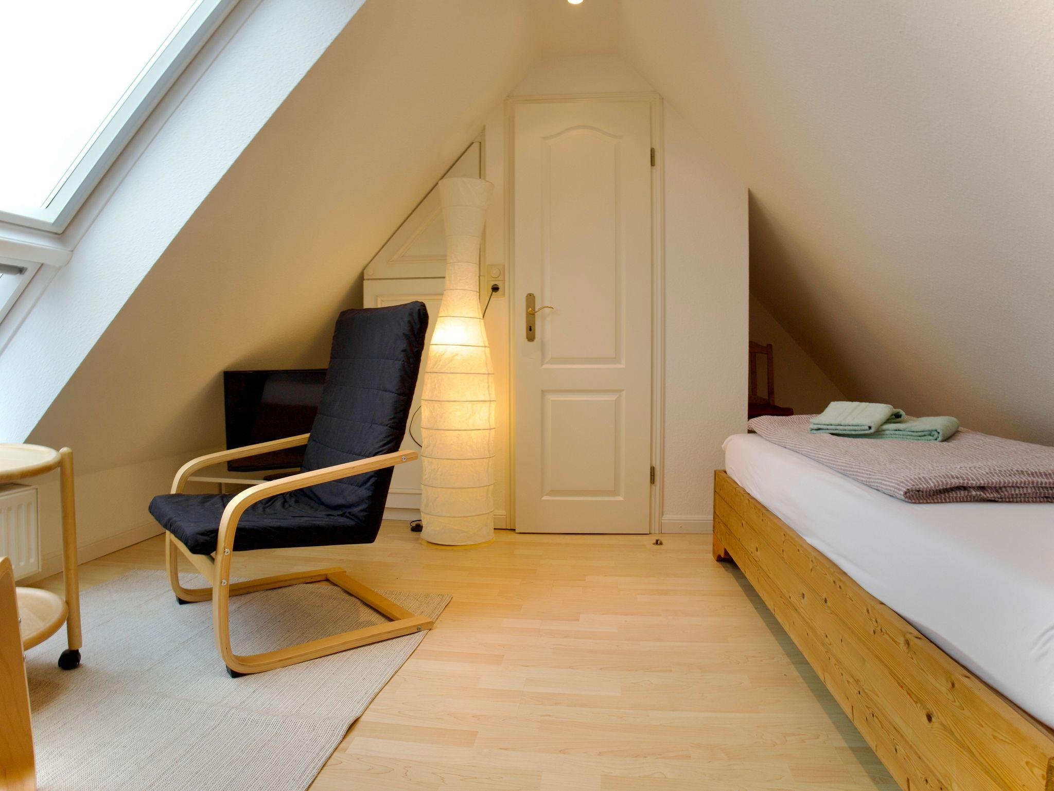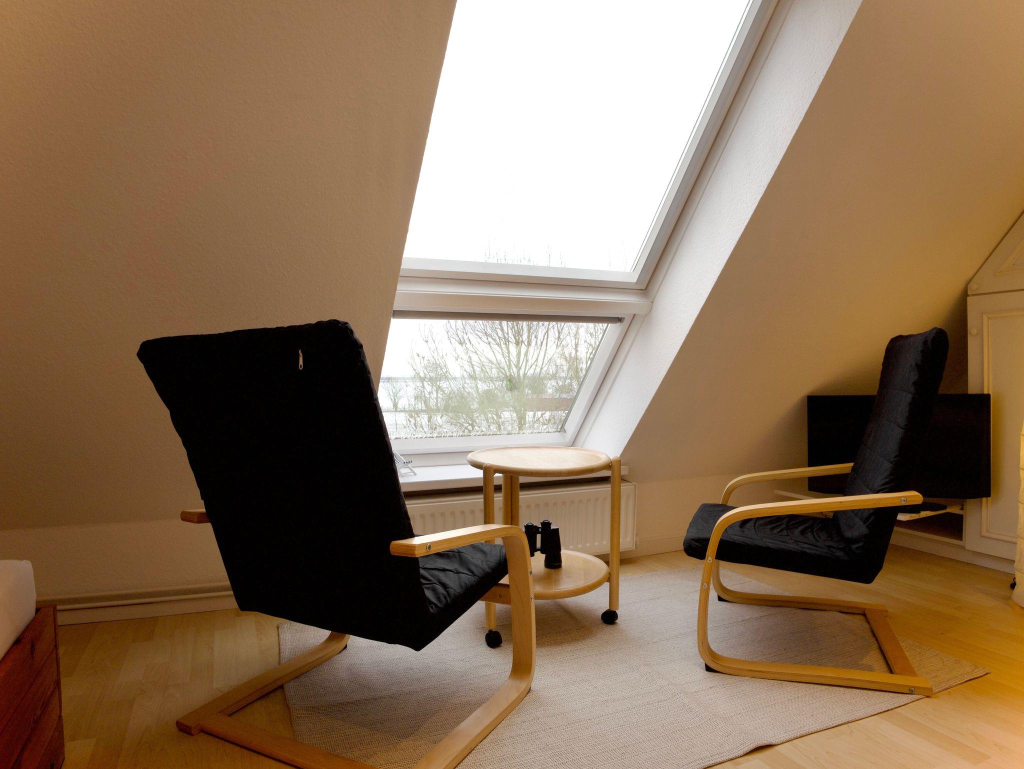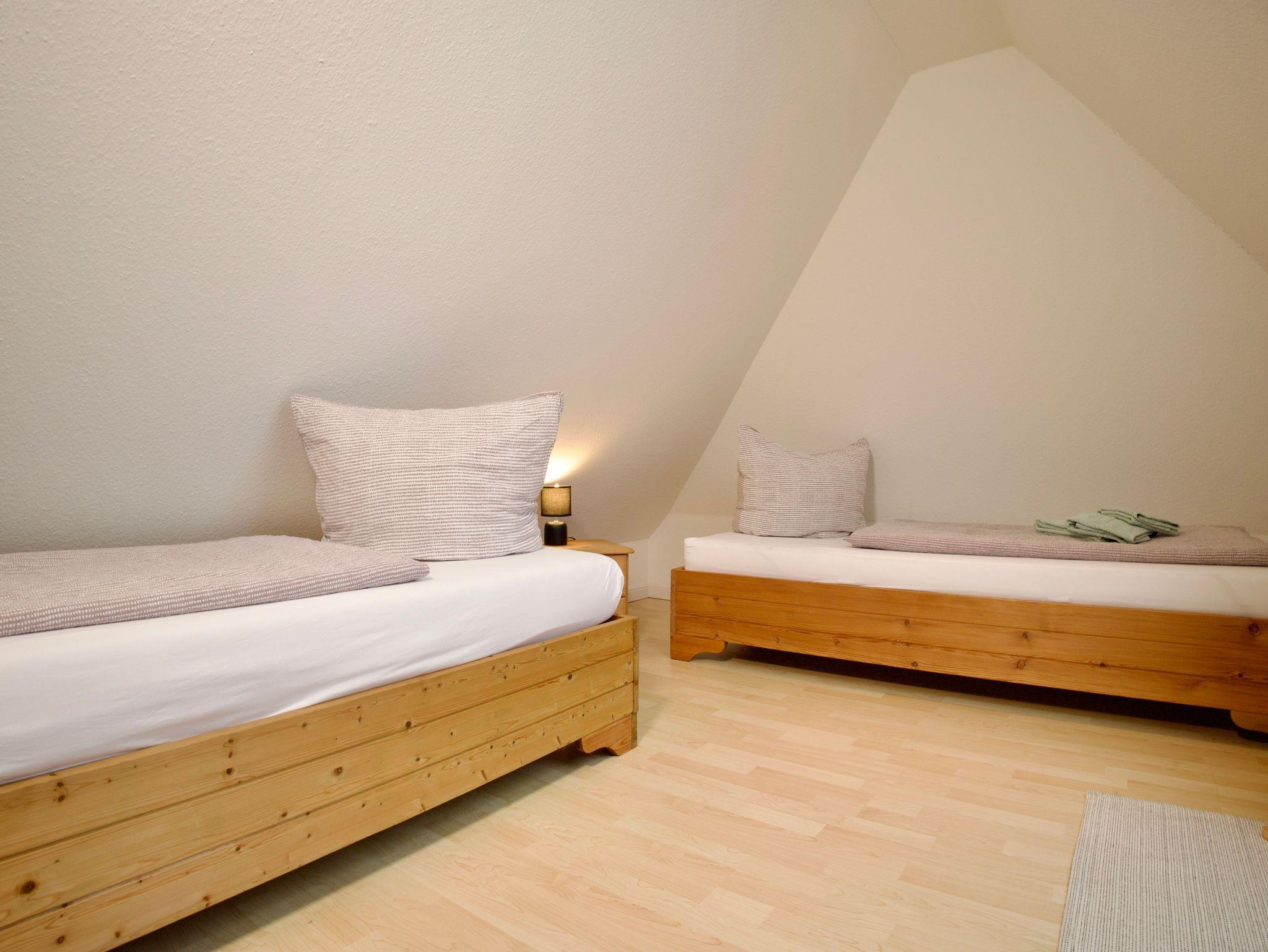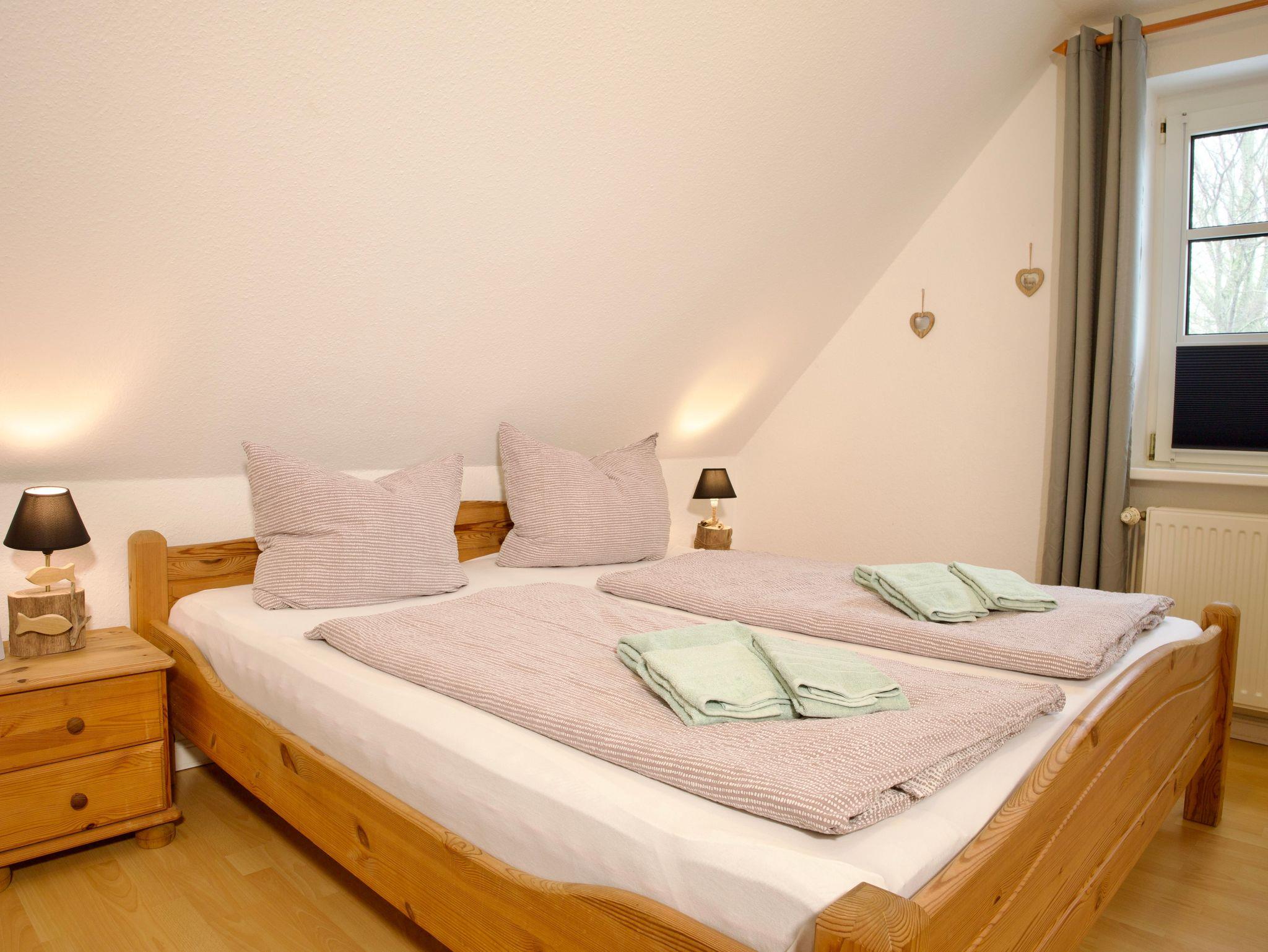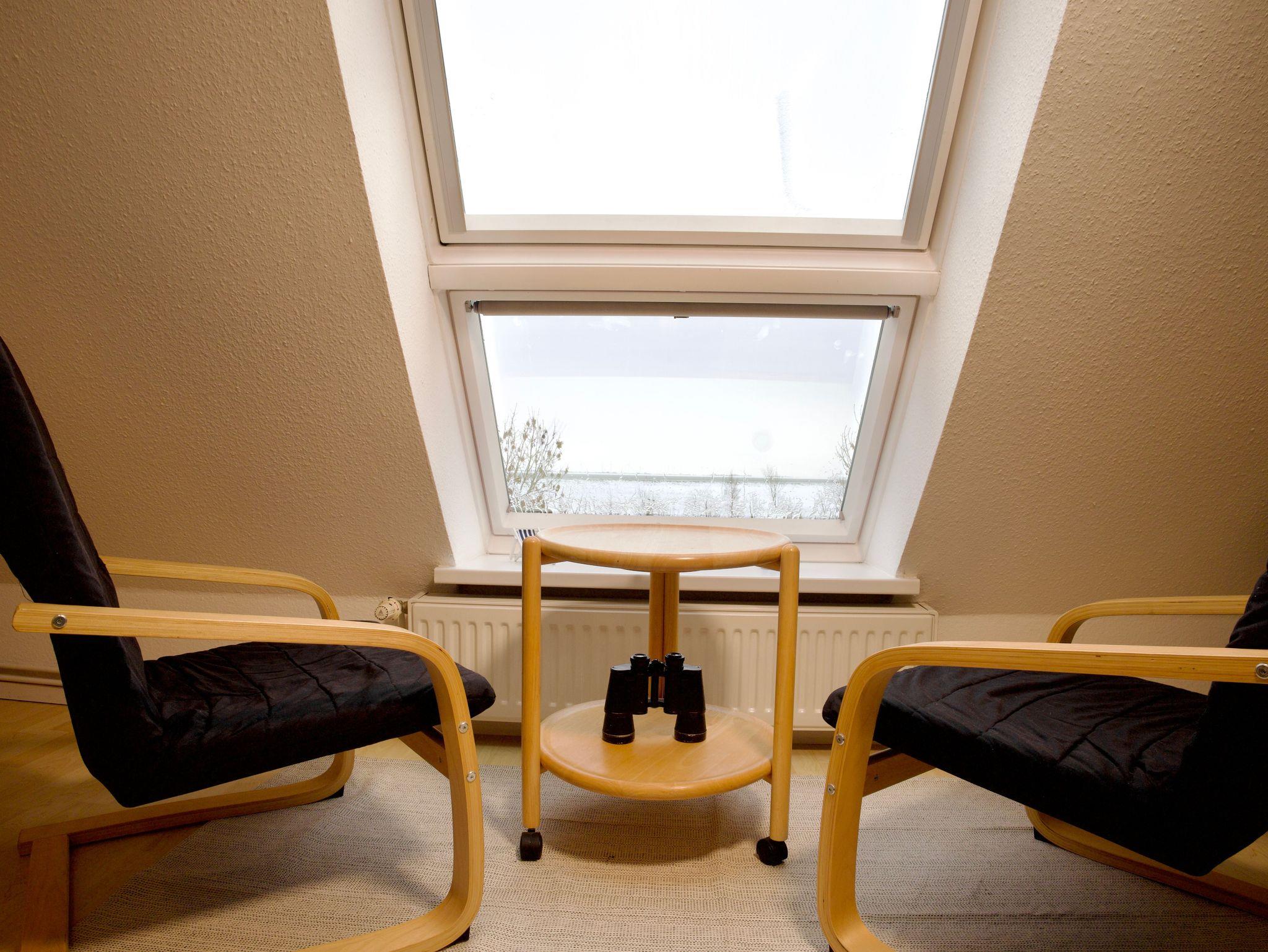 Die Wohnung verfügt über zwei Schlafzimmer. Eines ist mit einem Doppelbett in der Größe 180 × 200 Zentimeter ausgestattet, das zweite mit zwei Einzelbetten à 90 × 200 Zentimeter. Besonders hervorzuheben ist das obere Schlafzimmer, von dem aus sich ein weiter Blick über den Deich bis hin zum Meer eröffnet.