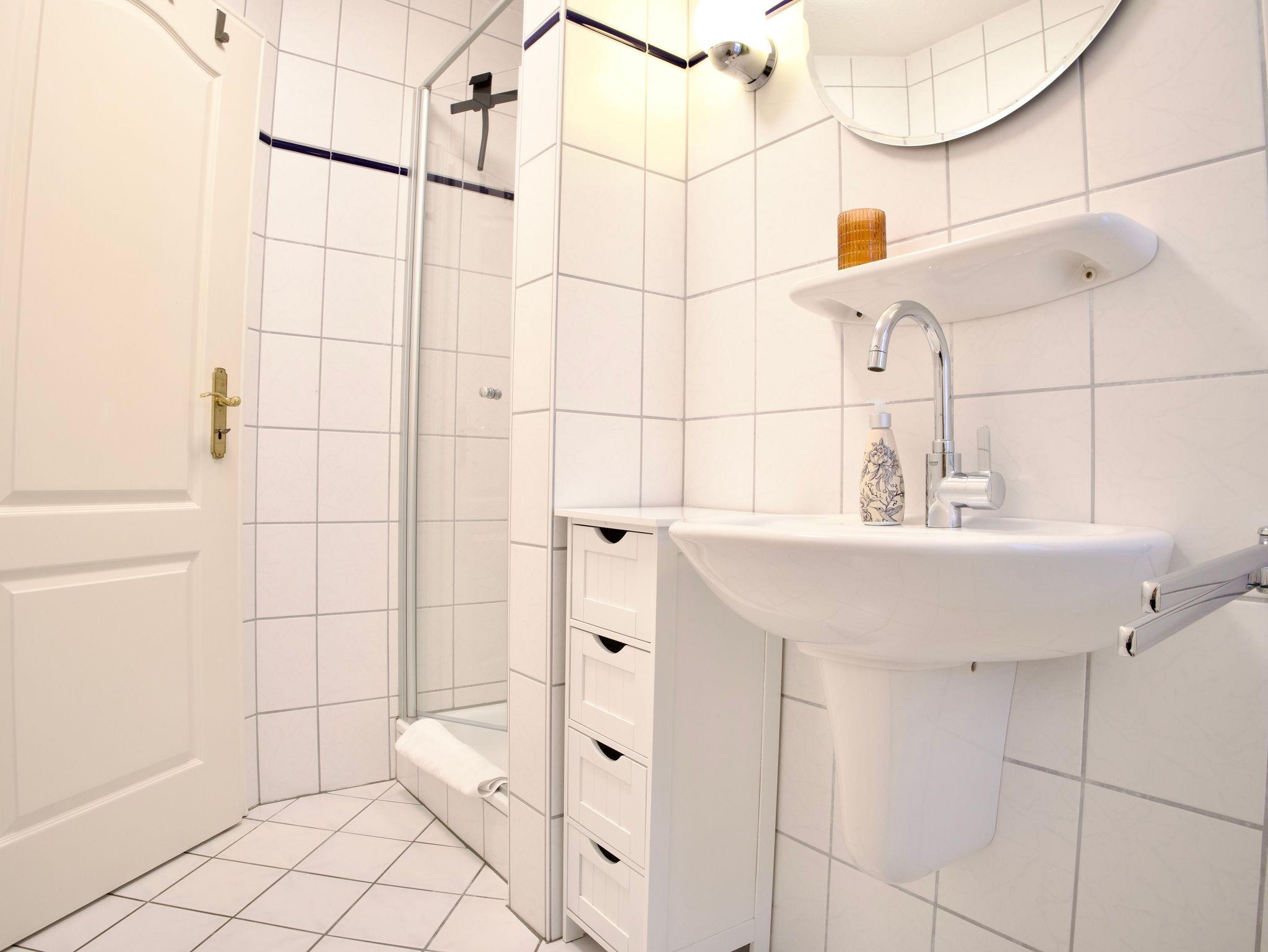Das Badezimmer ist funktional und ruhig gestaltet und fügt sich harmonisch in das Gesamtbild der Wohnung ein. Eine Waschmaschine steht ebenfalls zur Verfügung.