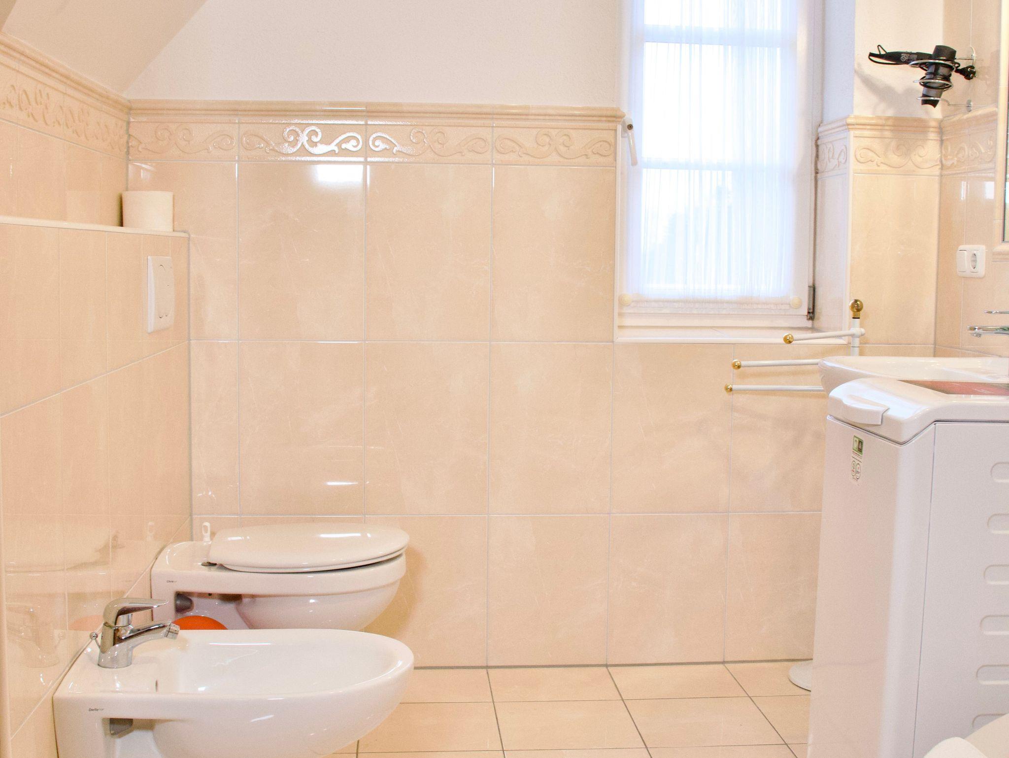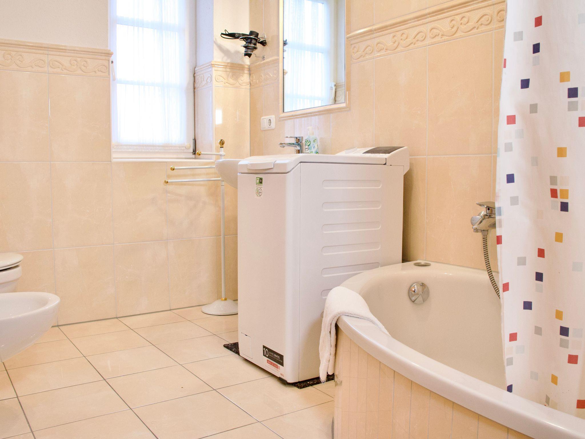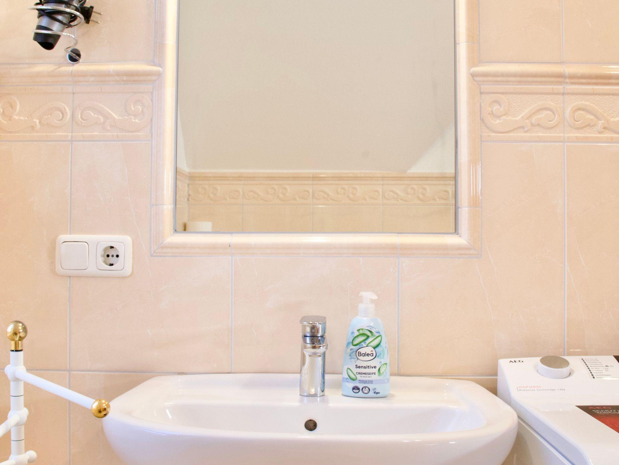 Das helle Badezimmer ist mit einer Duschwanne ausgestattet und fügt sich ruhig und funktional in das Gesamtbild der Wohnung ein.