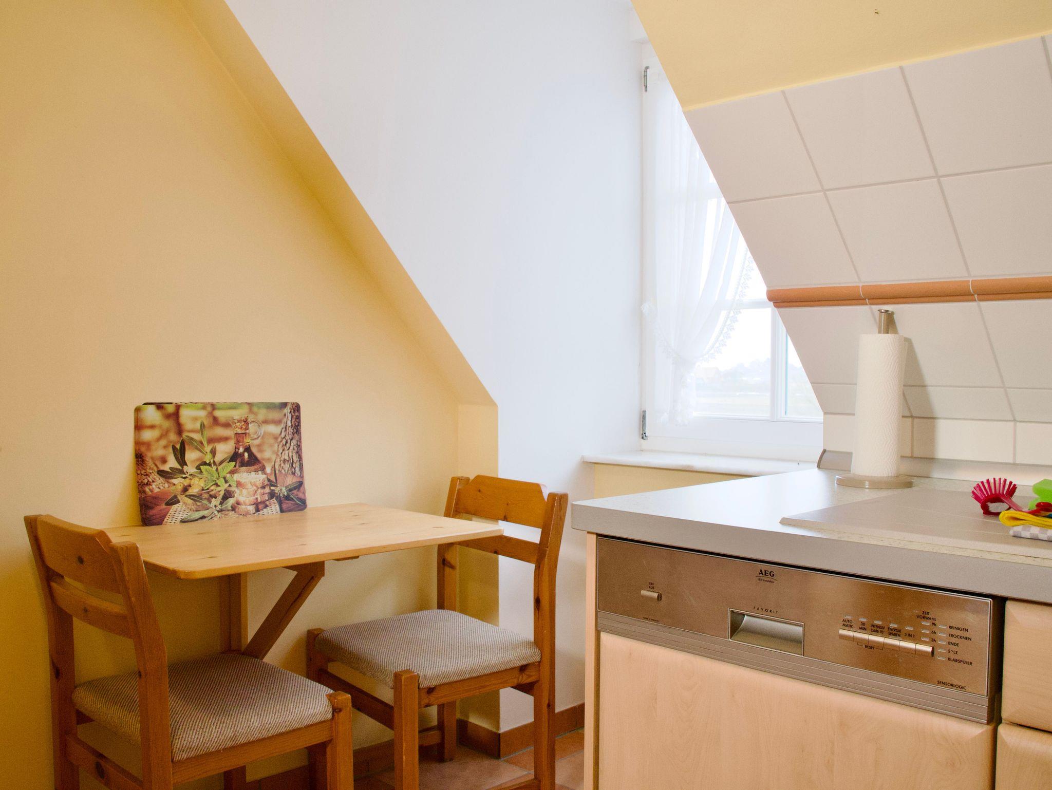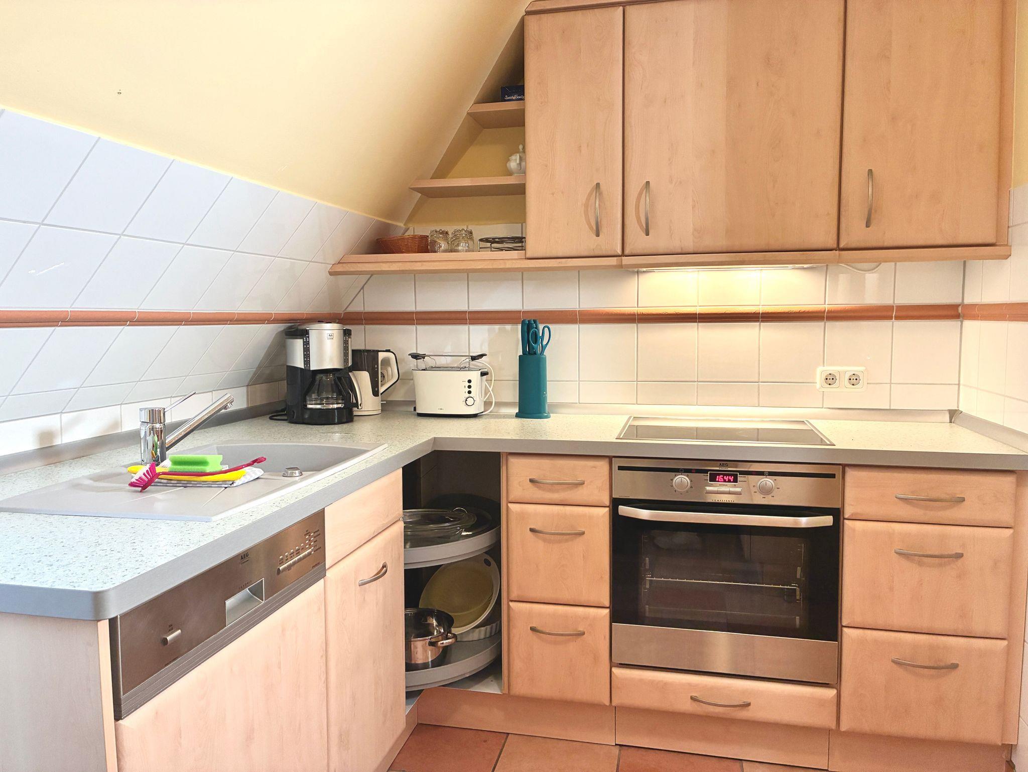 Die Küche ist in Holzoptik gestaltet, lässt keine Wünsche offen und fügt sich harmonisch in den Wohnbereich ein. Sie bietet mit Geschirrspüler, Kaffeemaschine und Gefriermöglichkeit ideale Voraussetzungen für die Selbstversorgung im Urlaub. Auch eine Waschmaschine steht zur Verfügung und ergänzt die Ausstattung praktisch, insbesondere bei längeren Aufenthalten.