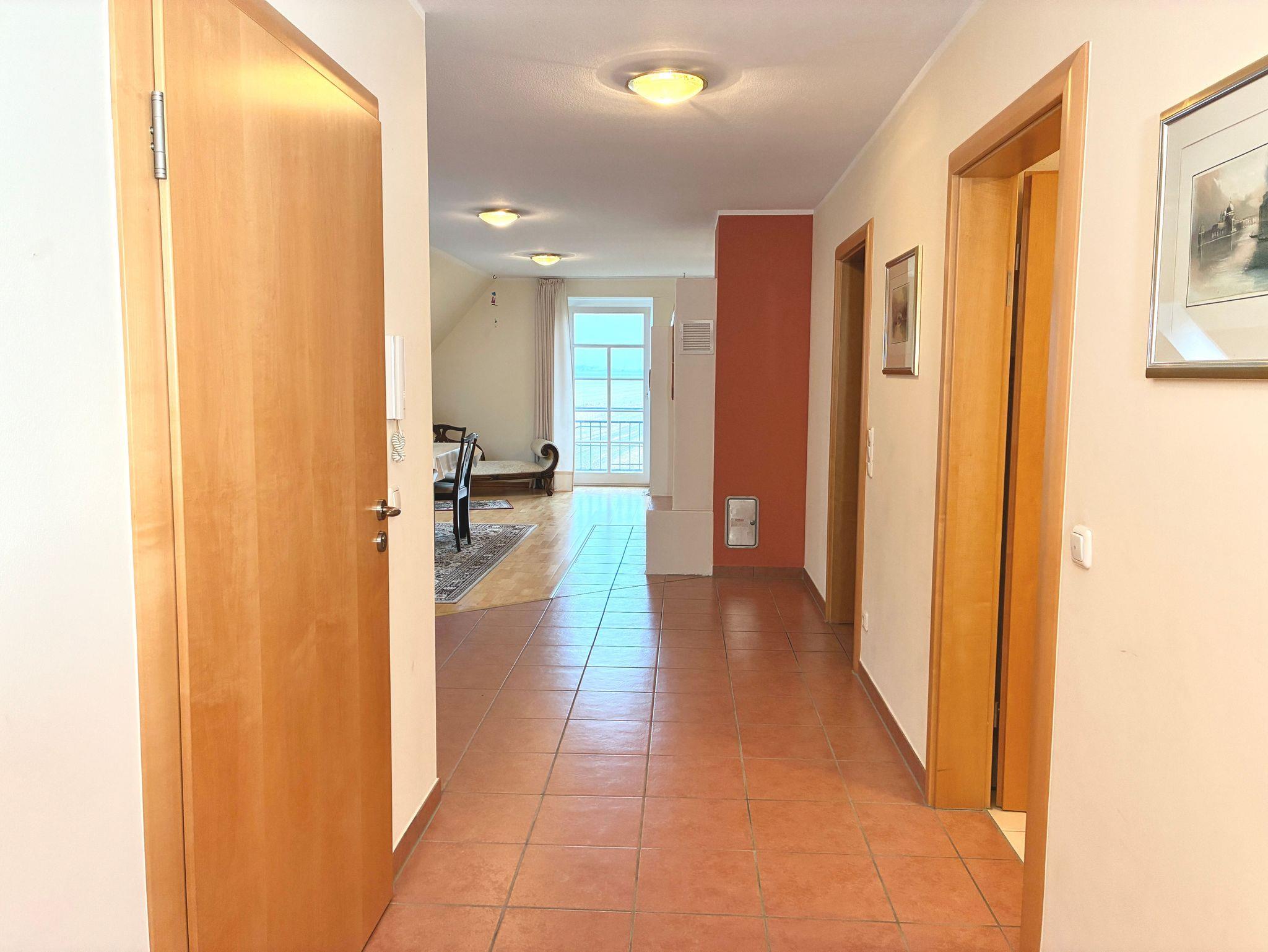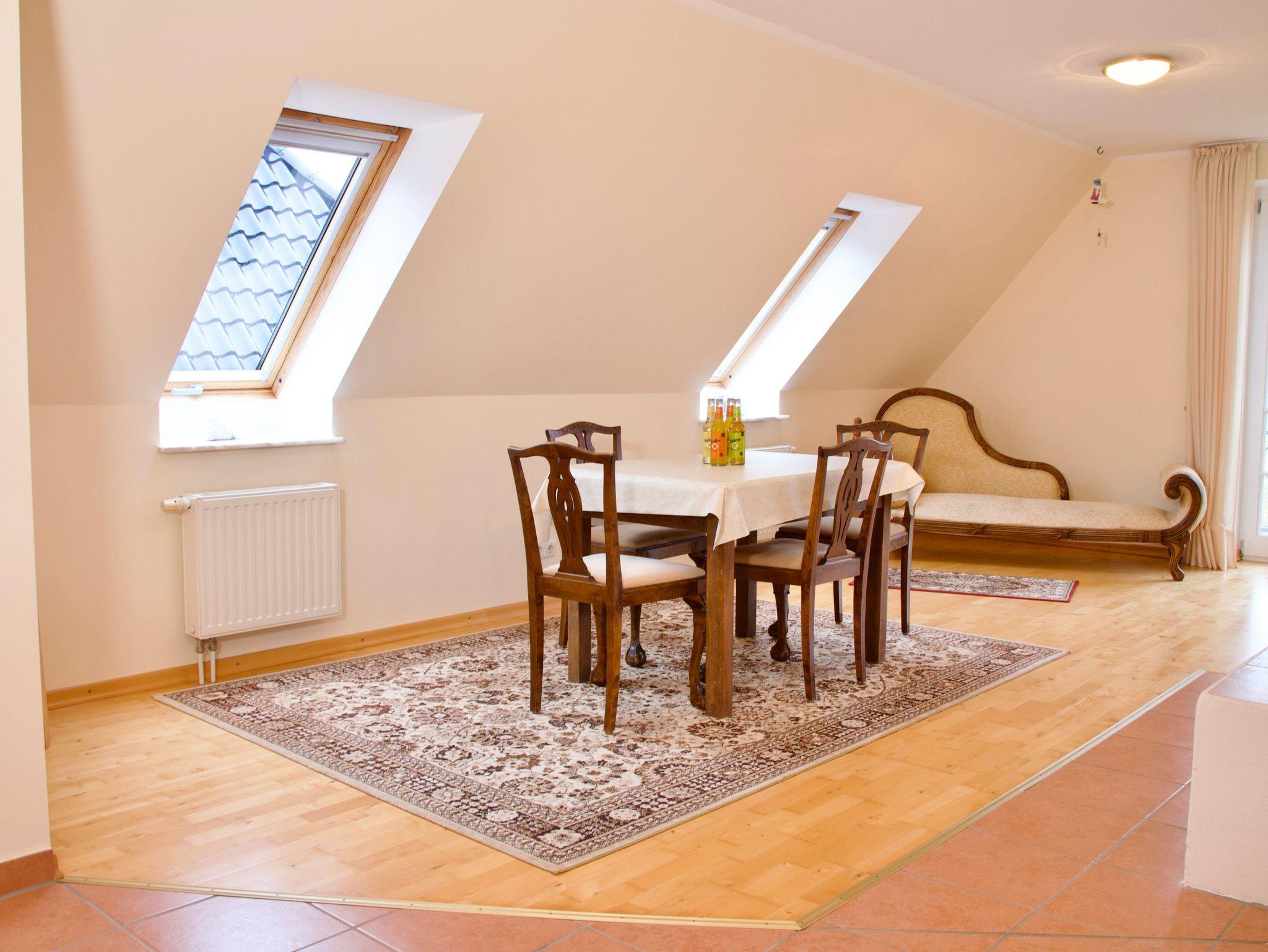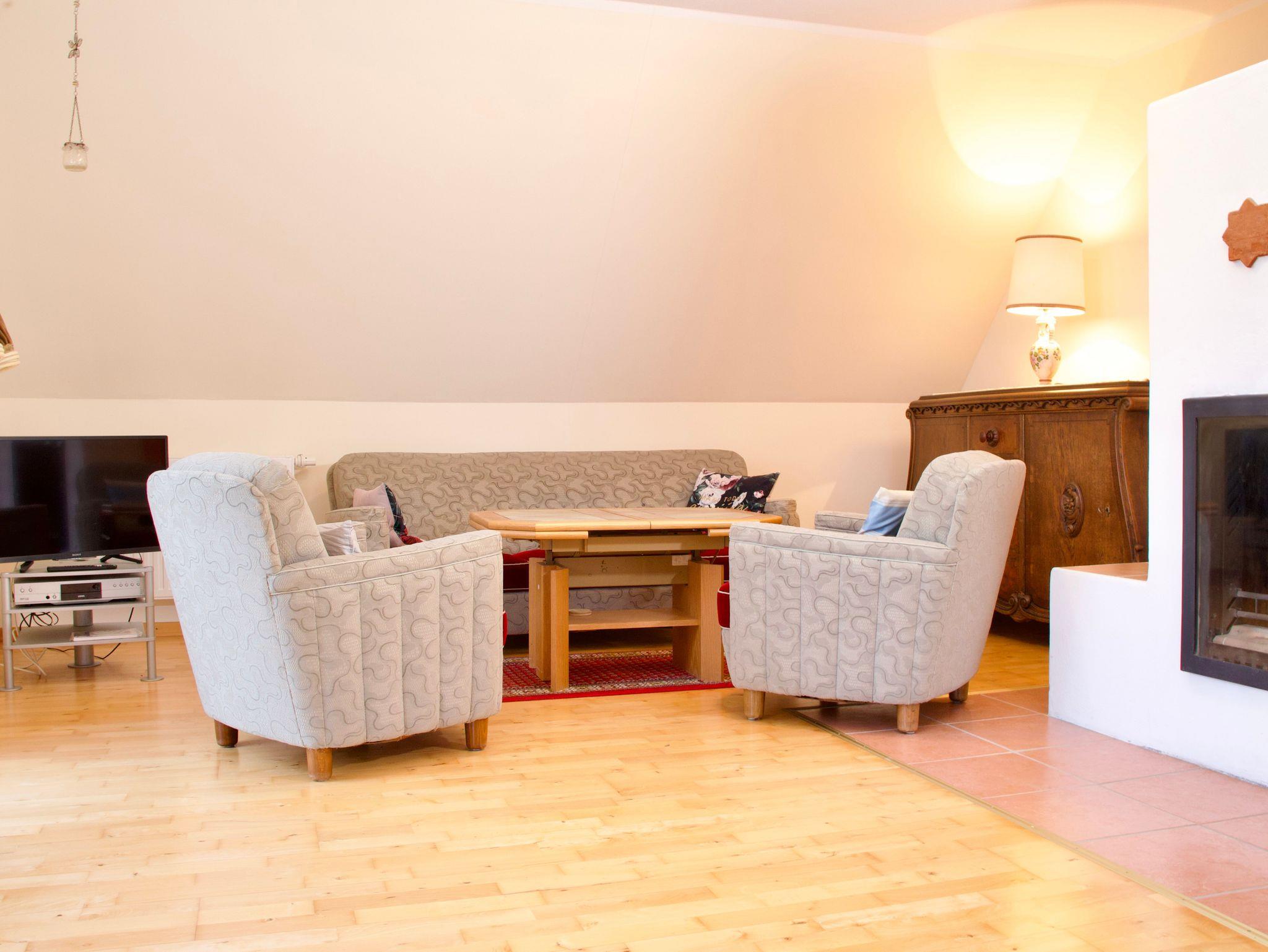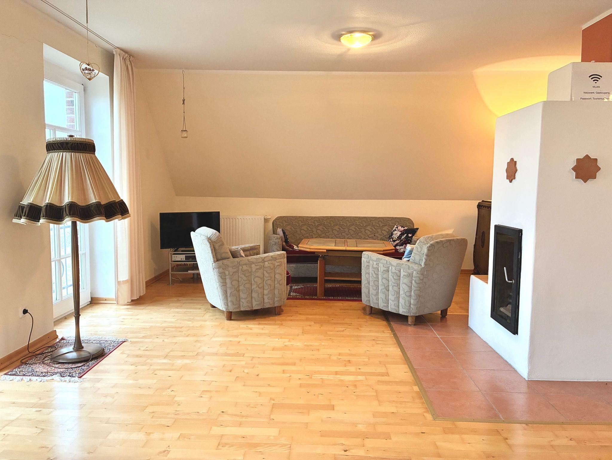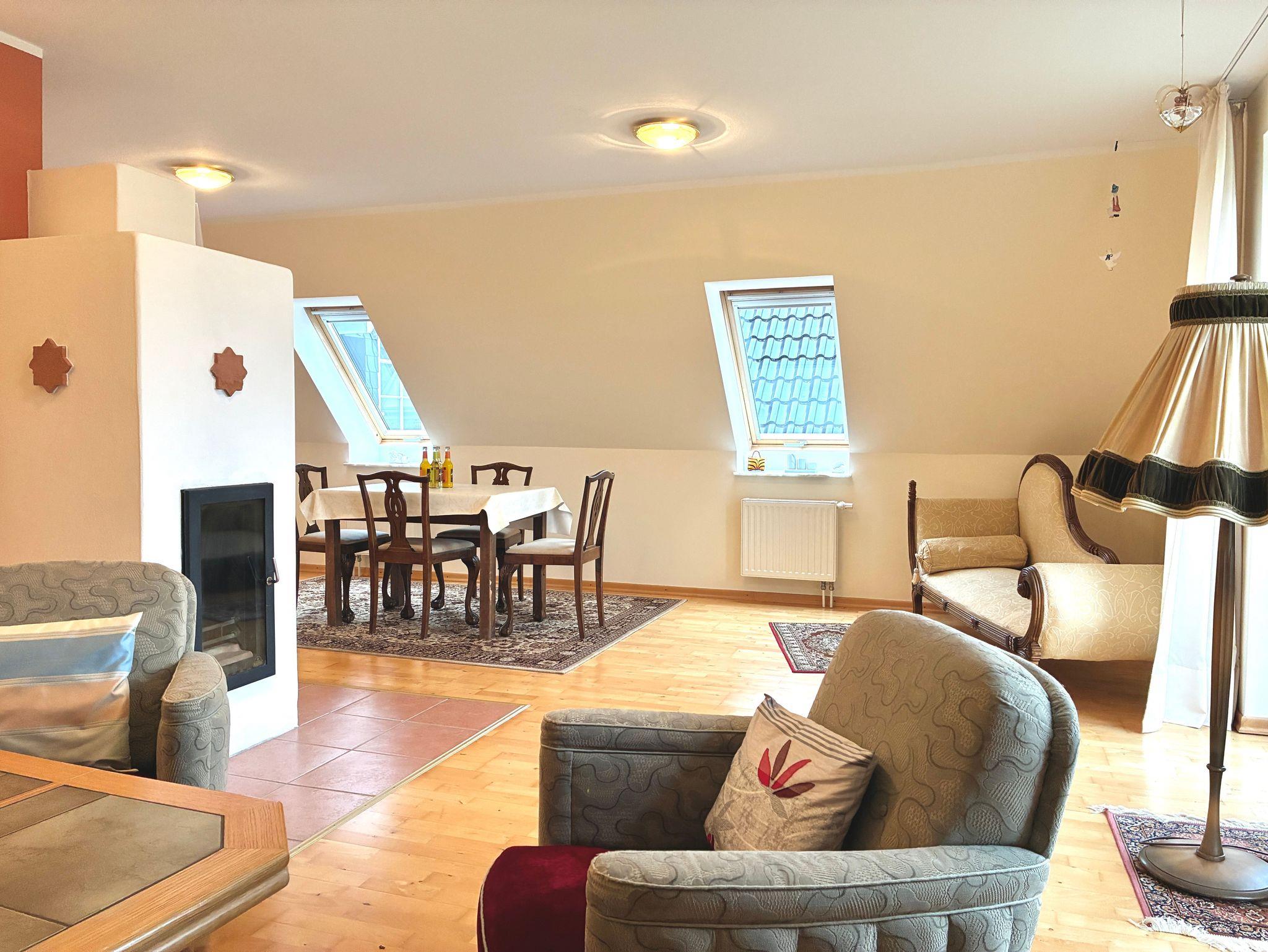 Herzstück der Wohnung ist das große Wohnzimmer. Eine gemütliche Sitzecke, der Kamin sowie der Esstisch bilden einen offenen Wohnbereich mit viel Platz für gemeinsame Zeit. Der Blick aus dem Wohnzimmer reicht über die weite Landschaft und unterstreicht das Gefühl von Freiheit und Entschleunigung. Besonders an kühleren Tagen sorgt der Kamin für eine behagliche Atmosphäre.