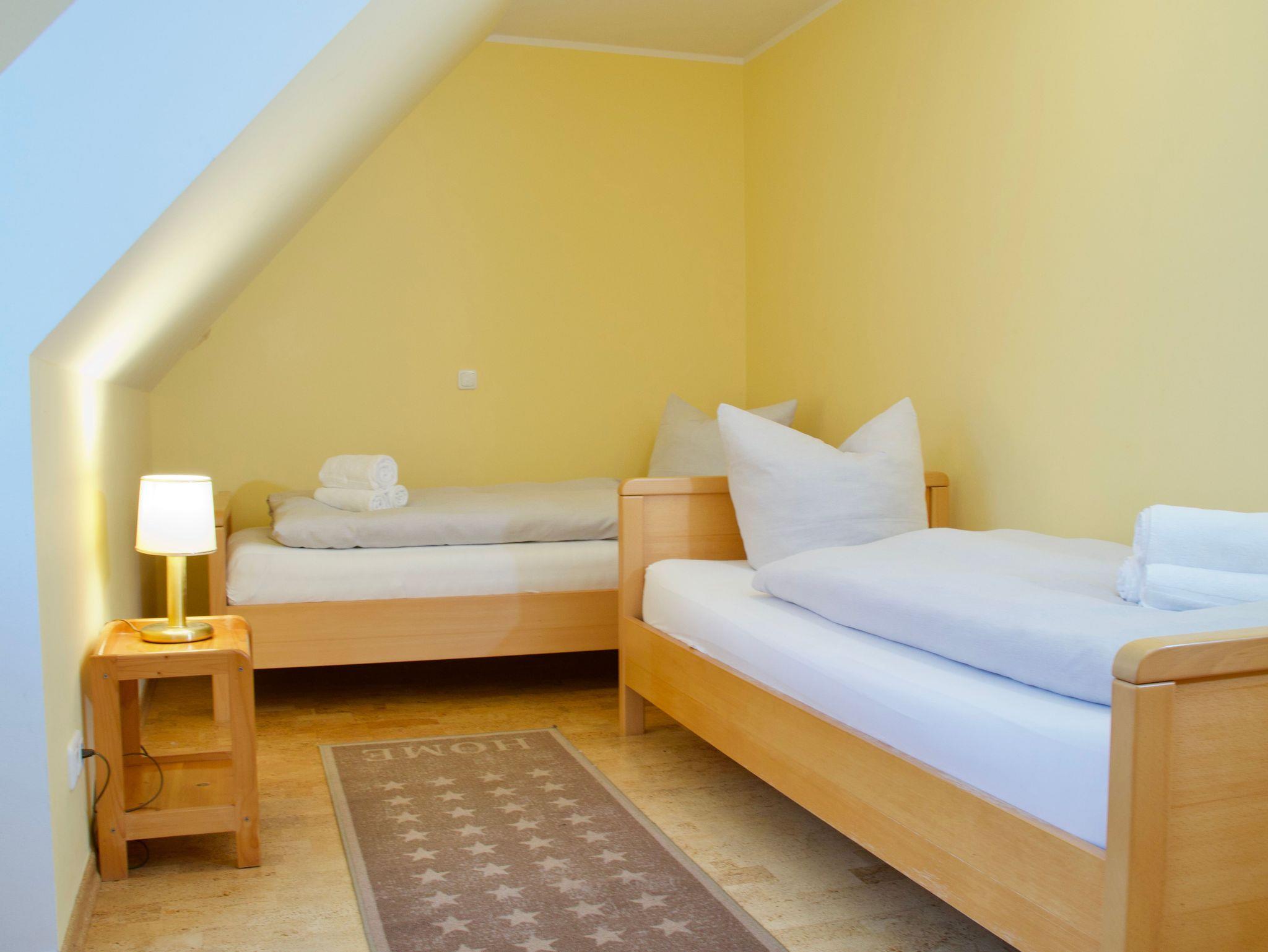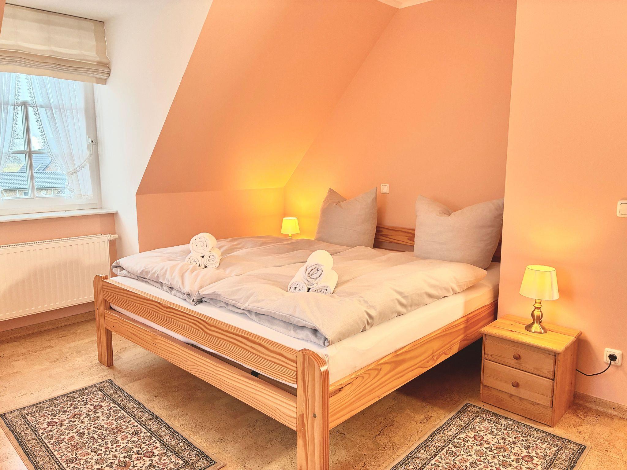 Die Wohnung verfügt über zwei Schlafzimmer, eines mit einem Doppelbett, das andere mit zwei Einzelbetten. Beide Räume sind klar gestaltet, hell gehalten und in warmen Tönen eingerichtet. Sie strahlen Ruhe aus und bieten angenehme Rückzugsorte für erholsame Nächte.