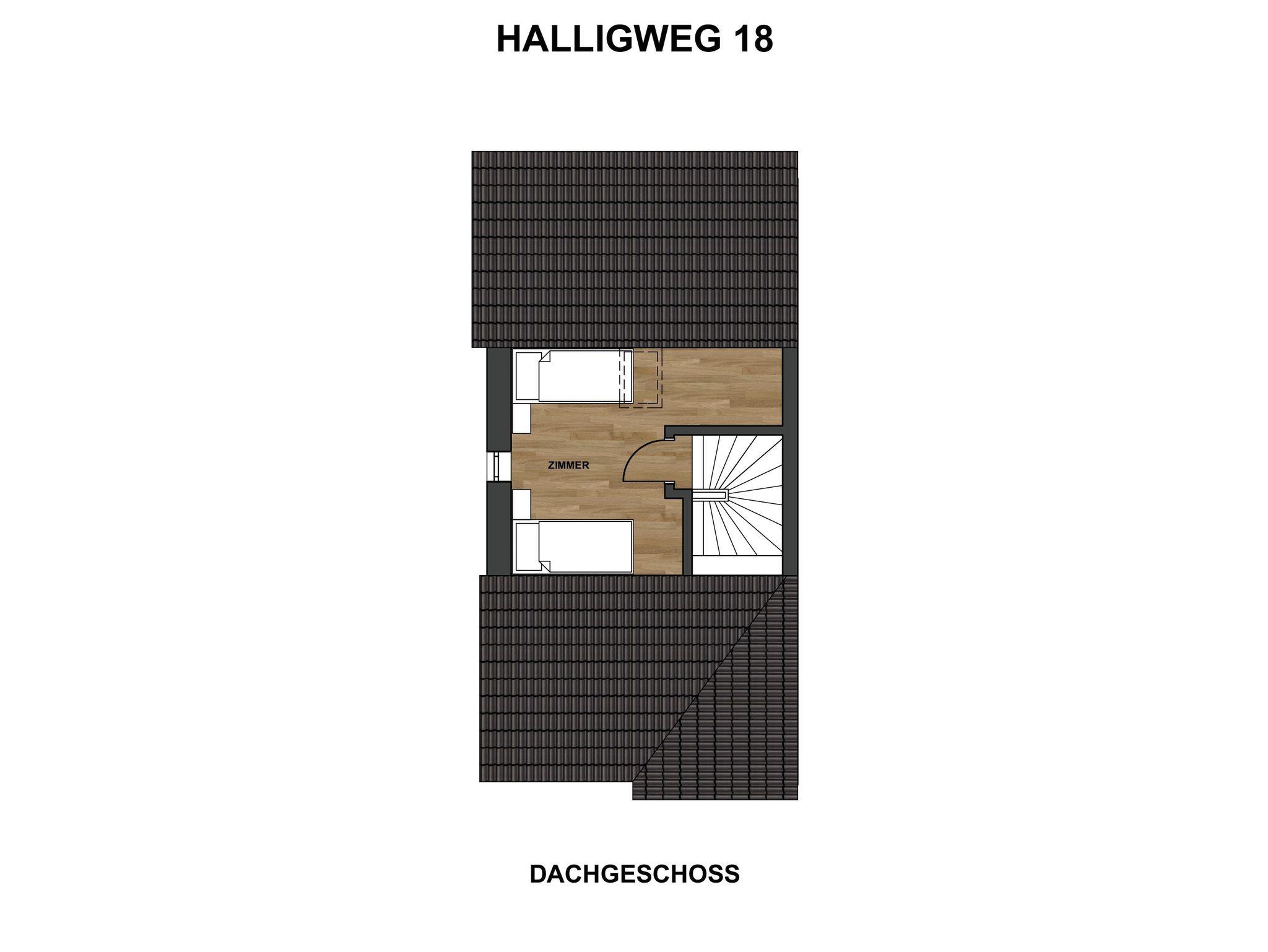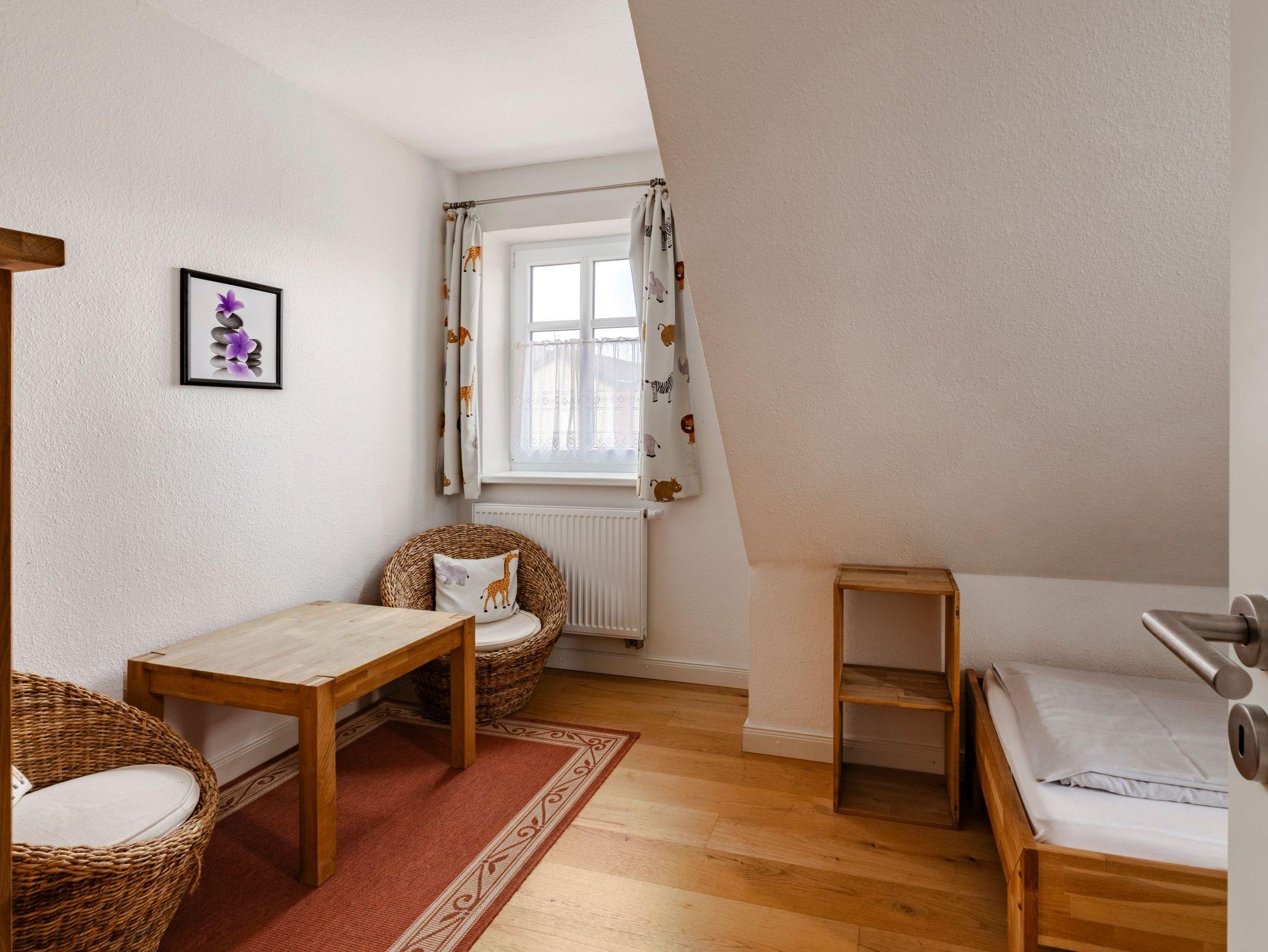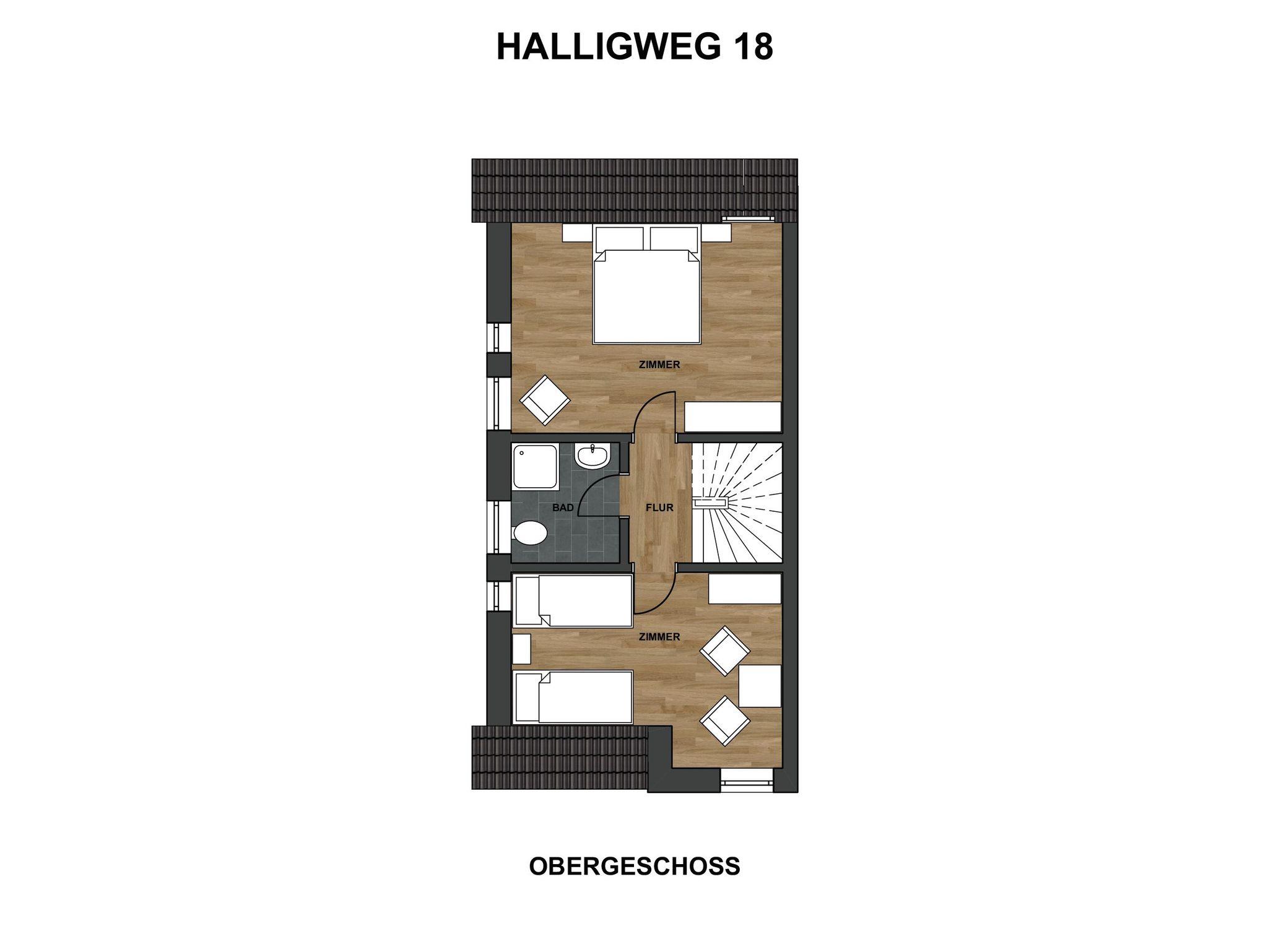 Im 1. Obergeschoss befinden sich zwei Schlafzimmer ? eines mit Doppelbett und eines mit zwei Einzelbetten ? sowie ein Badezimmer mit Dusche und WC. Ein weiteres Schlafzimmer mit zwei Einzelbetten liegt im ausgebauten Giebelzimmer im Dachgeschoss.