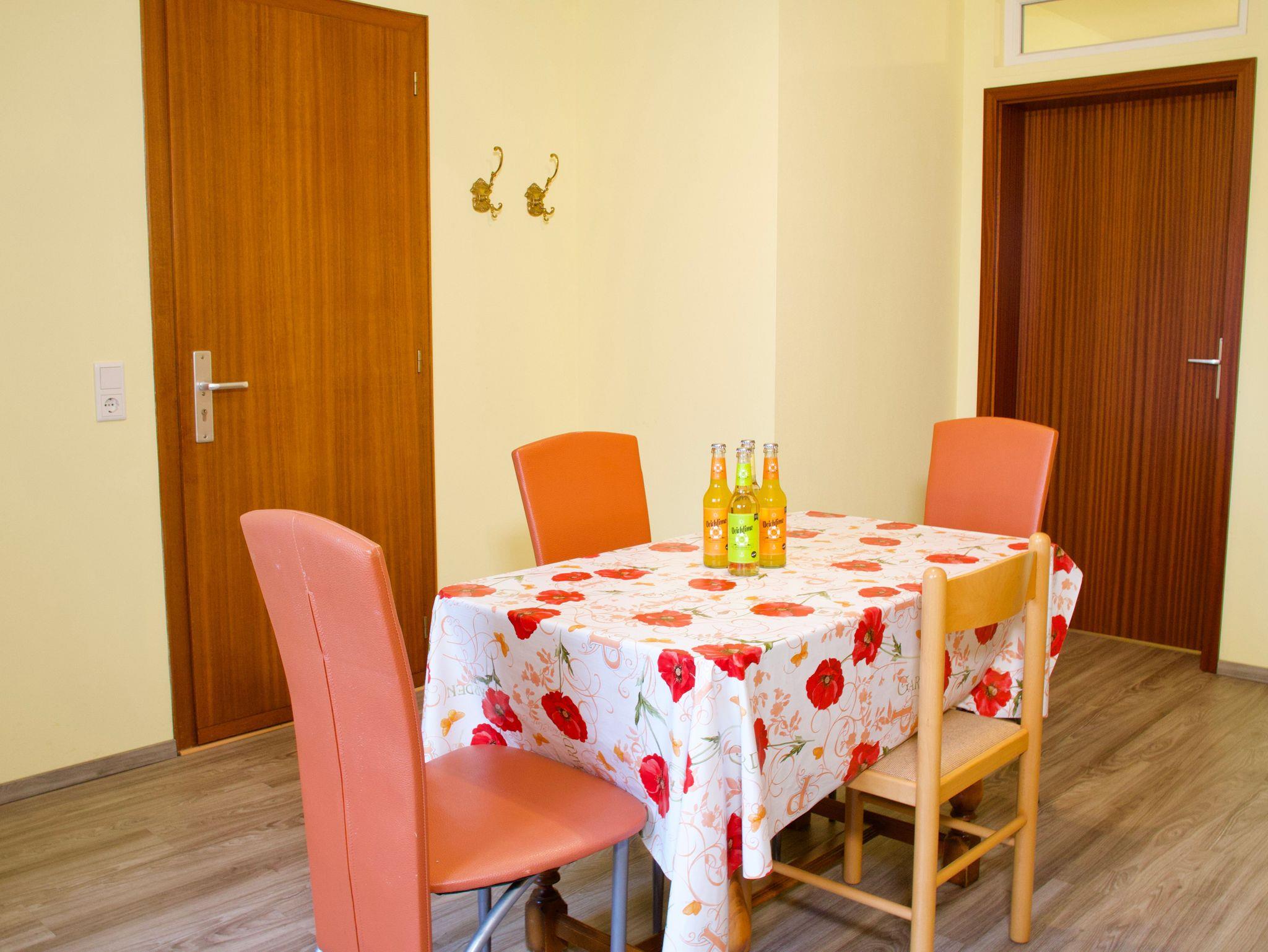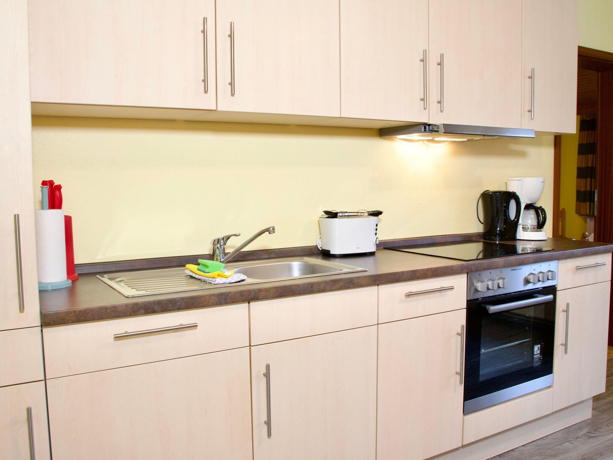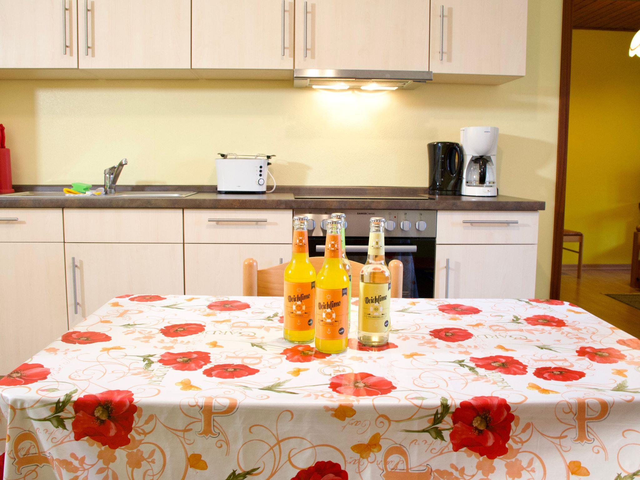 Die Küche bildet einen zentralen Bereich der Wohnung. Sie ist hell gestaltet, lässt keine Wünsche offen und verfügt über einen Esstisch, der sich ideal für gemeinsame Mahlzeiten oder ausgedehnte Spieleabende eignet. Ein Geschirrspüler, eine Kaffeemaschine sowie eine Gefriermöglichkeit stehen für die Selbstversorgung im Urlaub bereit. Ein großes Fenster sorgt für viel Tageslicht und unterstreicht die freundliche Wirkung des Raumes.