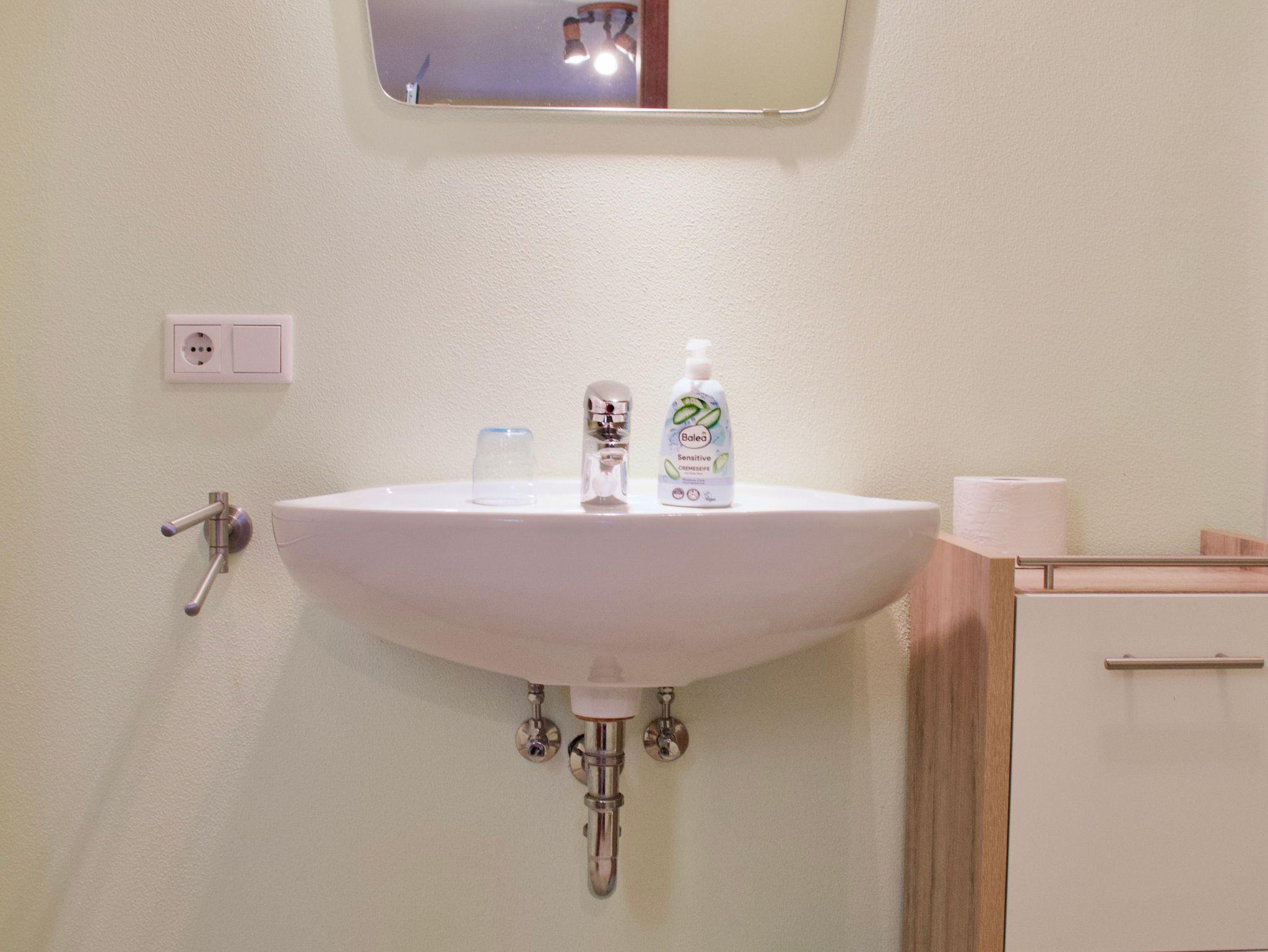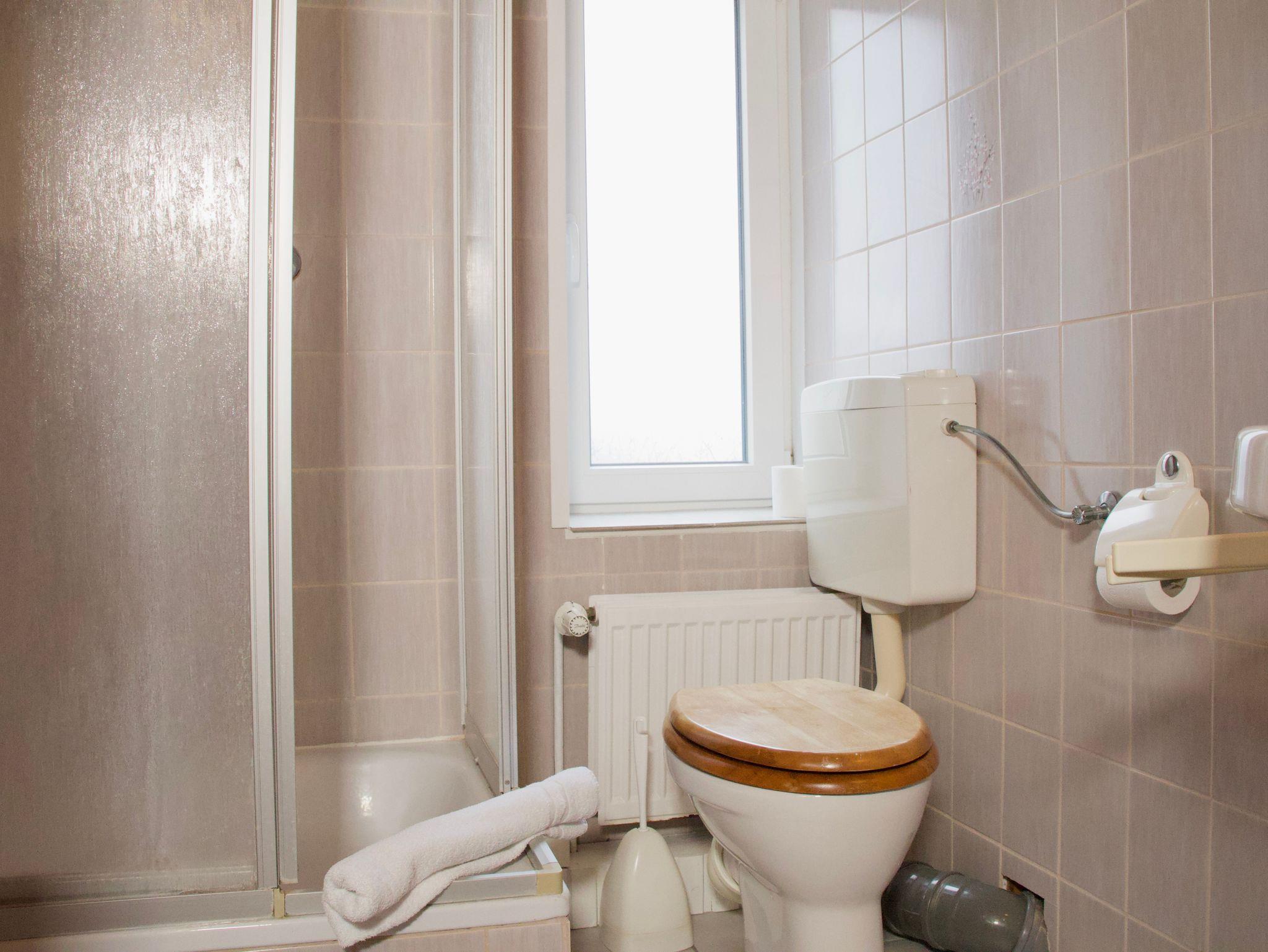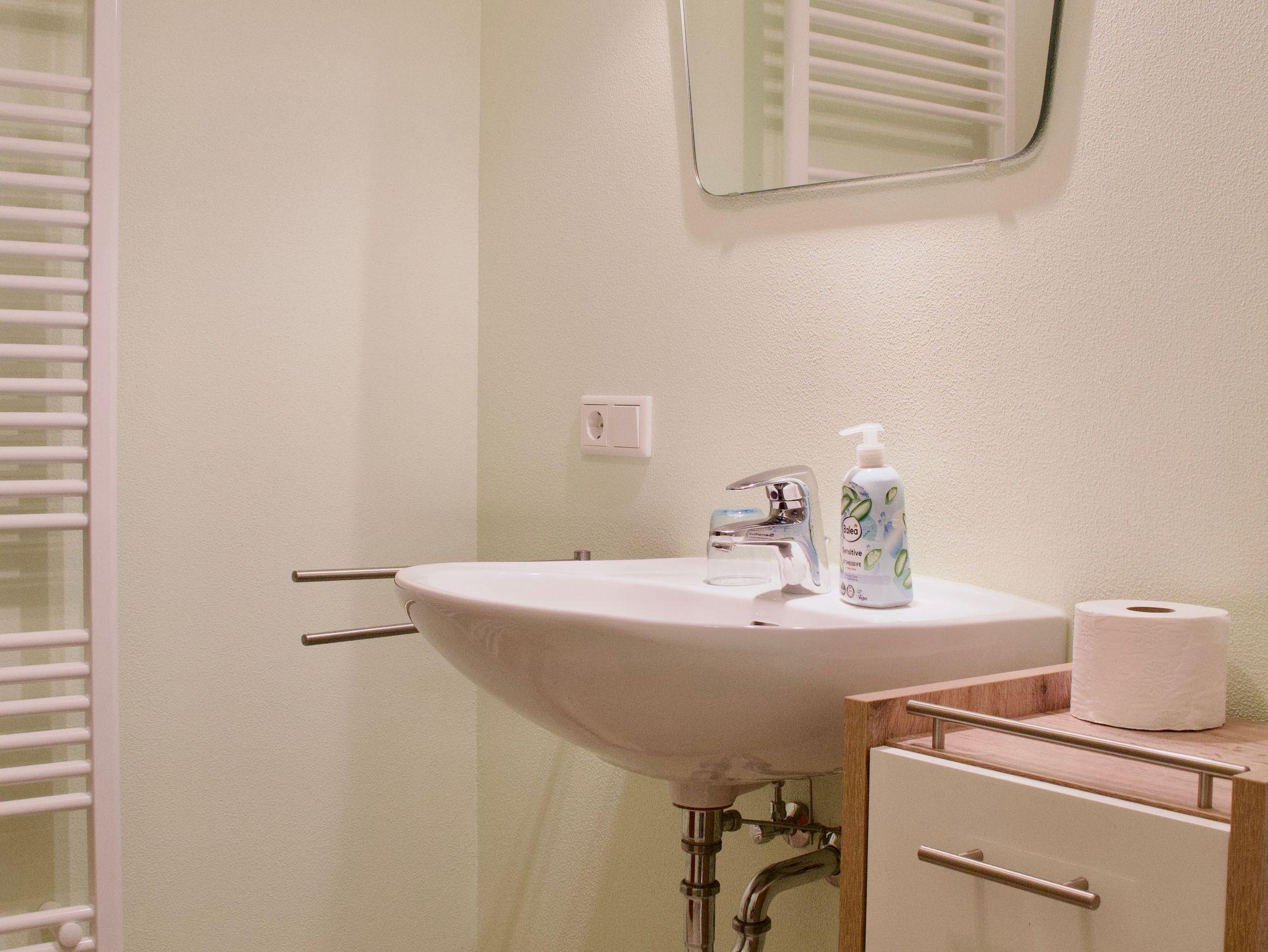 Das frisch renovierte Duschbad ist in ruhigen, natürlichen Farbtönen gehalten und mit einer Handtuchheizung ausgestattet.